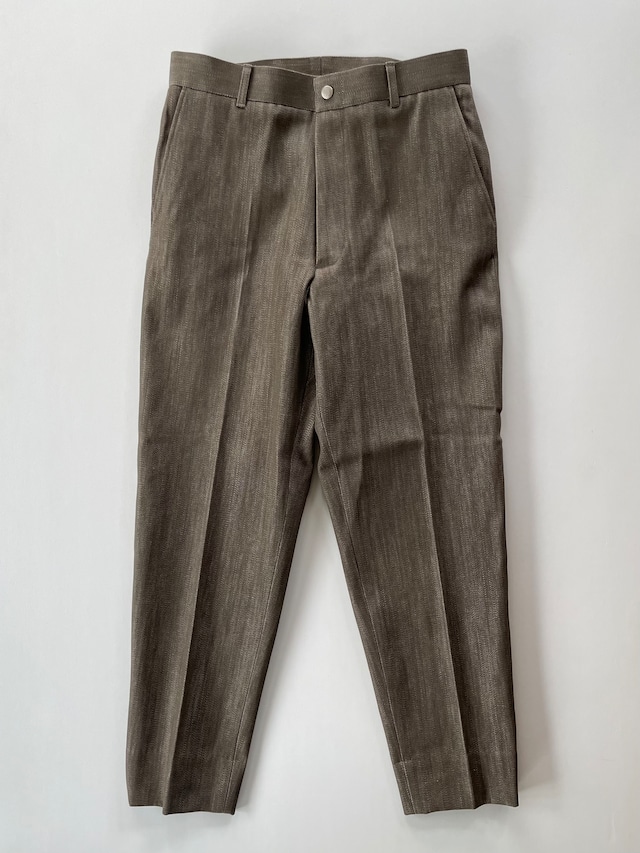 P-016 ・P-032とセットアップになります♡ dead stock fabric : 12oz BROWN-denim COTTON 100% limited 37 size : 0,1,2 0 ウエスト82cm ワタリ30cm 裾幅17cm 股上31cm 股下72cm 1 ウエスト84cm ワタリ30.5cm 裾幅18cm 股下31.5cm 股下72cm 2 ウエスト88cm ワタリ31cm 裾幅19cm 股上32cm 股下72cm スタッフ 身長187cm サイズ2着用 MADE IN JAPAN 【Willow Pants / ウィローパンツ】 独立して新たに沢山の景色や仲間に出会うことが出来ました。 僕は学校で言う休み時間が大好きです。 人が好きです。 改めてそんな事を思いながらWillow Pantsというパンツに特化したレーベルを立ち上げました。 僕が大好きなSANFRANCISCOの町並みには、Willow(柳の木)が点在しています。 後に思ったことですが、そんなWillowを眺めながら仲間と麦酒片手に微笑みあった事は良い思い出です。 そんな想いを込めてWillow Pantsと名付けました。 なんせアナログな人間です。 今の世の中について行く事が下手くそですが、自分が想う今を表現できればと想っています。 未来を生きる人には過去があり、過去の教訓を生かす。