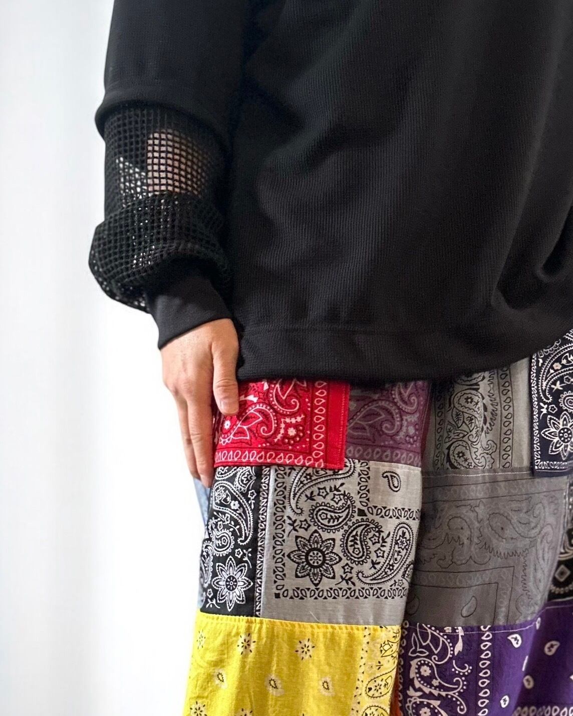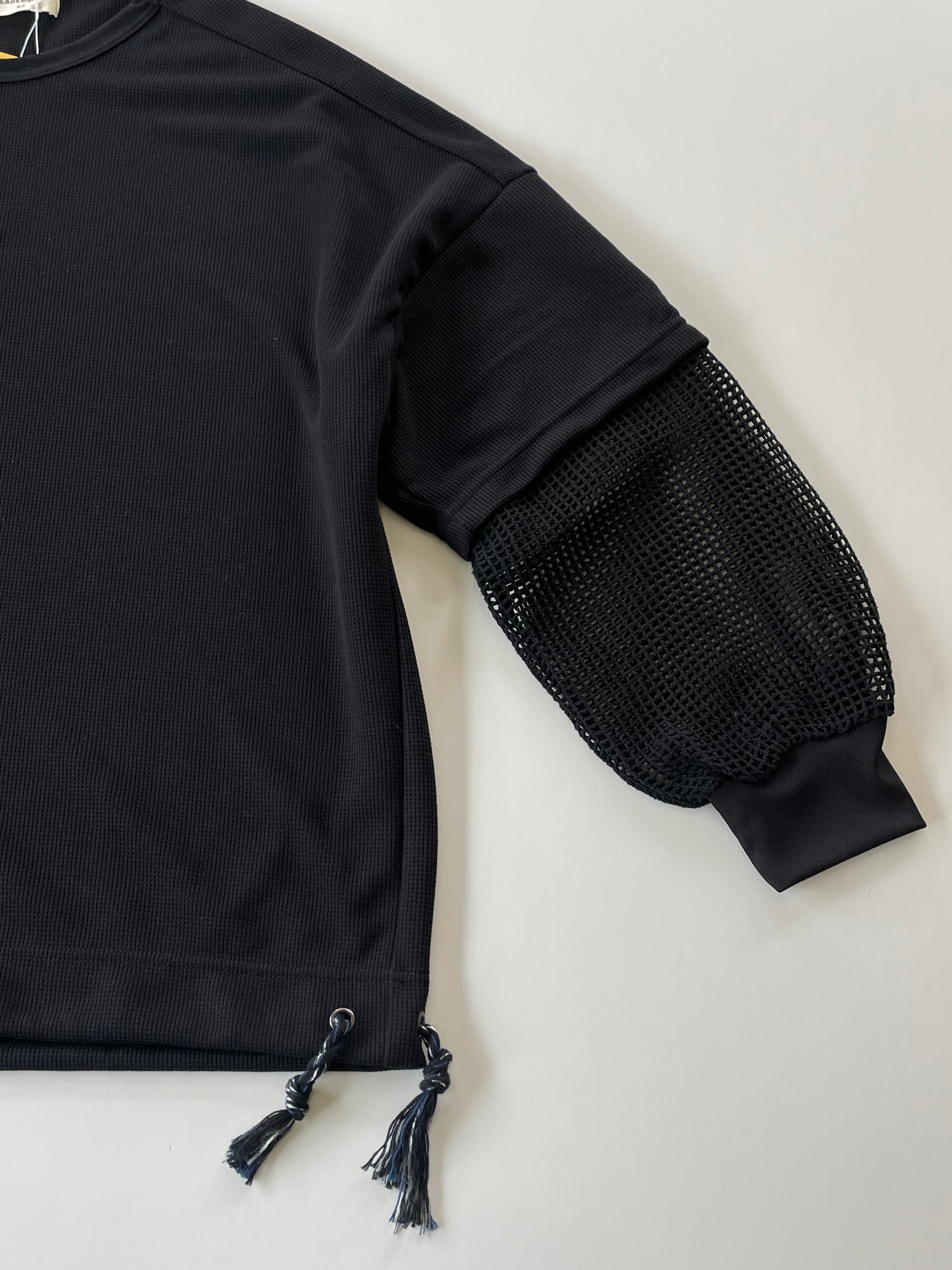 コットン見えするポリエステル素材のワッフルを使用したカットソー。コットン素材に比べ、型崩れしにくく速乾性もあります。袖部分は2重構造で、コットンのメッシュ素材を使用し、涼しさと透け感によるお洒落を両立したデザイン。アクセントに袖口は光沢感のある蛍光リブ (黒は黒です) 仕様。また、裾には手編みのドローコードが入っており絞る事でシルエットを変化させる事が出来ます。