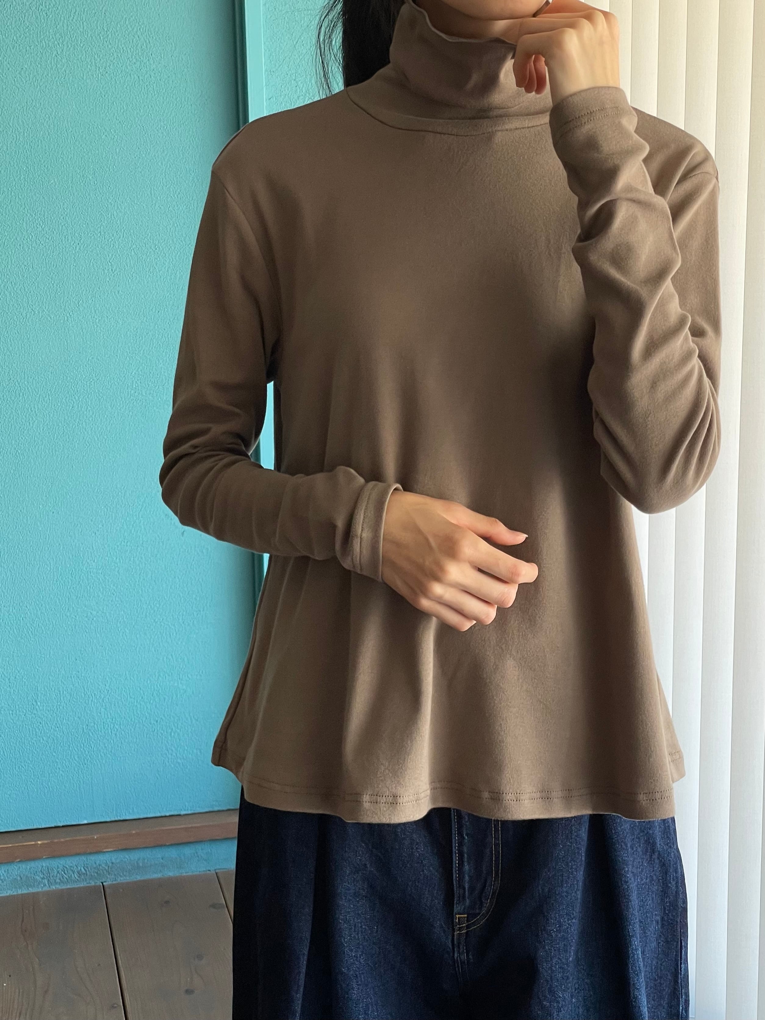 やや長めに仕立てたネックが首元をやさしく包み込むデザイン。くしゅっと寄る柔らかい表情がさりげないアクセントに。腕はすっきり細く、裾に向かってふんわりと広がるフォルム。身体のラインを拾いすぎず、品よくまとまるシルエットです。パンツにもスカートにも合わせやすく、レイヤードにも活躍。秋冬の装いにすっとなじむ、落ち着いたカラーバリエーションも魅力です。
