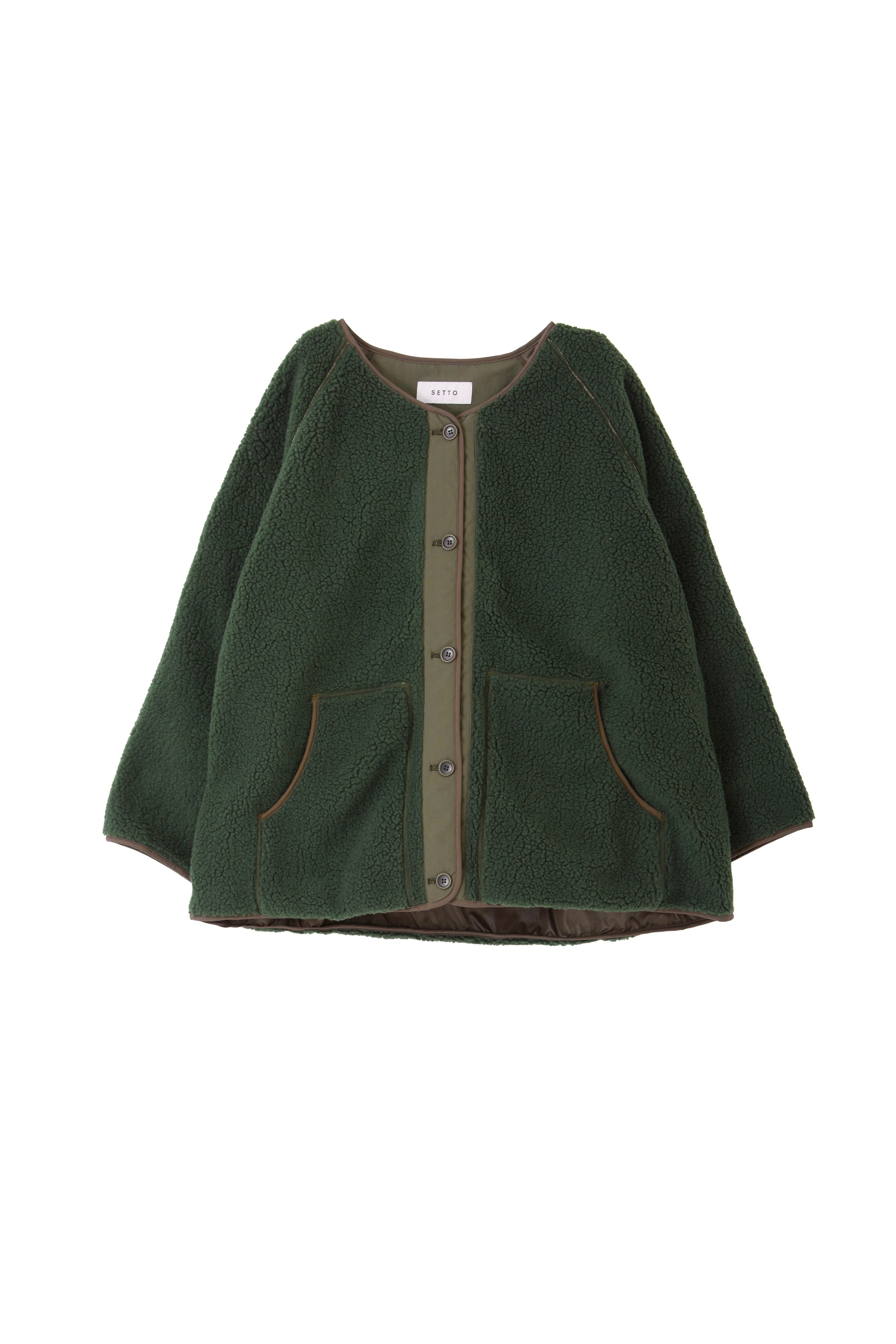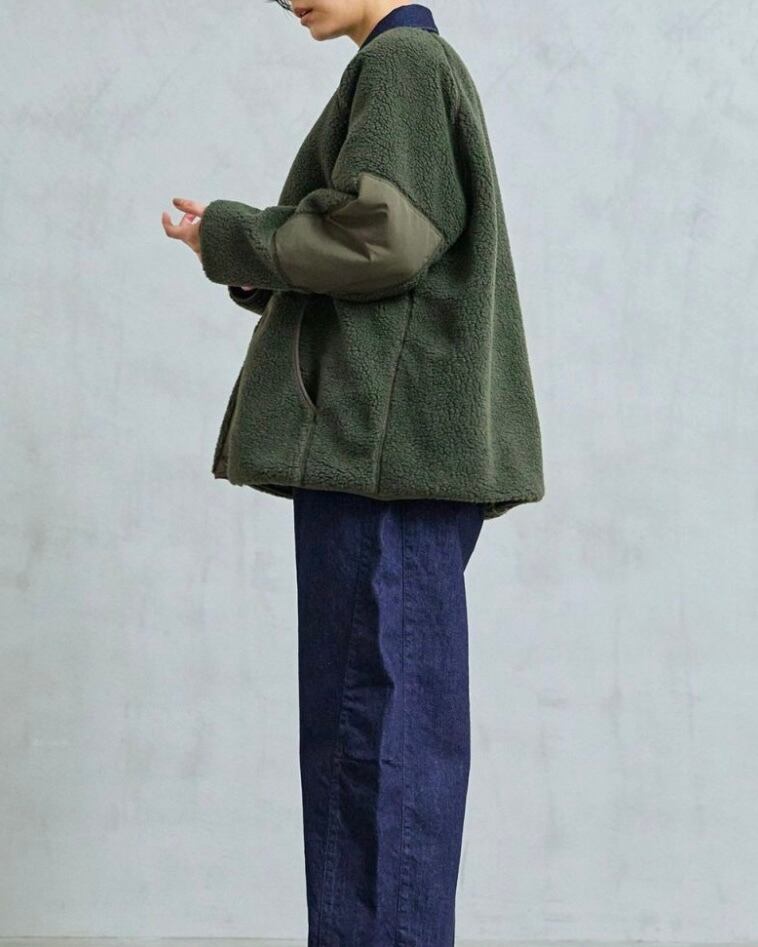 ふくらみとボリュームのあるボアジャケット。がばっとラフに羽織れるリラックスシルエット。肘部分にナイロンのあて布をデザインとして入れることで、少し締まった印象に。ノーカラーなので合わせるインナーを選びません。