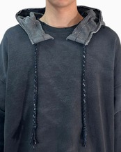 スウェットをバイオ加工+汚し加工+ダメージ加工したのちパーカーを後付けした「現代版後付けパーカー」です。よりVINTAGEの雰囲気に近づける為、様々な加工を施しているのですが、袖口にはVINTAGEには絶対に無い蛍光色のリブを付ける事で「心地良い違和感」を表現。masterkeyらしく「復刻」では無く「革新」にチャレンジしたアイテム。