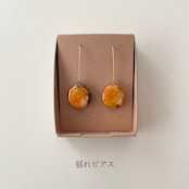 剪定や間引きによって出た天然木の端材に、鉱石等が原料の岩絵具で一点ずつ手描きで色を付け、仕上げに樹脂を施しています。側面は手を加えず、自然の風合いをそのままに。主素材が木なのでとても軽く、思わず付けているのを忘れてしまう程、耳によく馴染みます。