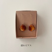 剪定や間引きによって出た天然木の端材に、鉱石等が原料の岩絵具で一点ずつ手描きで色を付け、仕上げに樹脂を施しています。側面は手を加えず、自然の風合いをそのままに。主素材が木なのでとても軽く、思わず付けているのを忘れてしまう程、耳によく馴染みます。
