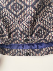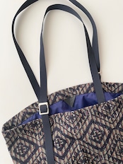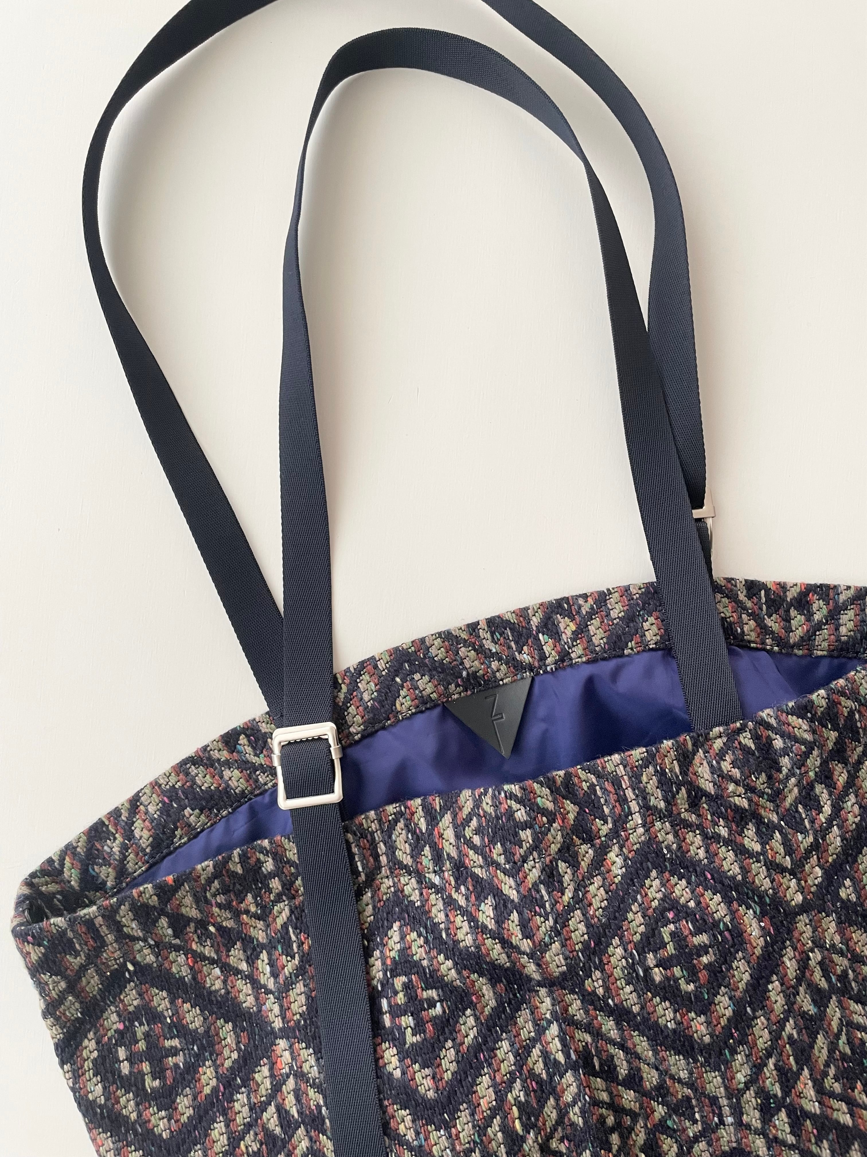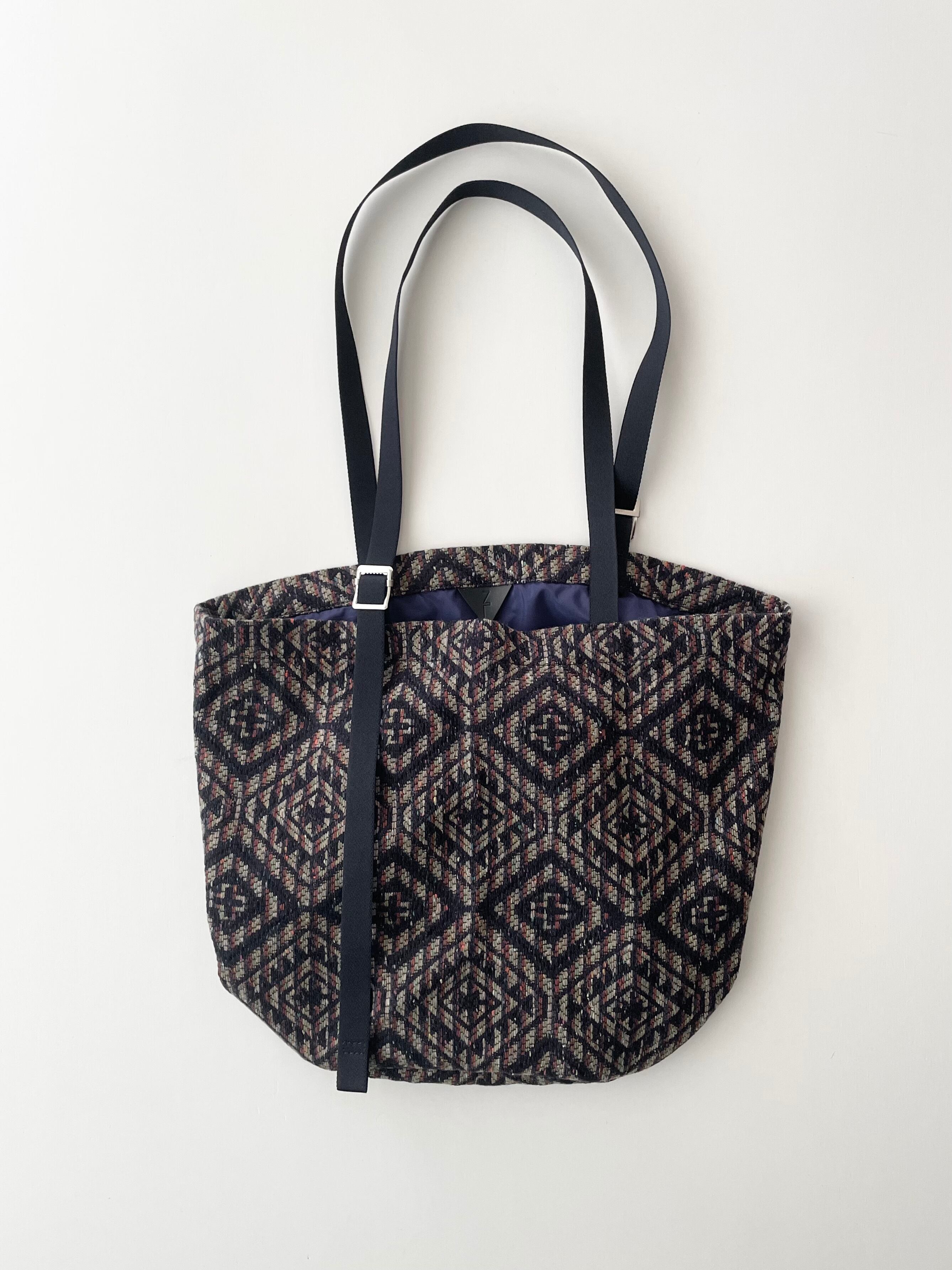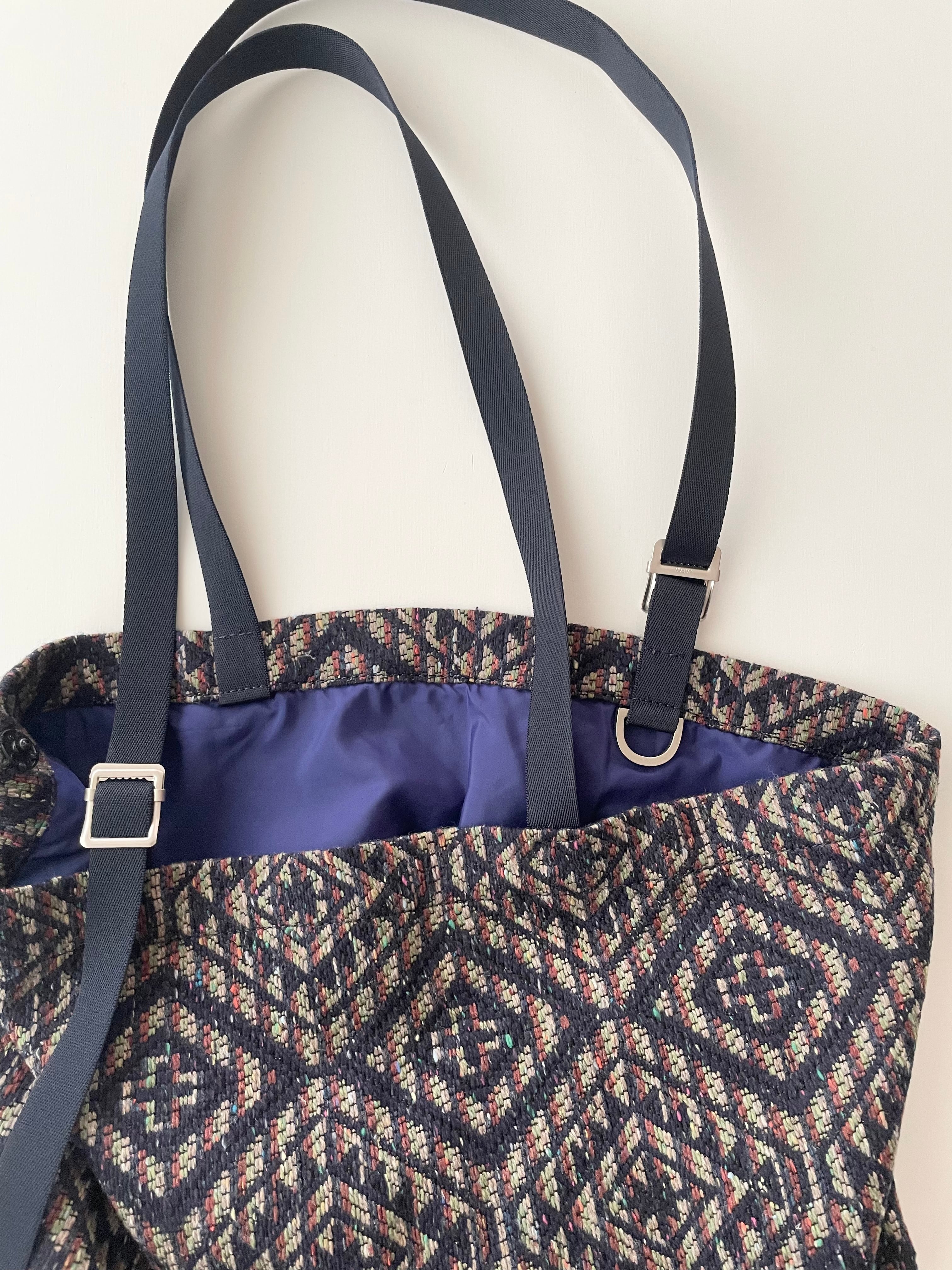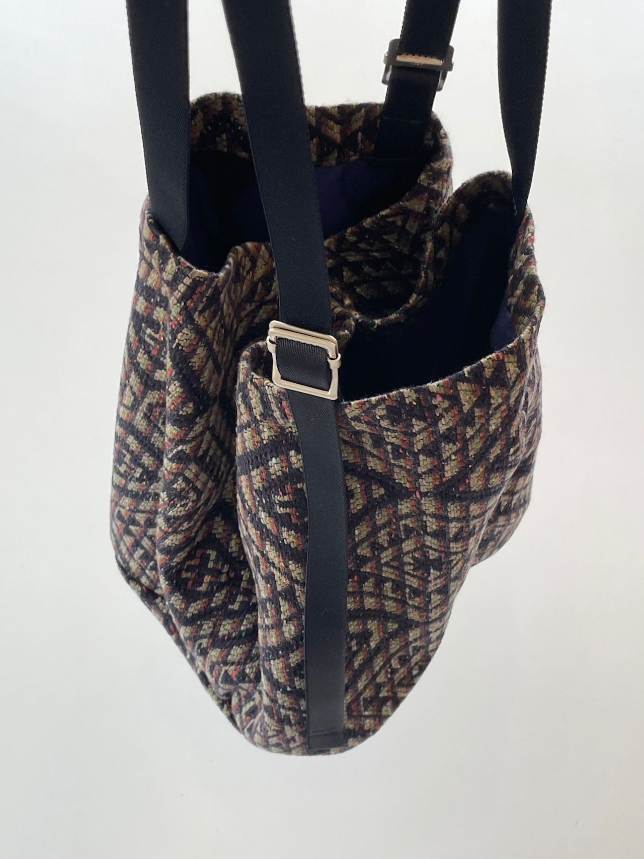 ストラップを調整し、手持ち、ショルダーとして使用可能。内側に△カン。サイドにはドイツ製ホック (Prym社) をつけ開閉することでBag本体の形を変えることが可能。本体はイタリア製のdead stockジャガード生地、裏地はナイロンリップストップ生地を使用。