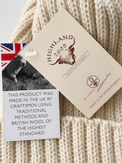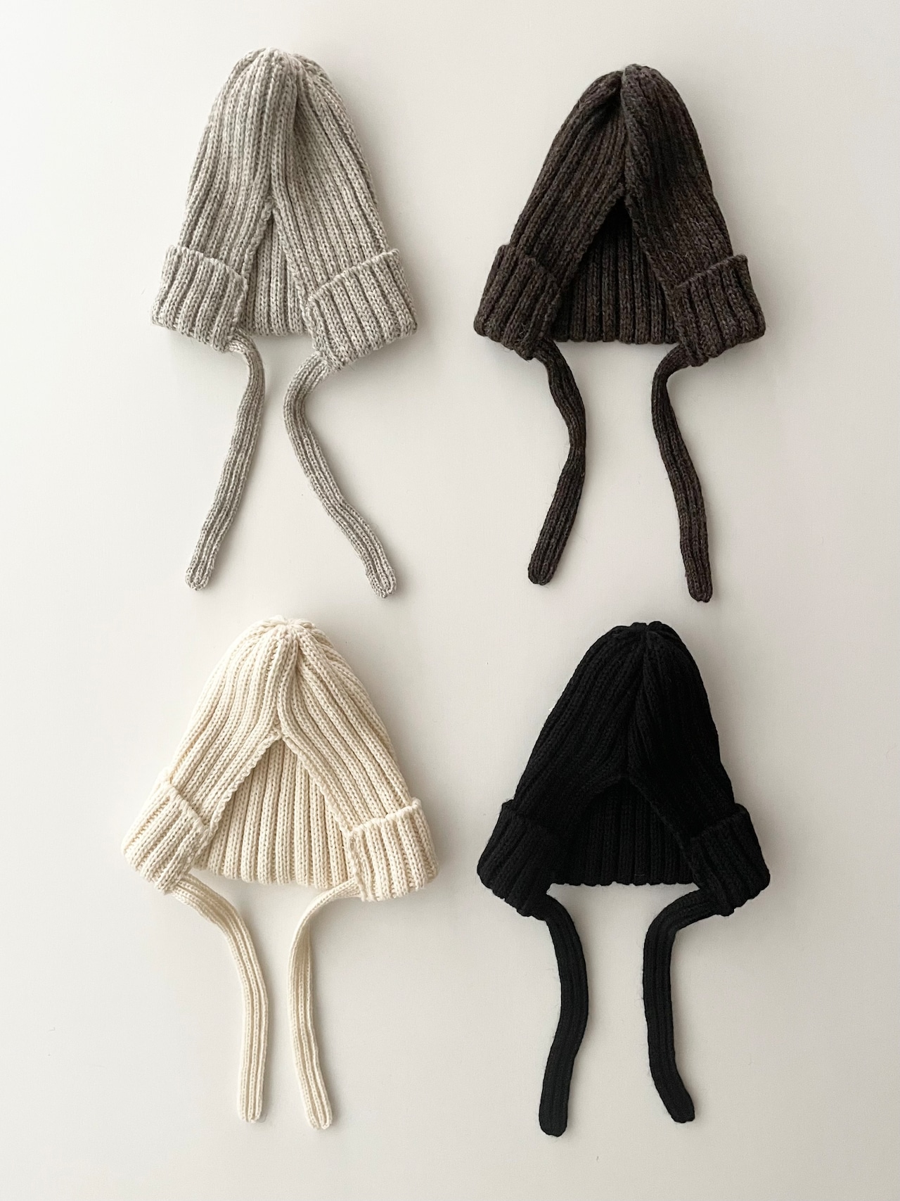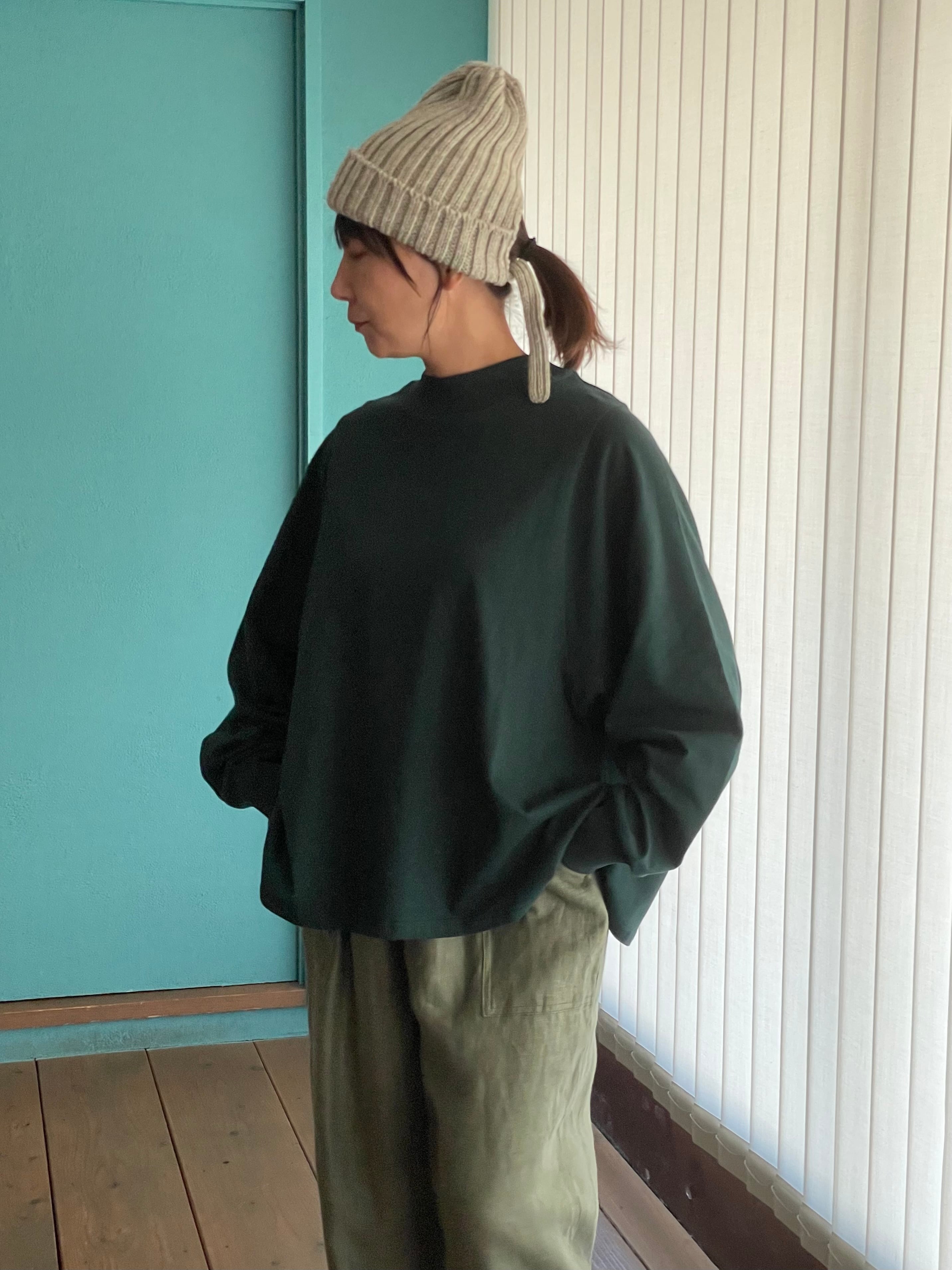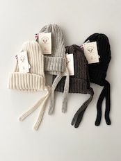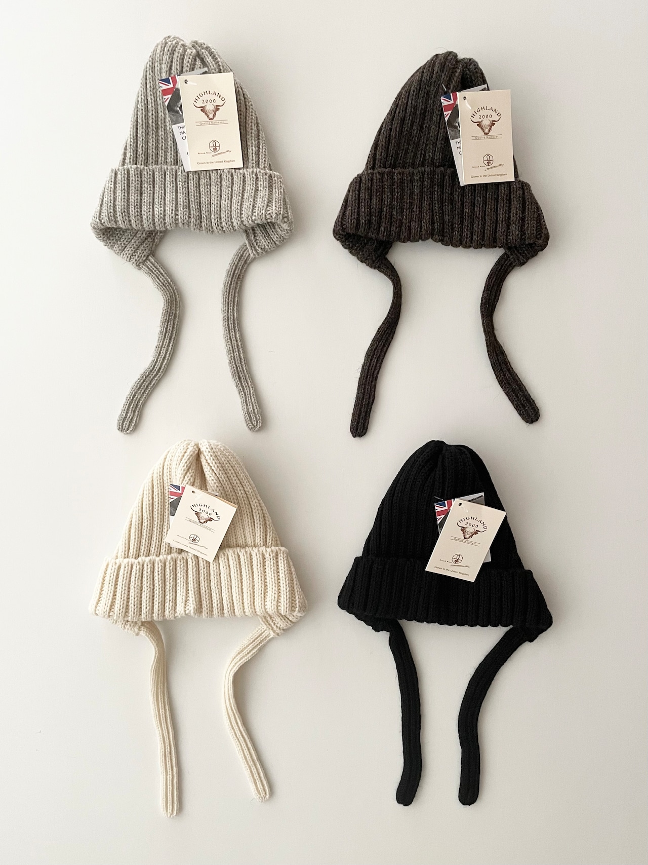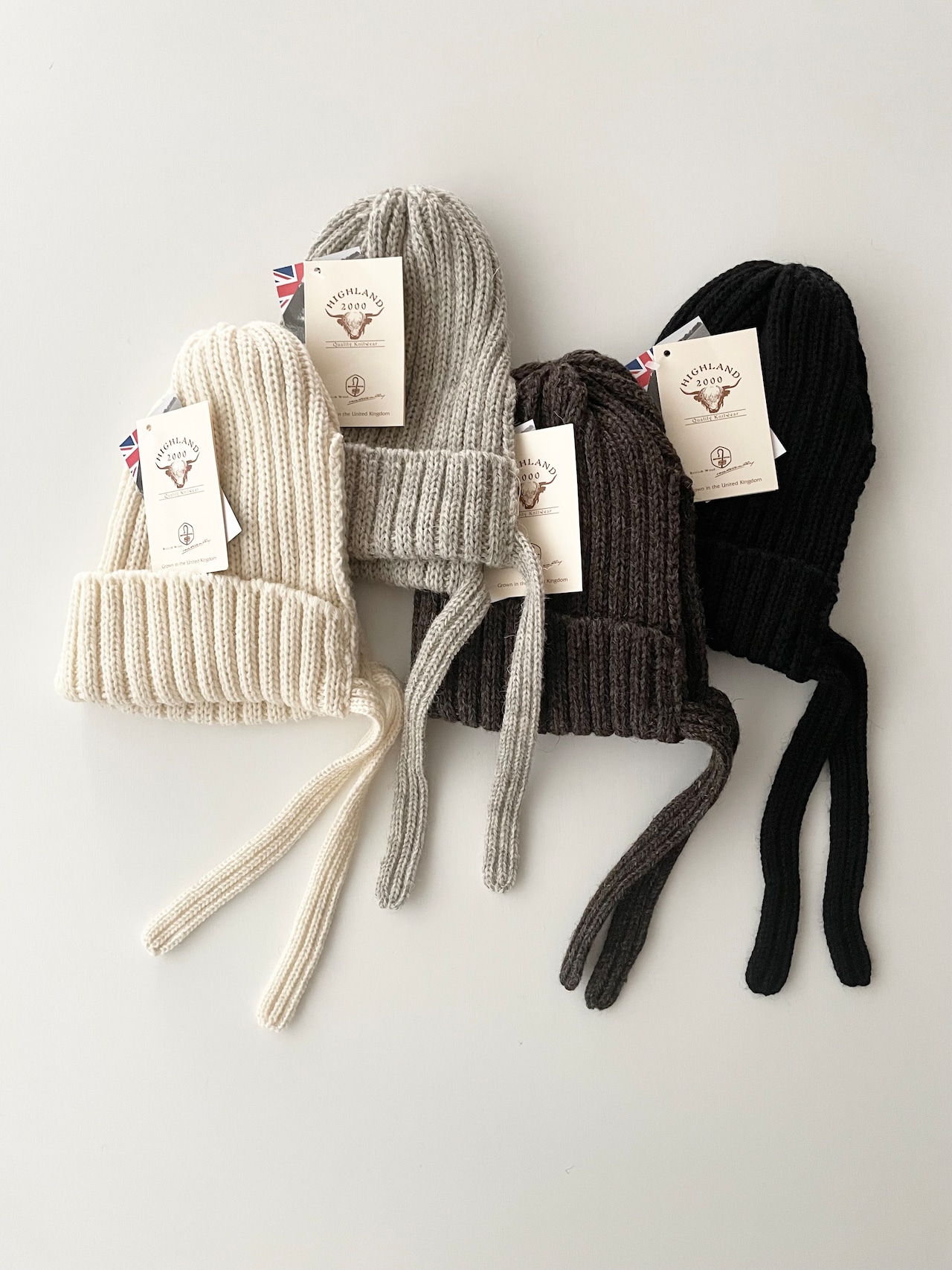 ハイランド定番のニット帽をアレンジ。後頭部に絞れるコードを配し、様々な被り方を提案。