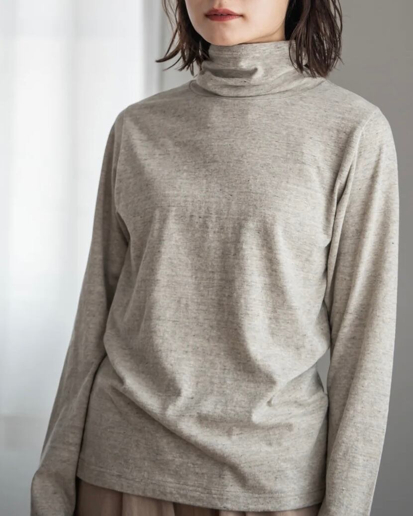 シンプルながらも永く愛される定番タートルネック。 環境にやさしい「エコリバイバル素材」を使用しており、紡績工程で余分として出る落ち綿を再利用してつくられています。通常であれば廃棄されてしまう綿を資源として活かすことで、サステナブルでありながらも自然なムラ感のある風合いが生まれ、ナチュラルな表情を楽しんでいただけます。薄手でやわらかな着心地は、秋口から春先までロングシーズン活躍してくれます。 一枚ではもちろん、ワンピースやベストのインナーとしても重宝する万能アイテムです。