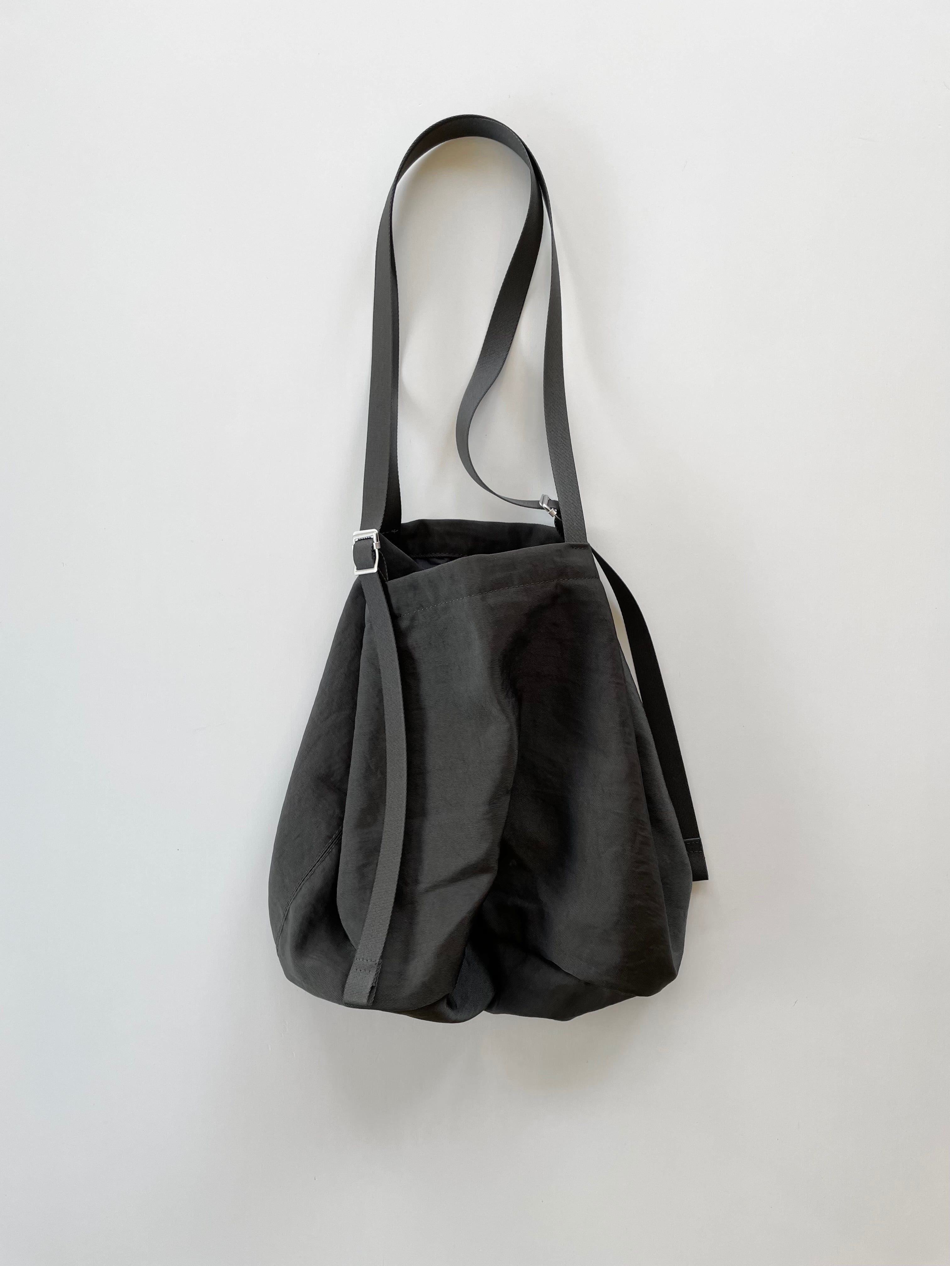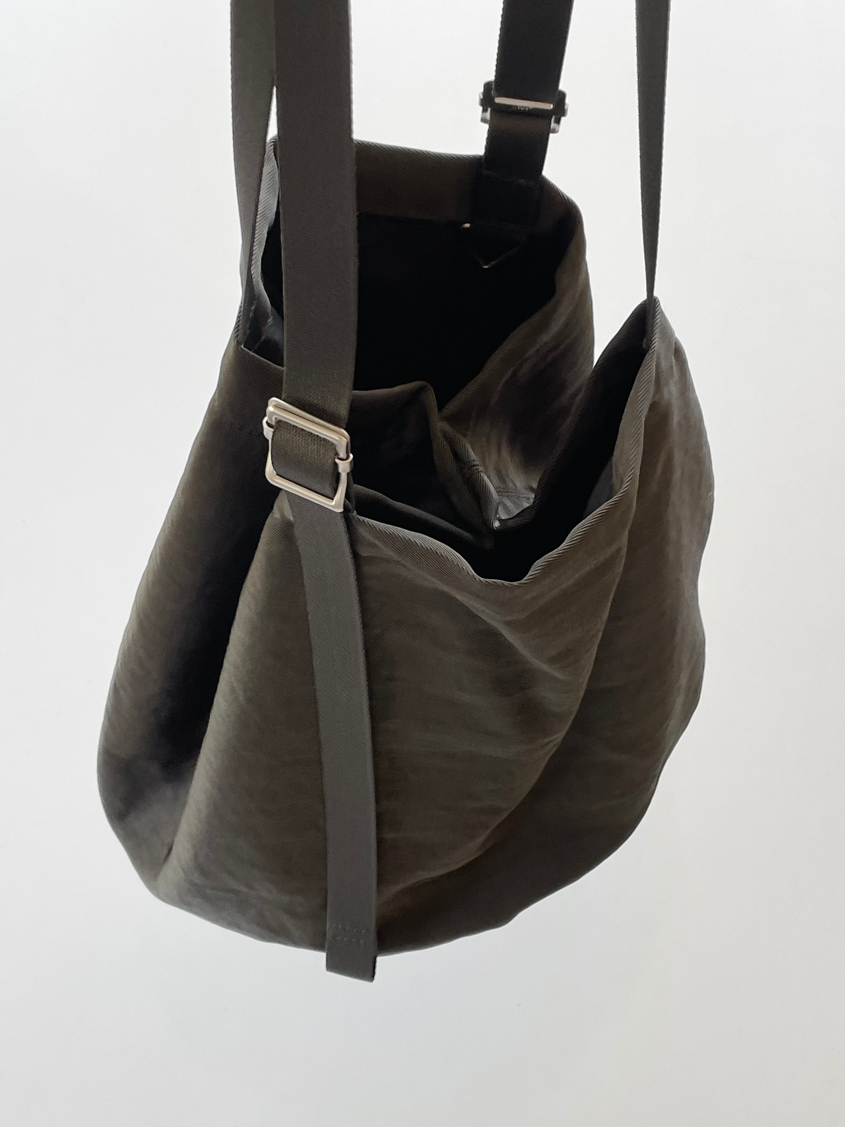 ストラップを調整し、手持ち、ショルダーとして使用可能。内側に△カン。サイドには磁石をつけ、開閉することでBag本体の形を変えることが可能。