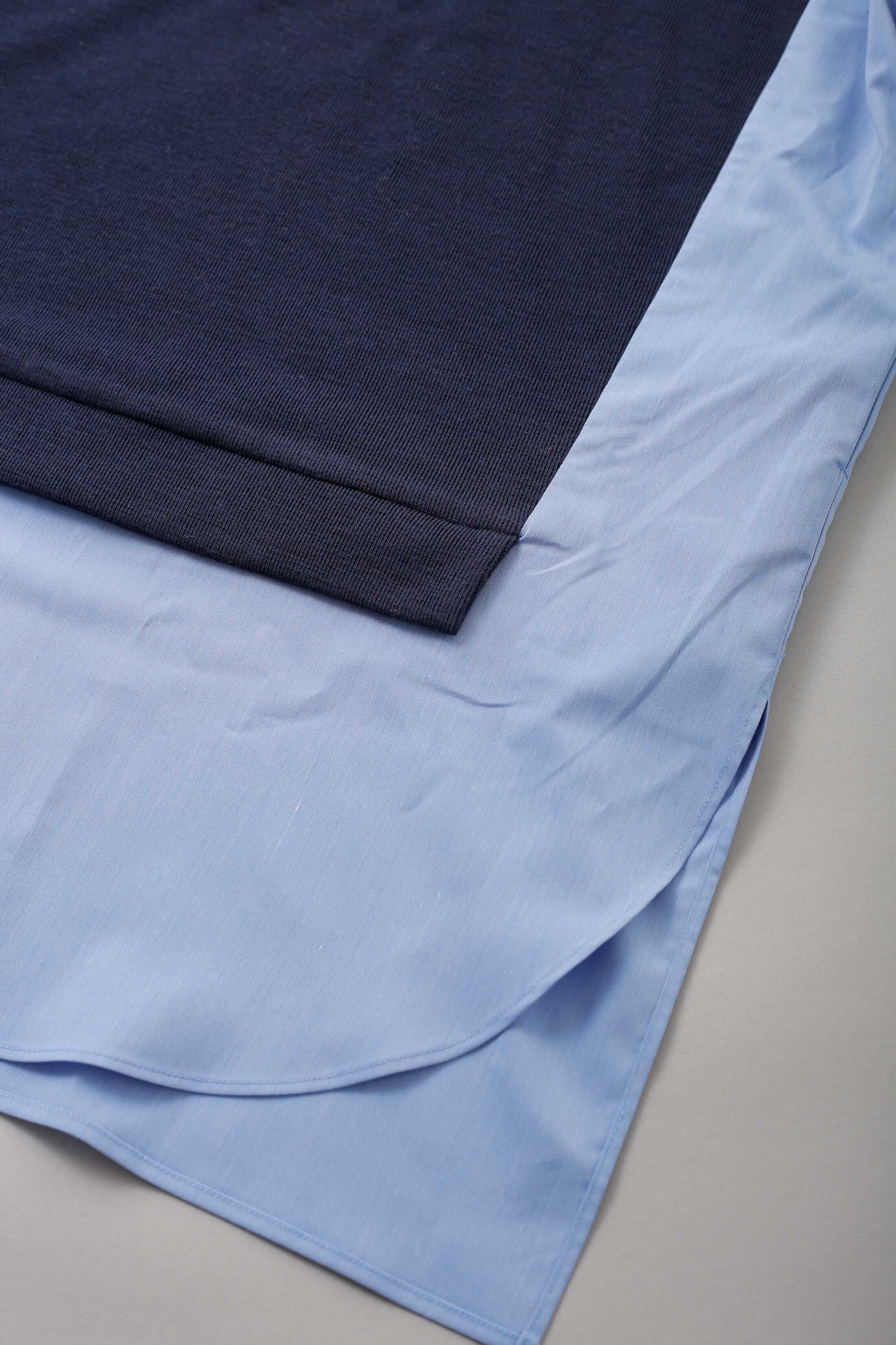 ソリッドな印象のニットとTR素材をコンビで配色したプルオーバートップスです。まるでシャツの上にベストを着ているようなデザインで、1枚でレイヤードが完成する嬉しいアイテム。ニットのモックネックは上品な印象で、シワになりにくいTRのシャツ素材がベストマッチ。チュニック丈に仕上げているので、ストレートシルエットのボトムスやロングスカート合わせも流行りのスタイリングです。