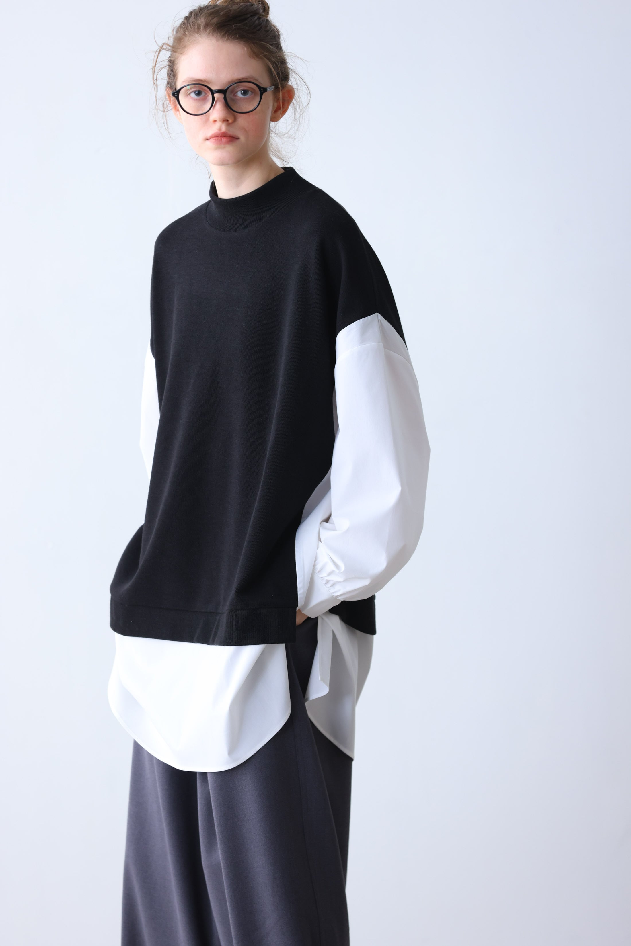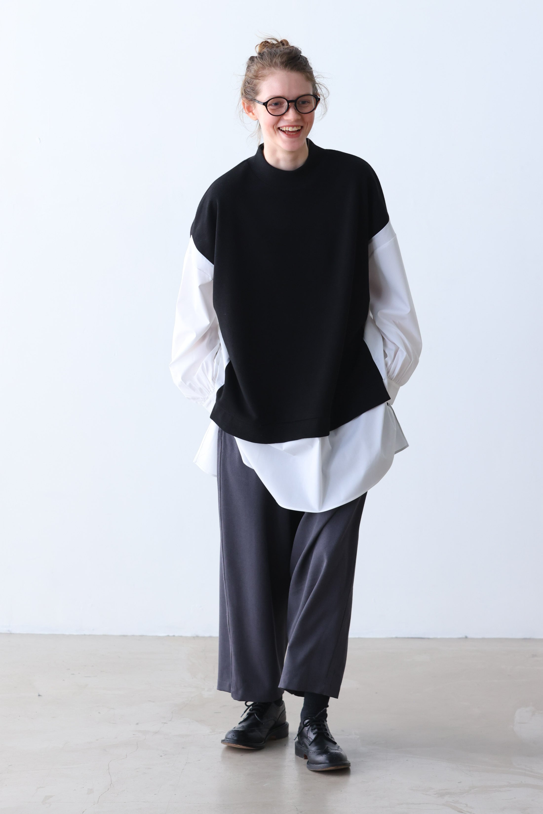 ソリッドな印象のニットとTR素材をコンビで配色したプルオーバートップスです。まるでシャツの上にベストを着ているようなデザインで、1枚でレイヤードが完成する嬉しいアイテム。ニットのモックネックは上品な印象で、シワになりにくいTRのシャツ素材がベストマッチ。チュニック丈に仕上げているので、ストレートシルエットのボトムスやロングスカート合わせも流行りのスタイリングです。