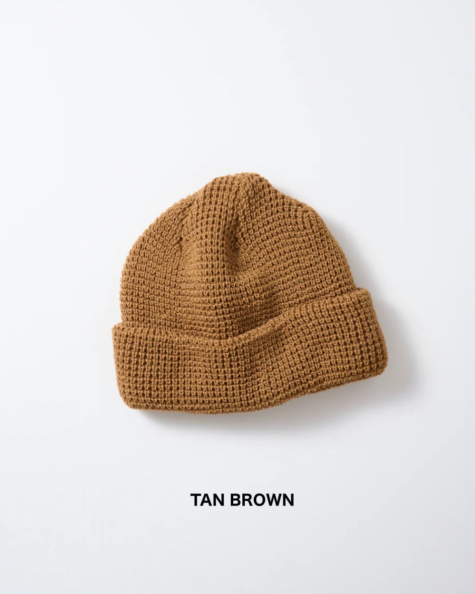 アクリルとウールの混紡糸を使用した、軽くてあたたかなワッチキャップ。ミリタリーのサーマルウェアをイメージした凹凸のあるワッフル編みが空気をたっぷりと含み、保温性をさらに高めてくれます。