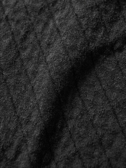 人体から出る遠赤外線を活用し快適な保温効果を発揮する光電子®︎の高純度超微粒子セラミックスが練り込まれた、伸縮性と弾力性に優れた糸を束ねてTシャツ生地の間に敷き詰めて挟み込み、ダイヤ柄のステッチで止めたキルティング生地を使用。軽くて柔らかいカットソーの着心地と光電子®の快適な保温性を兼ね備えており、洗濯機で洗うことも可能です。