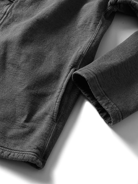 全体に施した二本針縫製による頑丈なステッチの凹凸に、Pigment Dye (顔料染め) 特有のアタリが加わることで味のある表情を生み出し、スウェットの生地感やカジュアル感を引き締めて無骨な雰囲気に見せています。フロントループボタンも100%コットン製となっており、ボディと共に顔料染めを施すことで、個性的なデザインをワンカラーにまとめてシンプルに仕上げています。ピグメント染めによるヴィンテージ品のような擦れた色合いは、着用と洗濯を繰り返していくことで徐々に色褪せし更に風合いが増していくので、長く愛用するほどに味わいのある唯一無二の一着となっていきます。