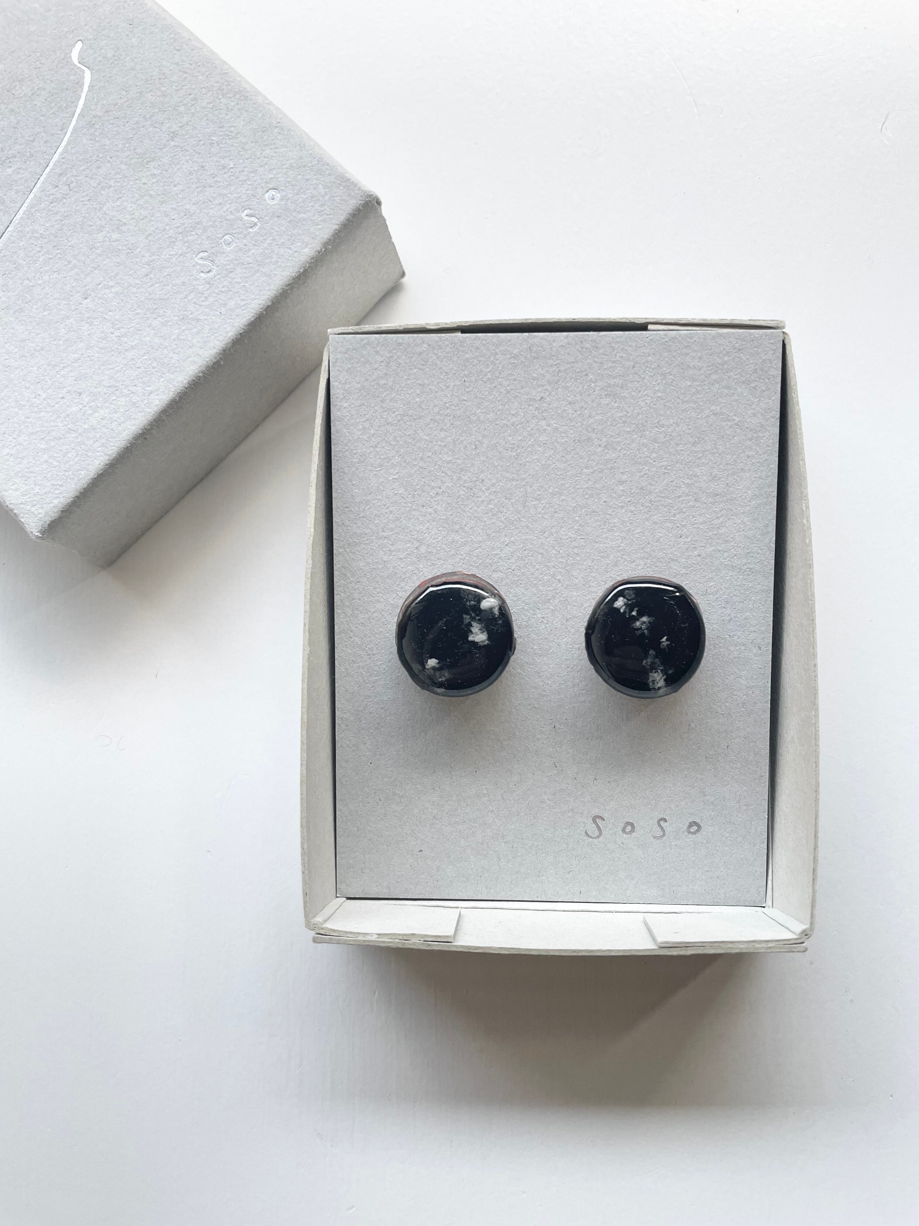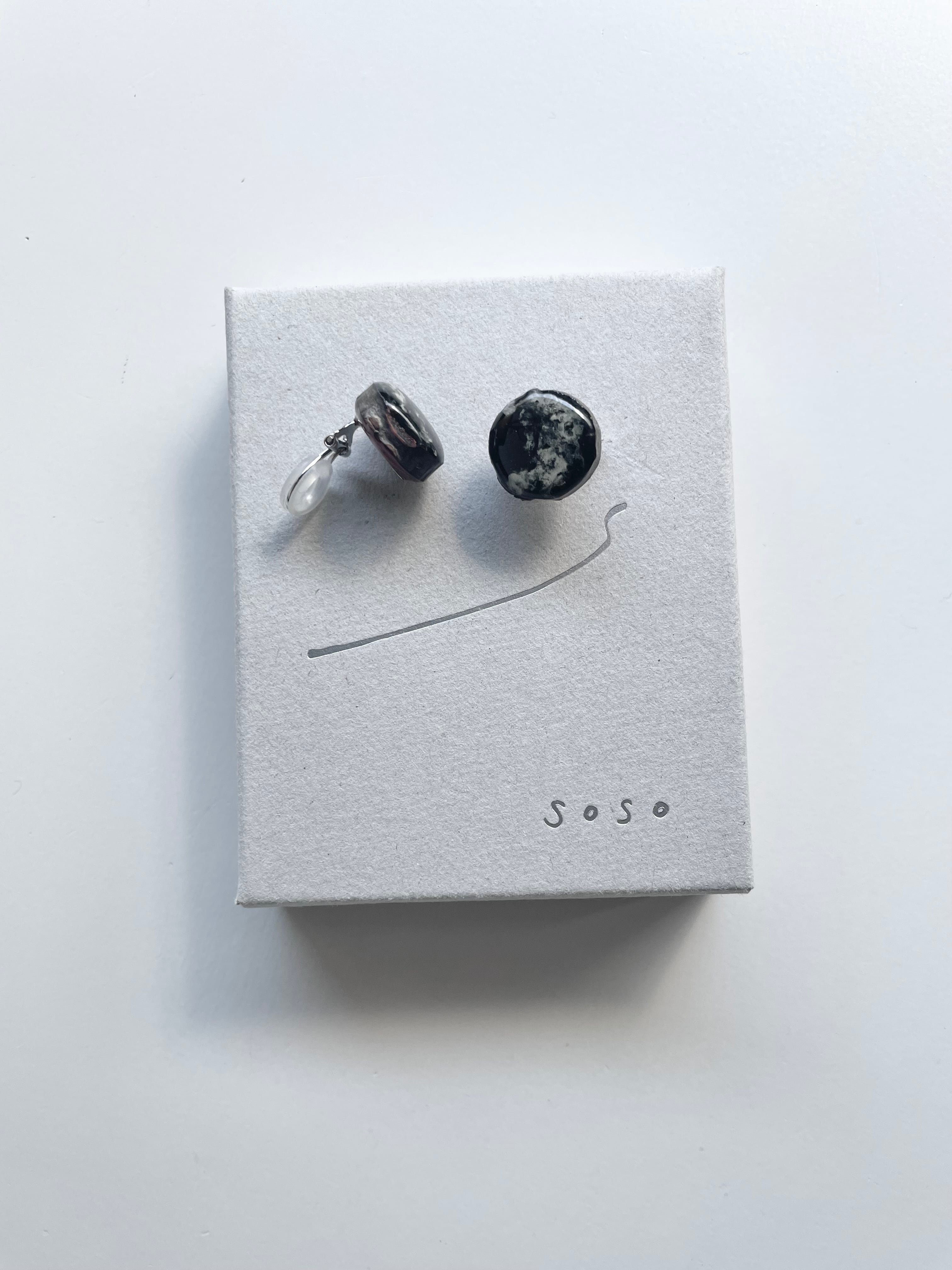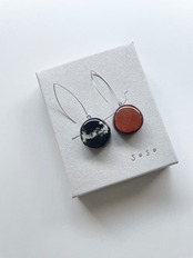 剪定や間引きによって出た天然木の端材に、鉱石等が原料の岩絵具で一点ずつ手描きで色を付け、仕上げに樹脂を施しています。側面は手を加えず、自然の風合いをそのままに。主素材が木なのでとても軽く、思わず付けているのを忘れてしまう程、耳によく馴染みます。