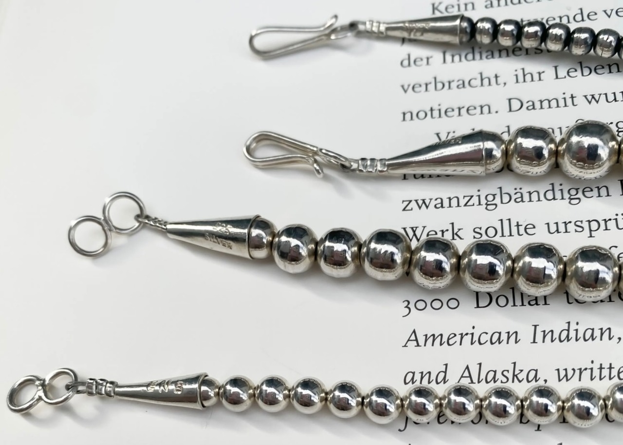 半球状のシルバー2つを繋げて1つのビーズとなるナバホパールは1つのネックレスやブレスレットを作るだけでも大変な労力と時間がかかるため現代ではそのほとんどが機械で作られたビーズになってしまいました。そんな現代において、ネイティブアメリカン本来の考え方や歴史、伝統を大切にしているEricka Nicolas Begayは、ビーズはもちろん、フックやコーンなどのパーツもシルバーを溶かすところから全て手作業のインゴットシルバーに拘りナバホパールを製作しています。温かみのある深い色合いや柔らかな付け心地は手作業ならでは。代々受け継がれてきた伝統に触れることができる唯一無二の作品です。