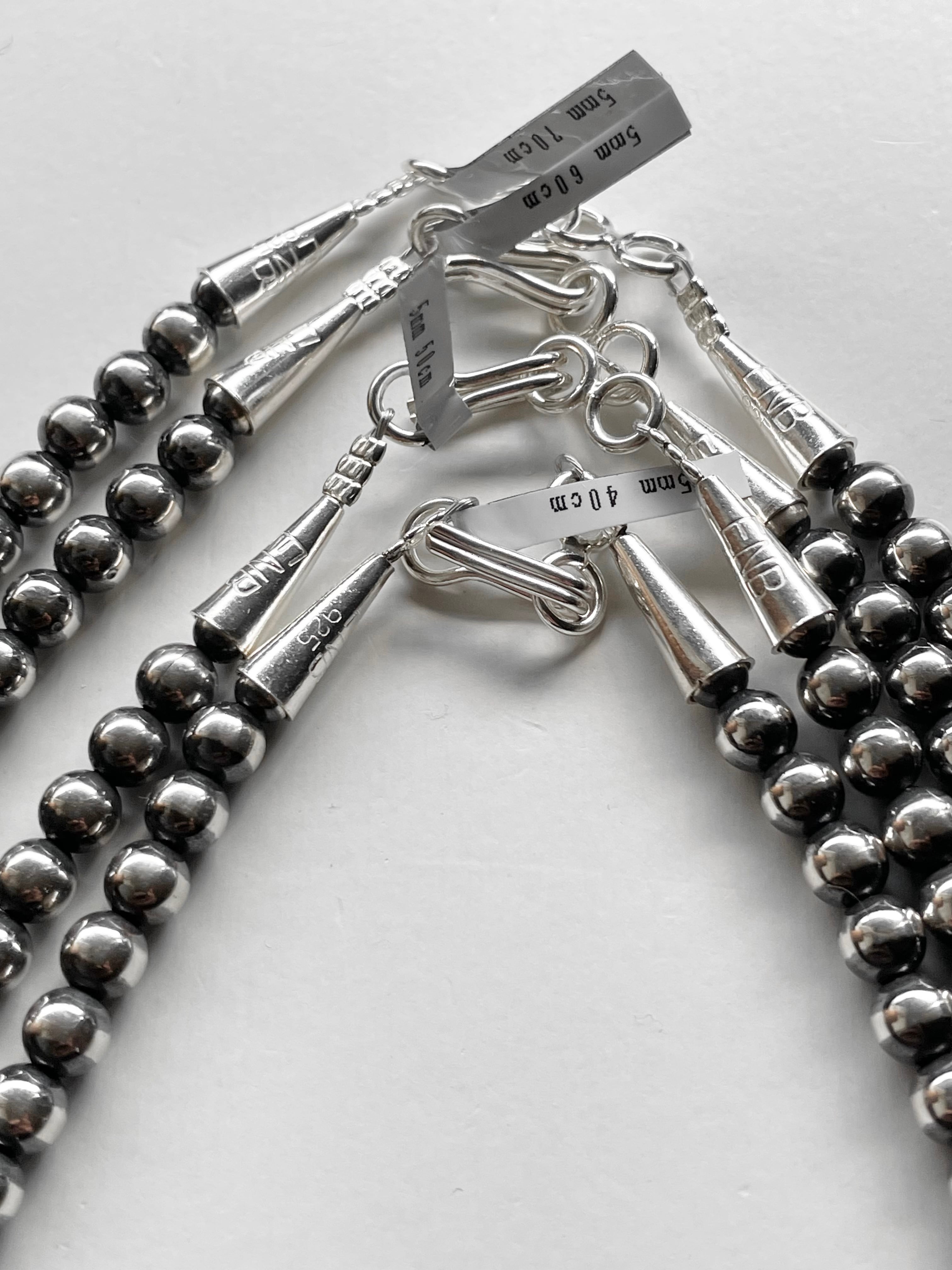 半球状のシルバー2つを繋げて1つのビーズとなるナバホパールは1つのネックレスやブレスレットを作るだけでも大変な労力と時間がかかるため現代ではそのほとんどが機械で作られたビーズになってしまいました。そんな現代において、ネイティブアメリカン本来の考え方や歴史、伝統を大切にしているEricka Nicolas Begayは、ビーズはもちろん、フックやコーンなどのパーツもシルバーを溶かすところから全て手作業のインゴットシルバーに拘りナバホパールを製作しています。温かみのある深い色合いや柔らかな付け心地は手作業ならでは。代々受け継がれてきた伝統に触れることができる唯一無二の作品です。