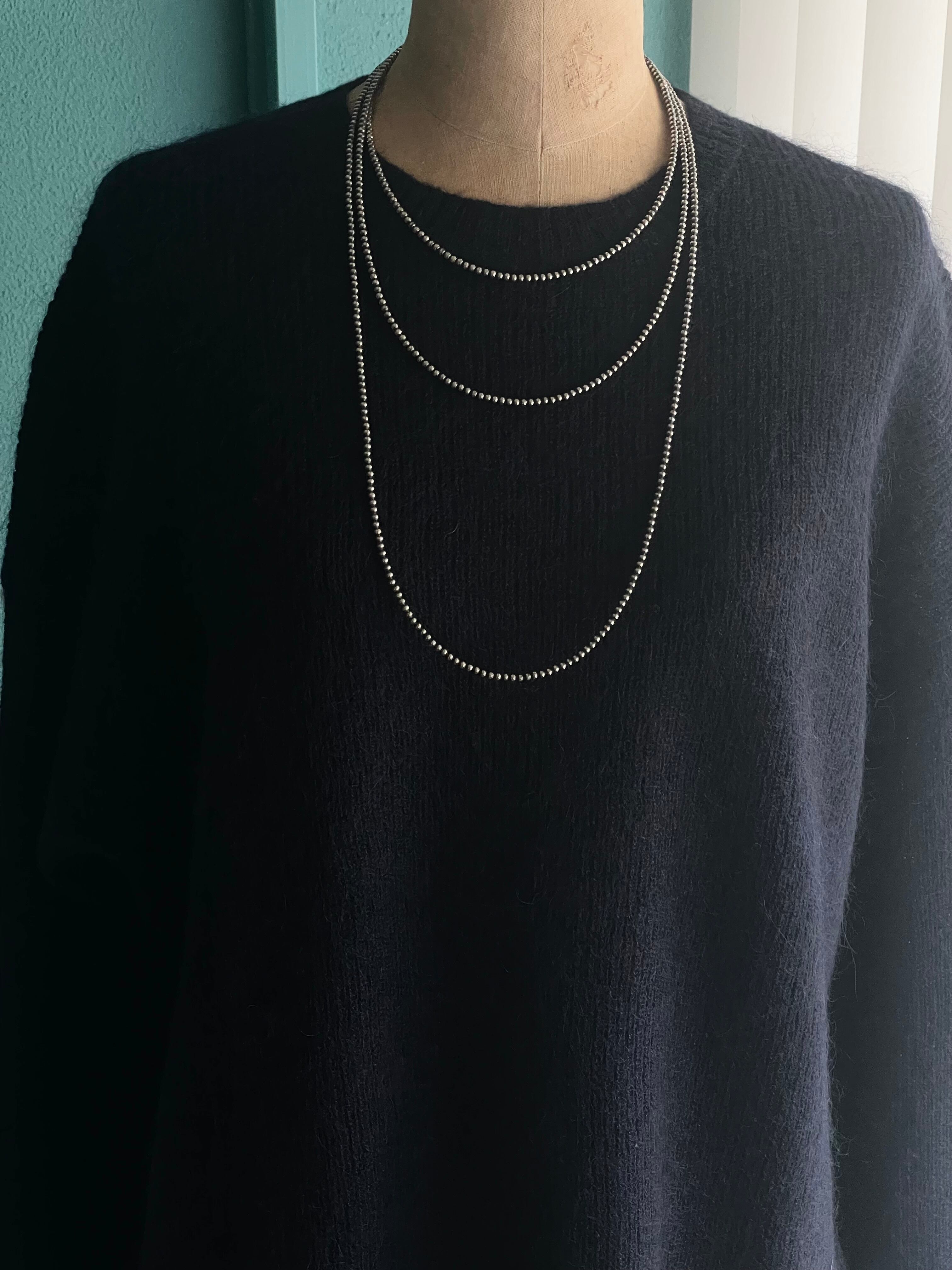 半球状のシルバー2つを繋げて1つのビーズとなるナバホパールは1つのネックレスやブレスレットを作るだけでも大変な労力と時間がかかるため現代ではそのほとんどが機械で作られたビーズになってしまいました。そんな現代において、ネイティブアメリカン本来の考え方や歴史、伝統を大切にしているEricka Nicolas Begayは、ビーズはもちろん、フックやコーンなどのパーツもシルバーを溶かすところから全て手作業のインゴットシルバーに拘りナバホパールを製作しています。温かみのある深い色合いや柔らかな付け心地は手作業ならでは。代々受け継がれてきた伝統に触れることができる唯一無二の作品です。