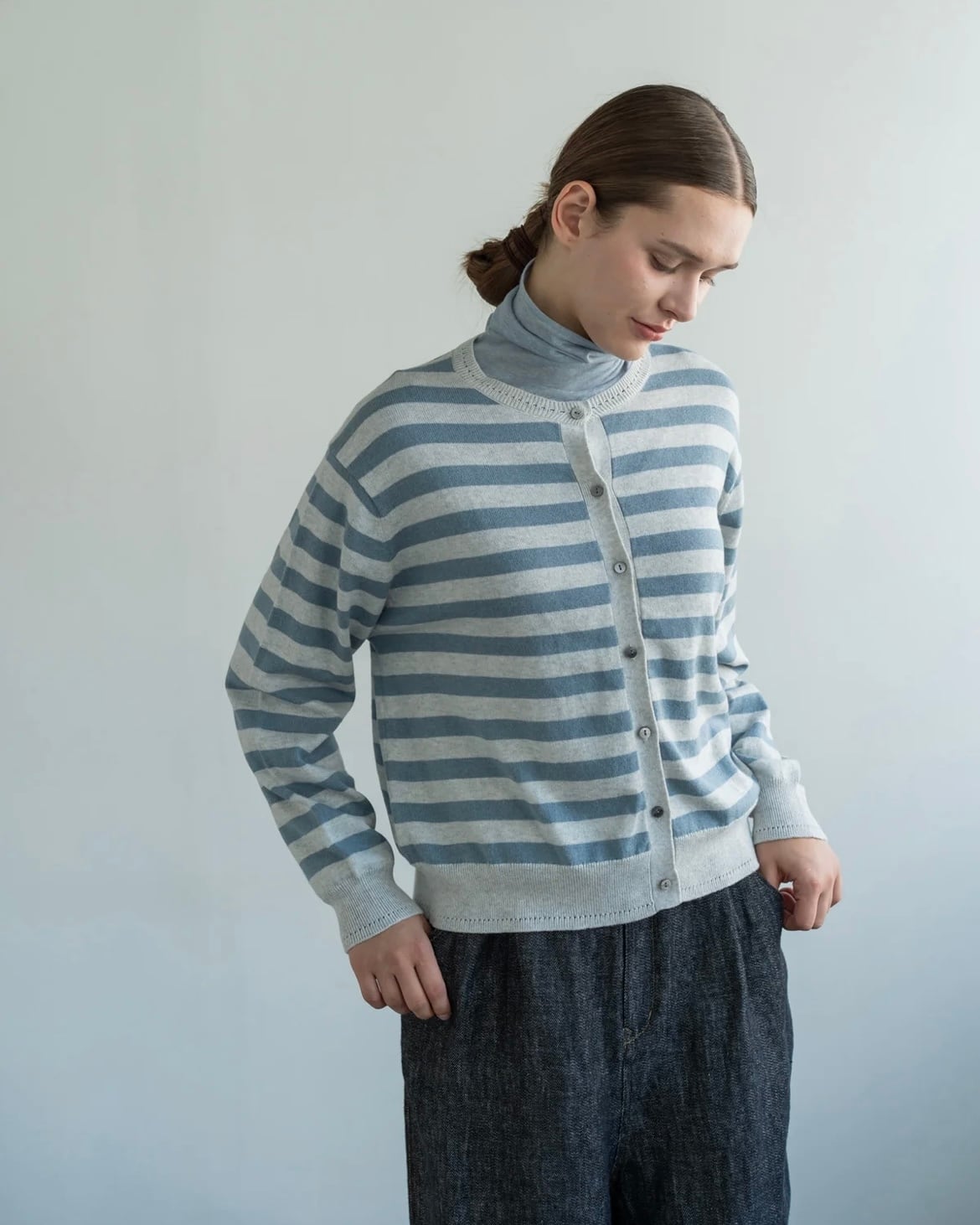 ほどよい厚みと軽さで、季節の変わり目に特に活躍。朝晩の冷え込み対策や、室内での温度調整にも便利で、長いシーズン頼れる一枚です。ワンピースやブラウスの上に重ねたり、デニムやスカートと合わせたりと、コーディネートの幅も広がります。