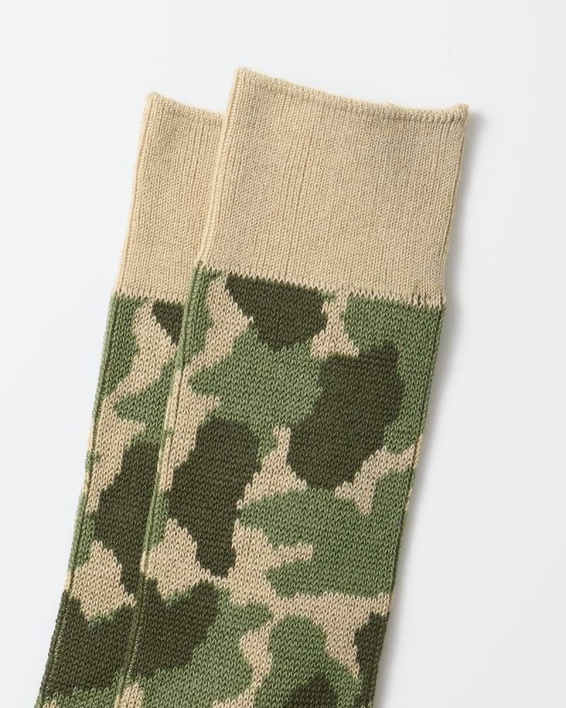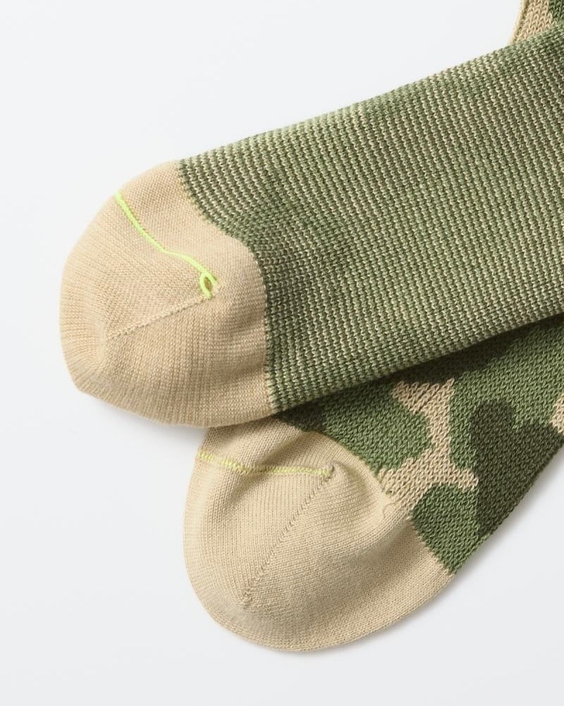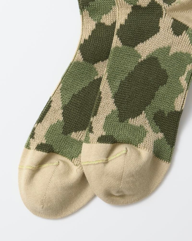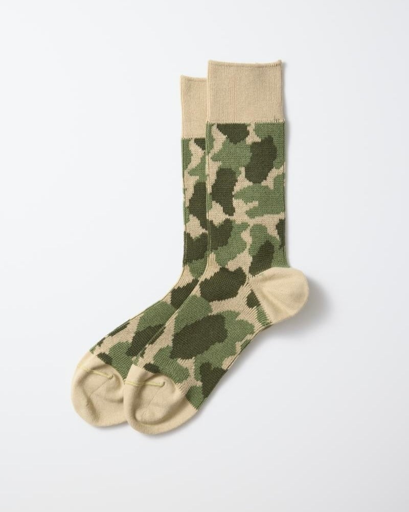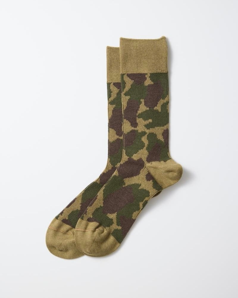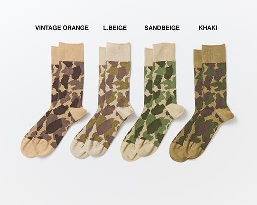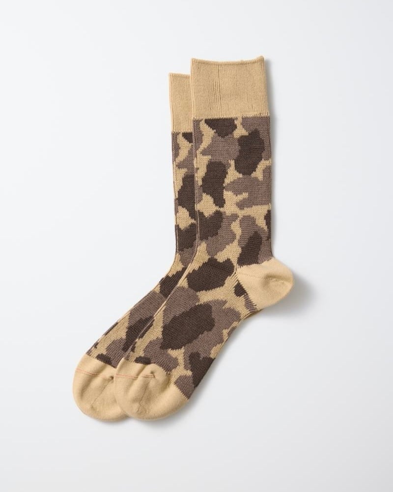 "ダックハンターカモ"をモチーフにしたソックス。本来、ハンティング用に開発されたカモフラージュ柄で、自然に溶け込む有機的なパターンは、やがてミリタリーでも一部採用され、アウトドアとミリタリーの境界を越えて広まっていきました。スニーカーはもちろん、革靴とも合わせやすい肉感で幅広いシーンで着用いただけます。