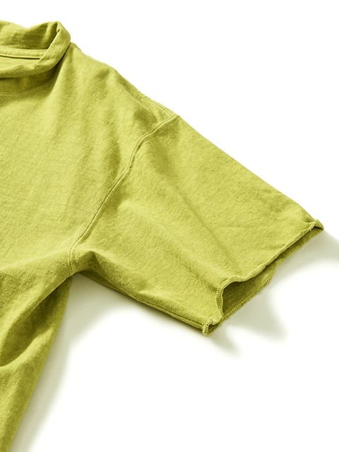 適度にゆとりを持たせたシルエットに、首、袖、裾はカットオフ&ロックステッチ仕様で、ナチュラルにクルクルと丸まったラフなデザイン。程良く肩の力の抜けたリラックス感のる一枚。