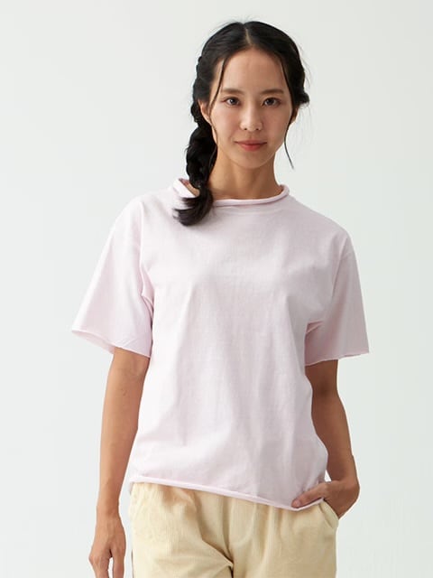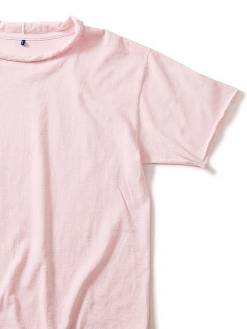 適度にゆとりを持たせたシルエットに、首、袖、裾はカットオフ&ロックステッチ仕様で、ナチュラルにクルクルと丸まったラフなデザイン。程良く肩の力の抜けたリラックス感のる一枚。