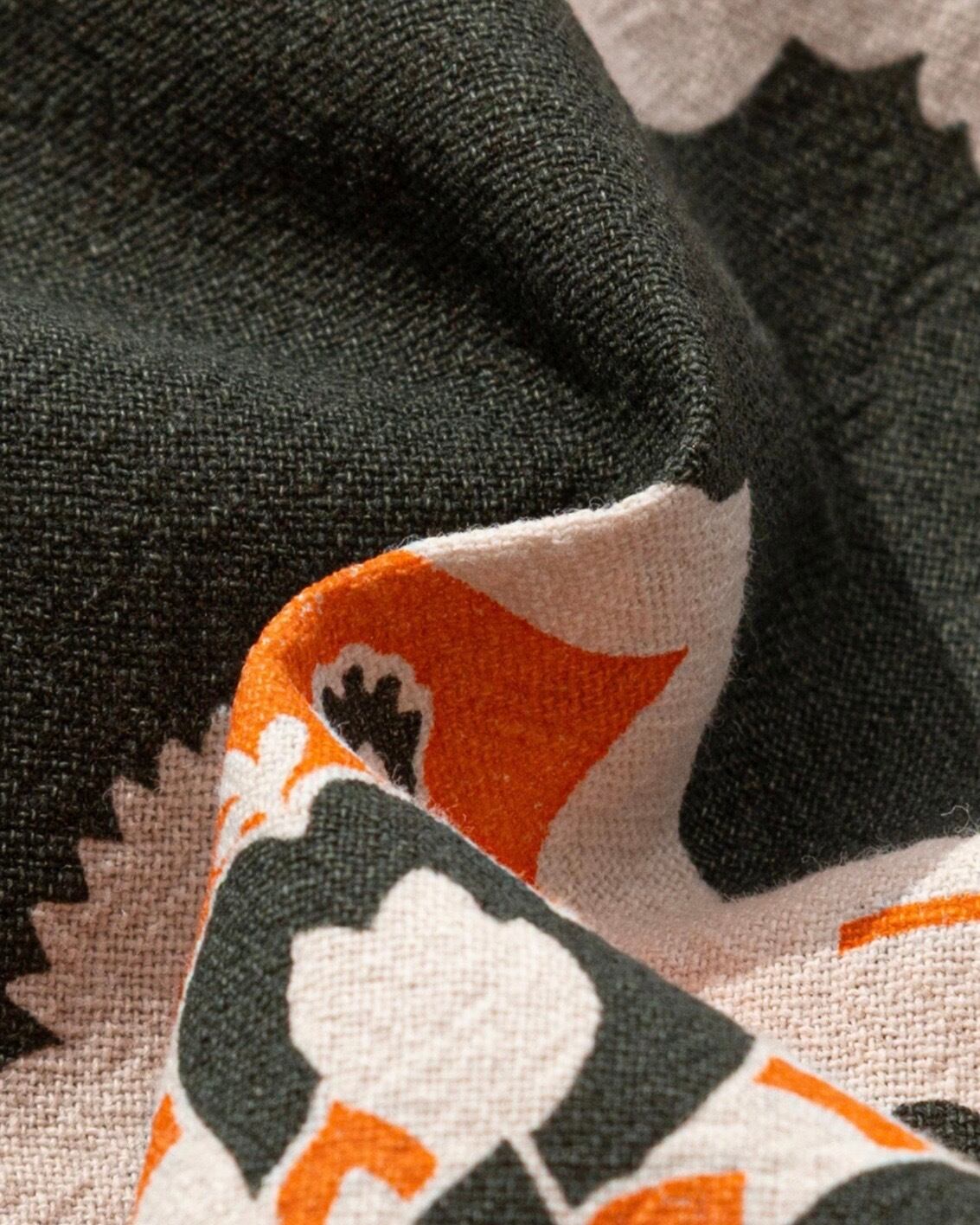 手描きのラウンドデザインが総柄となったコレクション。手間と時間のかかるシルクプリント仕上げにこだわりました。インクジェットとは異なり、長く使うことで色合いや風合いの深みが増し経年変化を楽しめます。1年を通して着用しやすい中肉のコットン生地を使用。高密度によるしなやかな風合いと上品さが特徴で表面の不規則な細かい凹凸が肌への張り付きを防ぎドライな着心地をキープします。