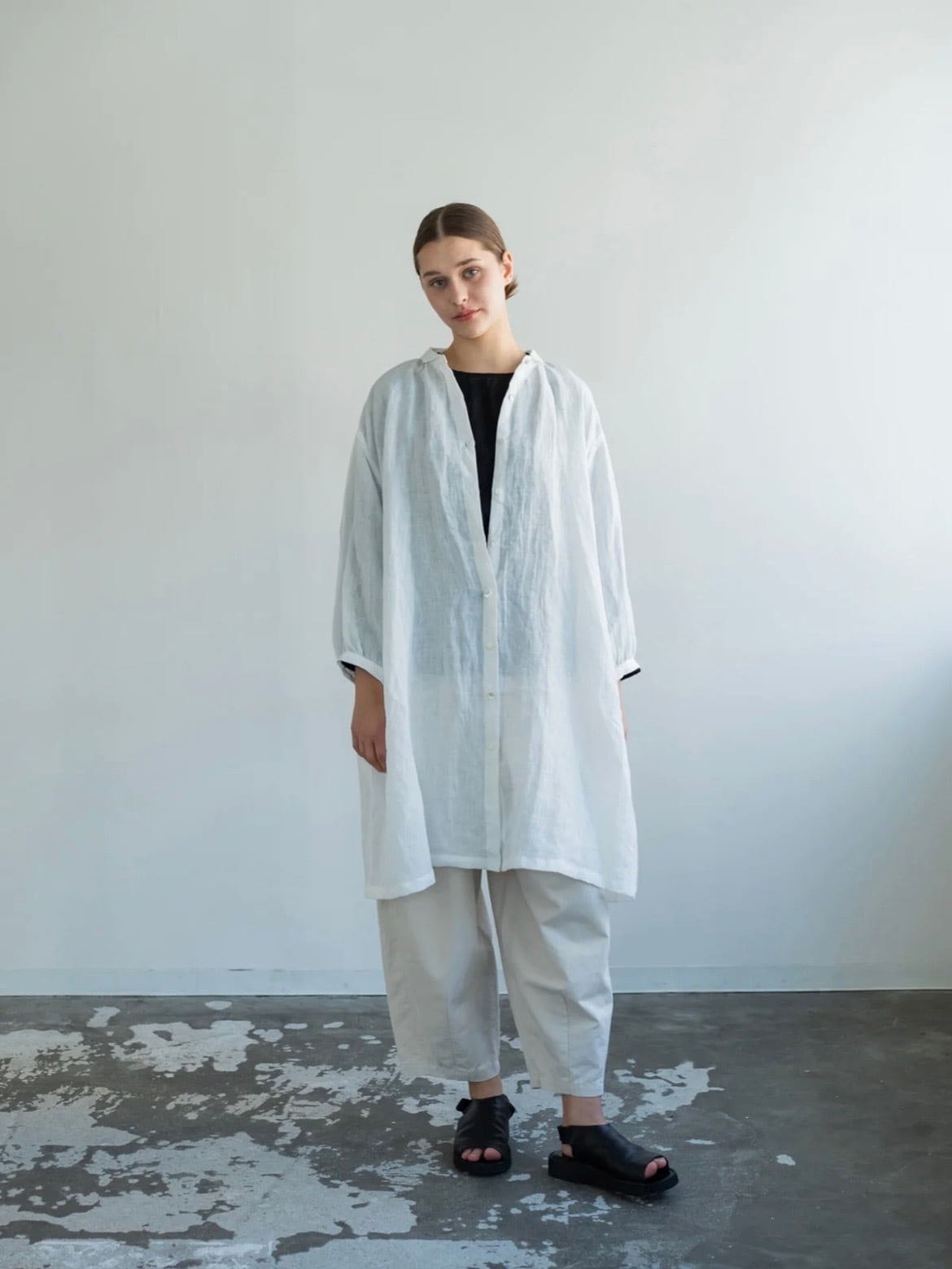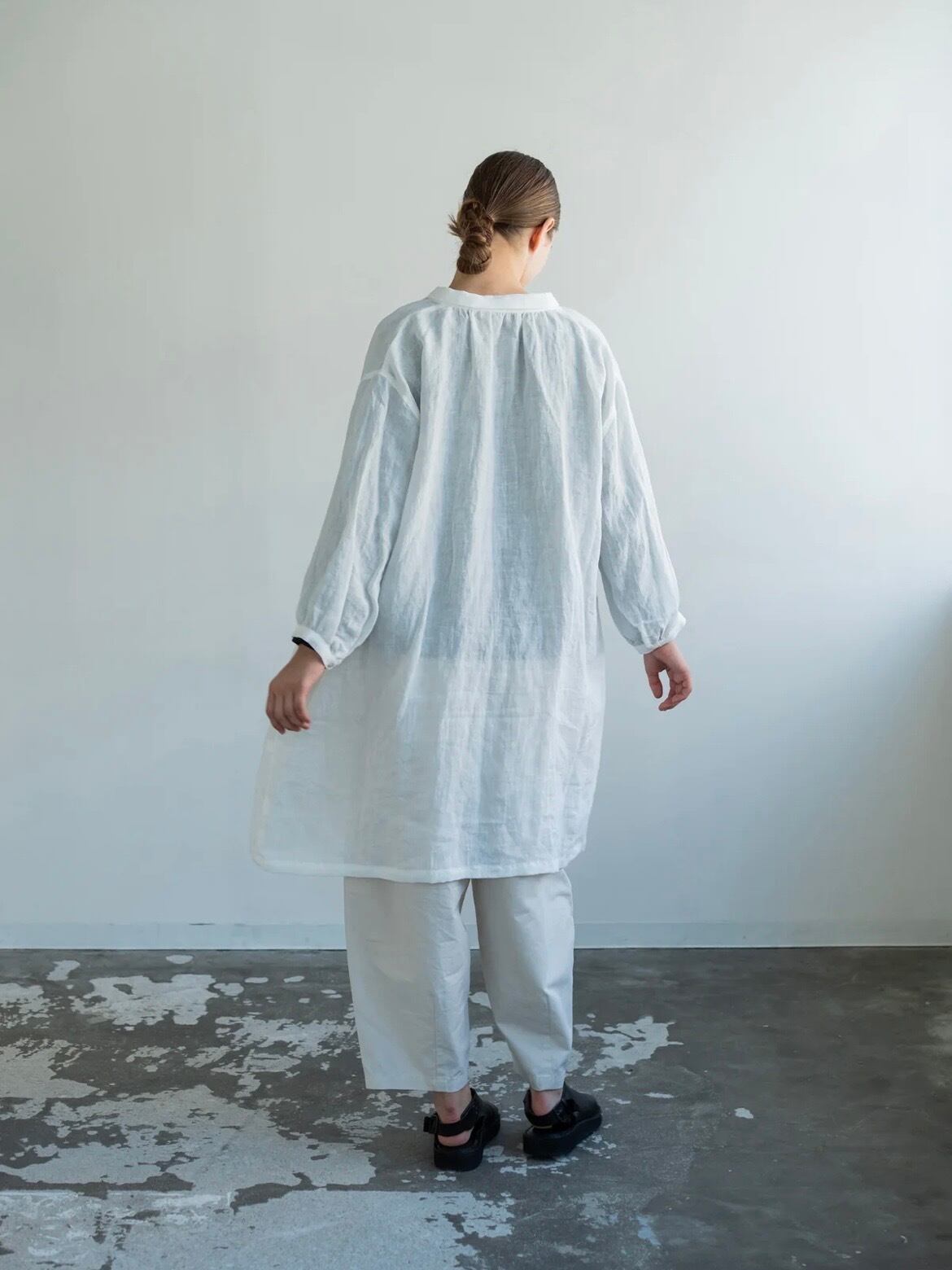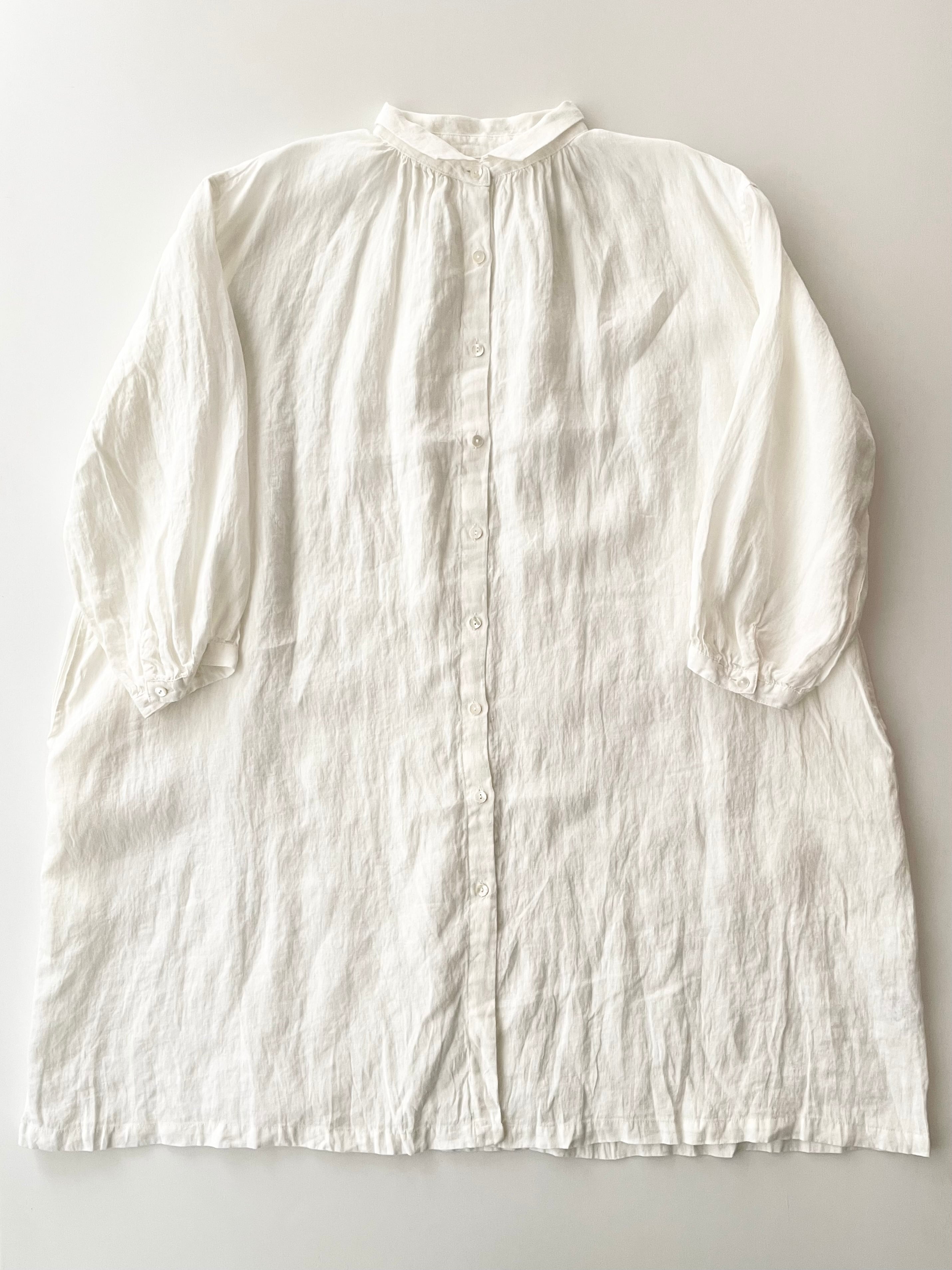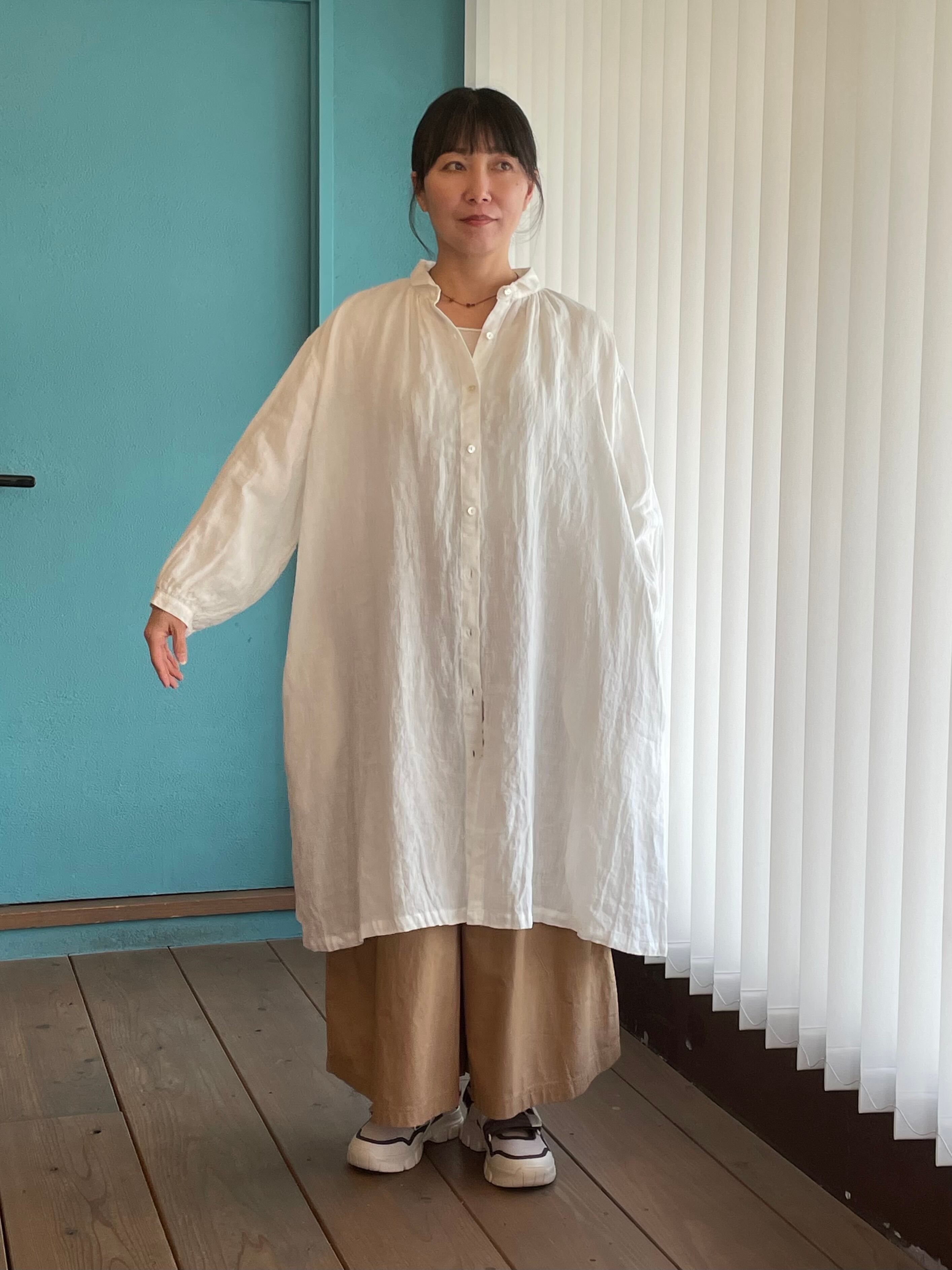デザインのポイントは、すっきりとした細幅の衿。甘くなりすぎないシャープなラインが全体を引き締め、大人の装いにも取り入れやすいバランスに仕上げています。ゆとりのある身頃と落ち感のあるシルエットで、リラックスした着心地ながらも自然と雰囲気のあるスタイルに。丈感はボトムスとのレイヤードもしやすい絶妙なバランス。ワイドパンツやデニム、スカートなどと合わせて、さまざまな着こなしを楽しんでいただけます。前開きのデザインなので、ワンピースとしてはもちろん、軽い羽織りとしても活躍。季節の変わり目にはTシャツやブラウスの上からさっと重ねるだけで、こなれたスタイリングが完成します。
