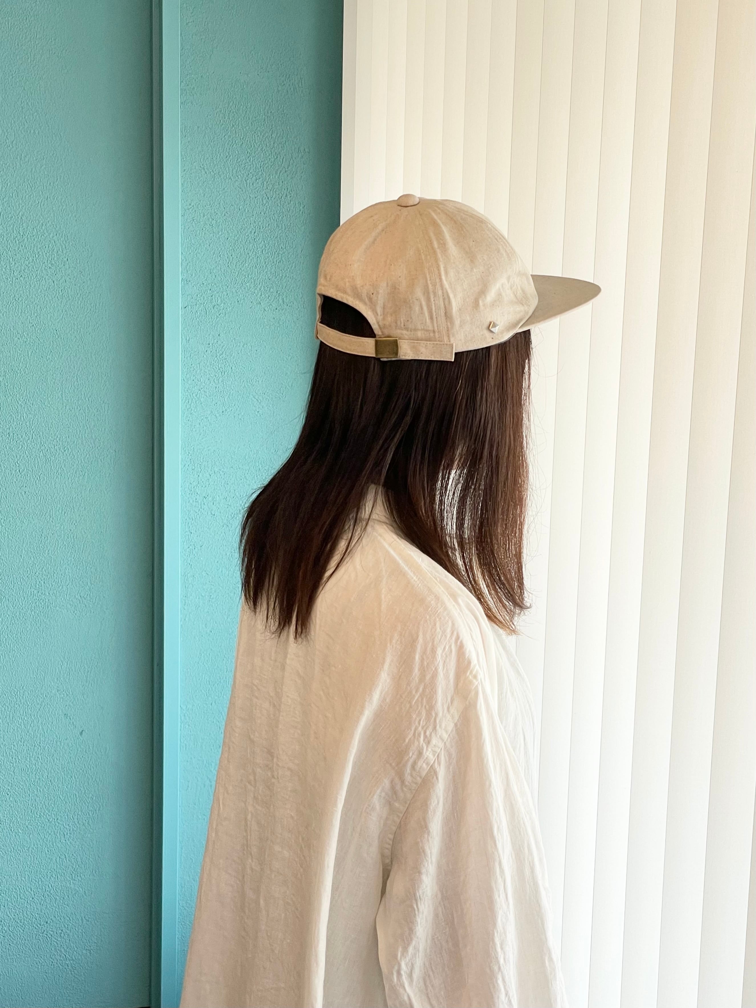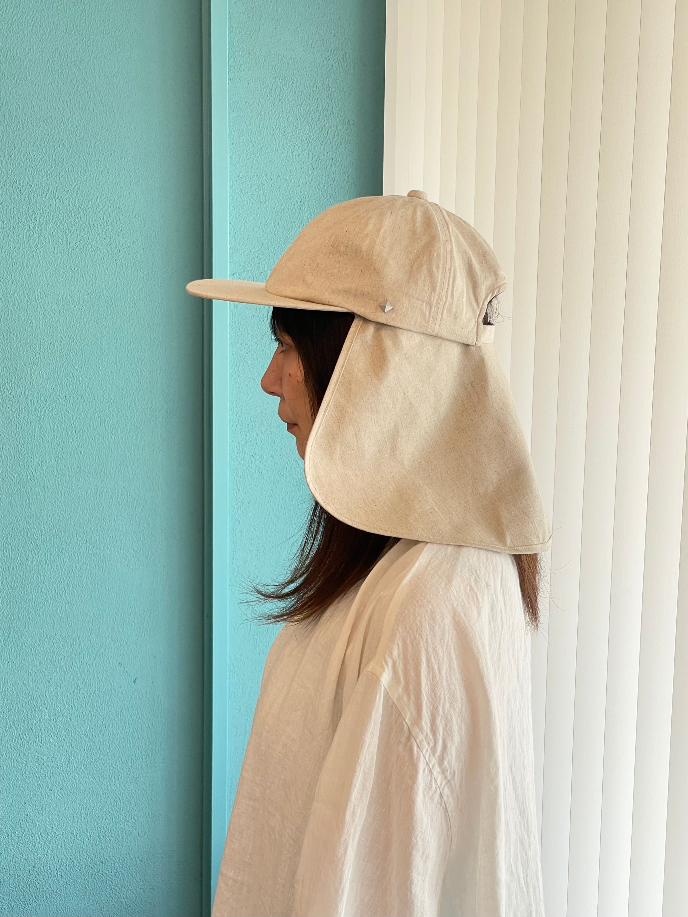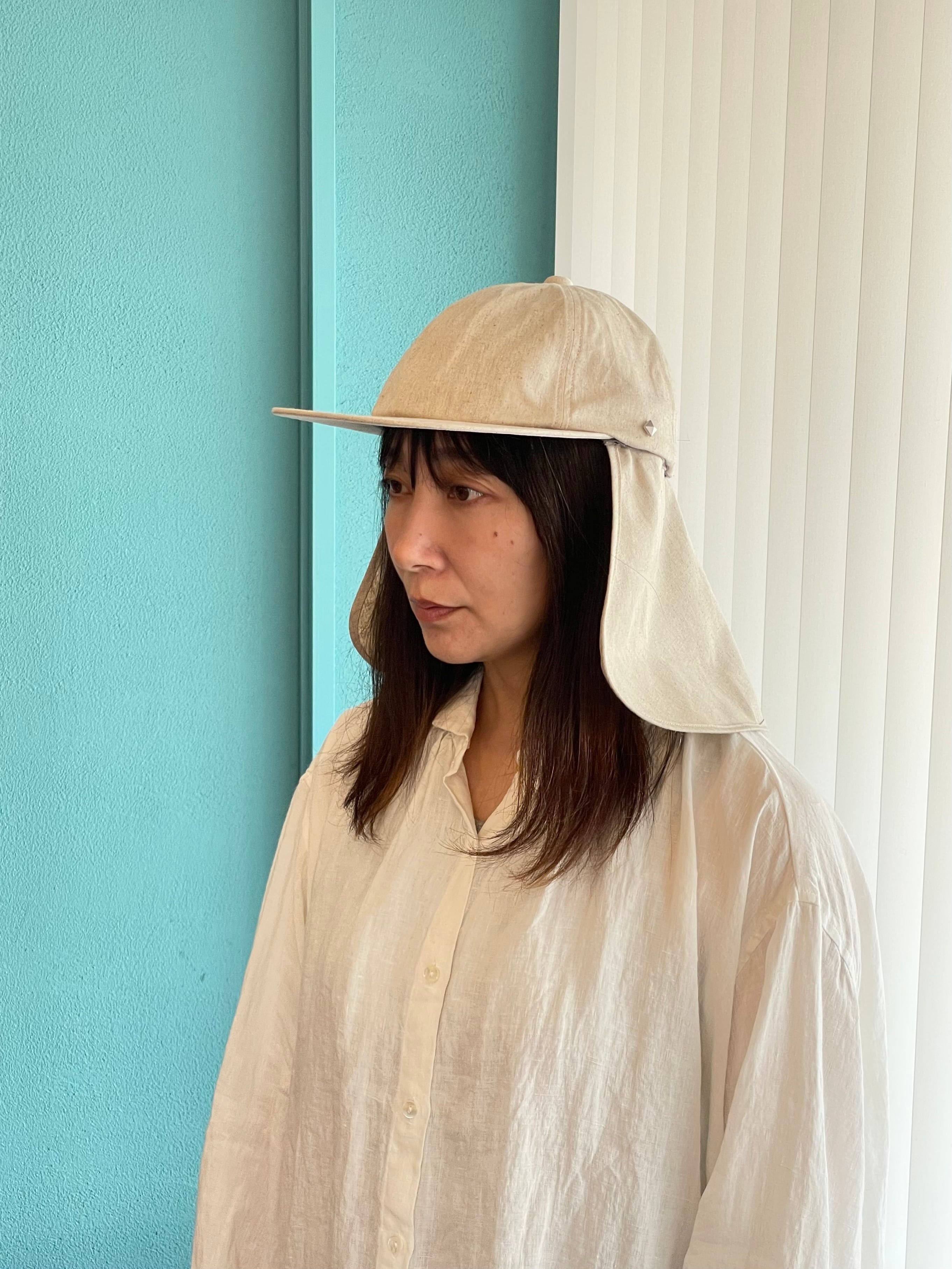 デザイナーが3〜4年前から愛用し、気付けば3個も所有するほどのお気に入り。日差し除けのタレはスナップ釦で取り外し可能。両サイドには鋲を打ちシンプルな中に一寸のスパイスを効かせ、ひひひらしい仕上がりです。