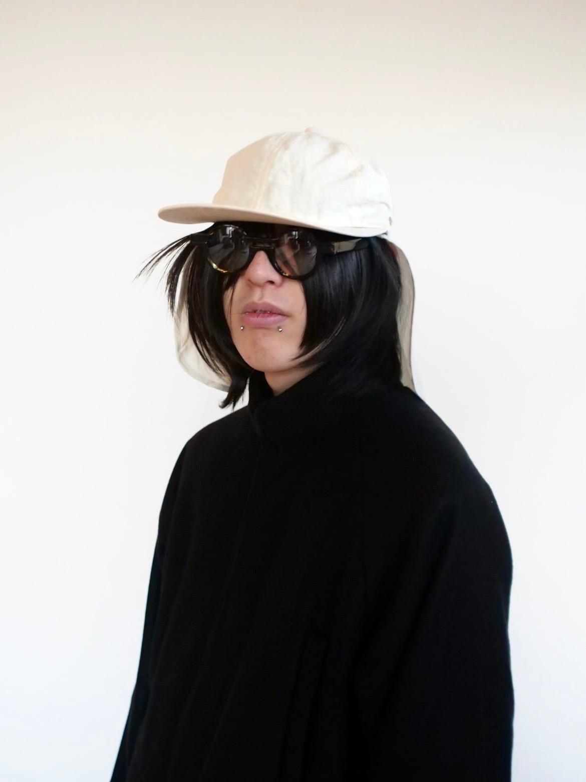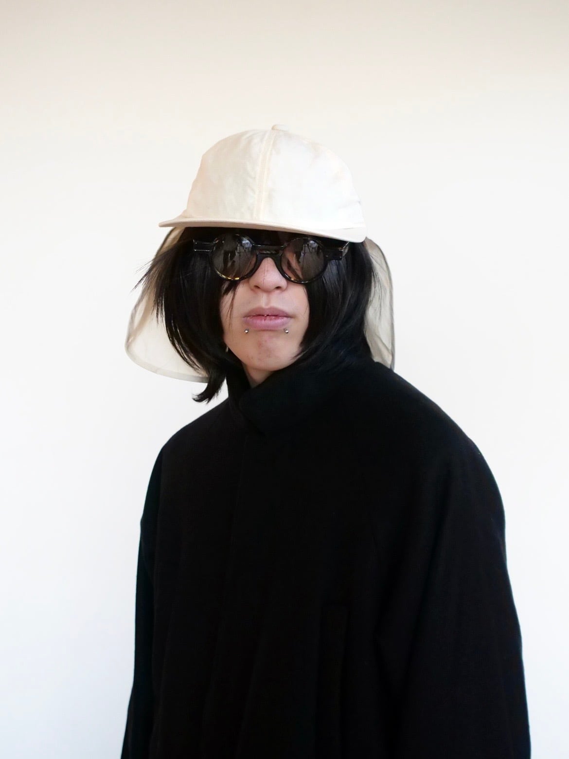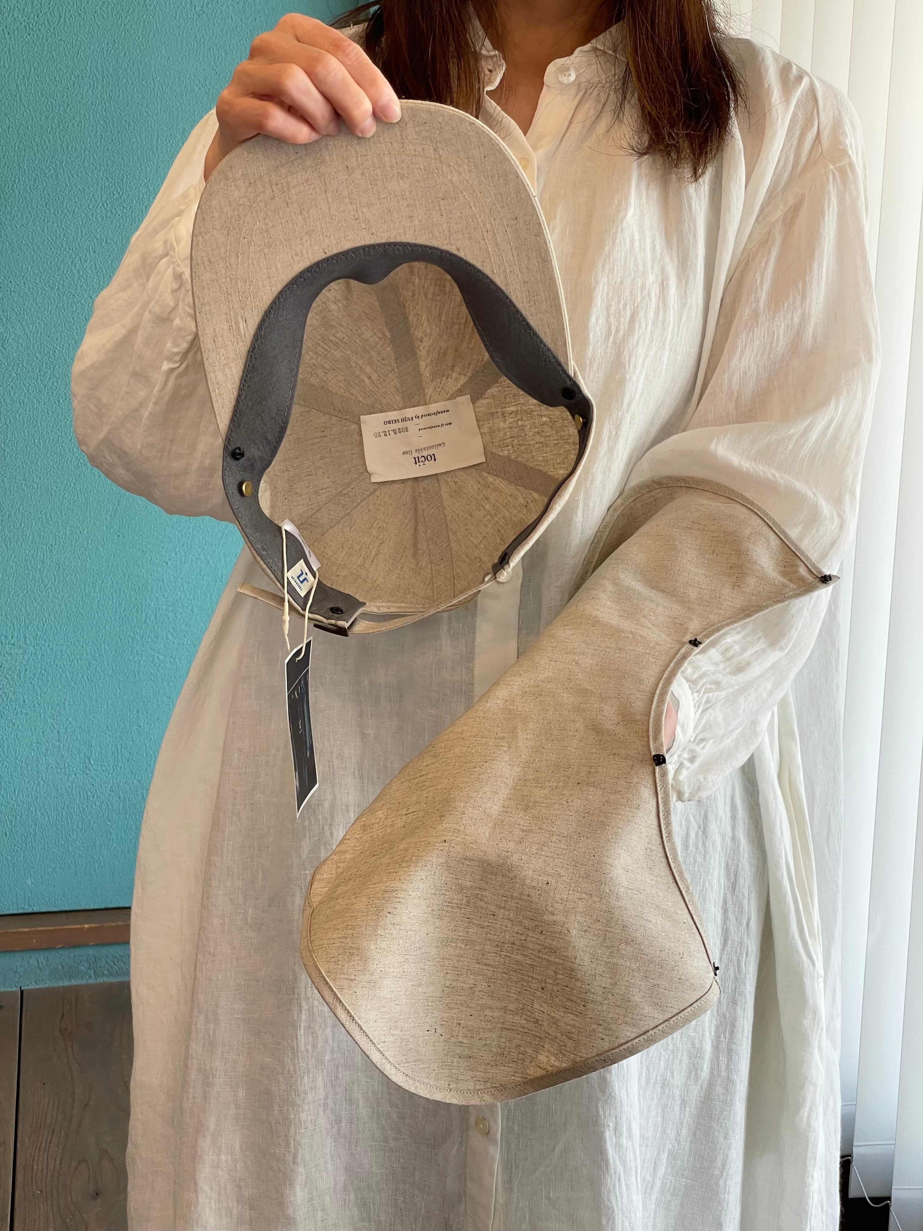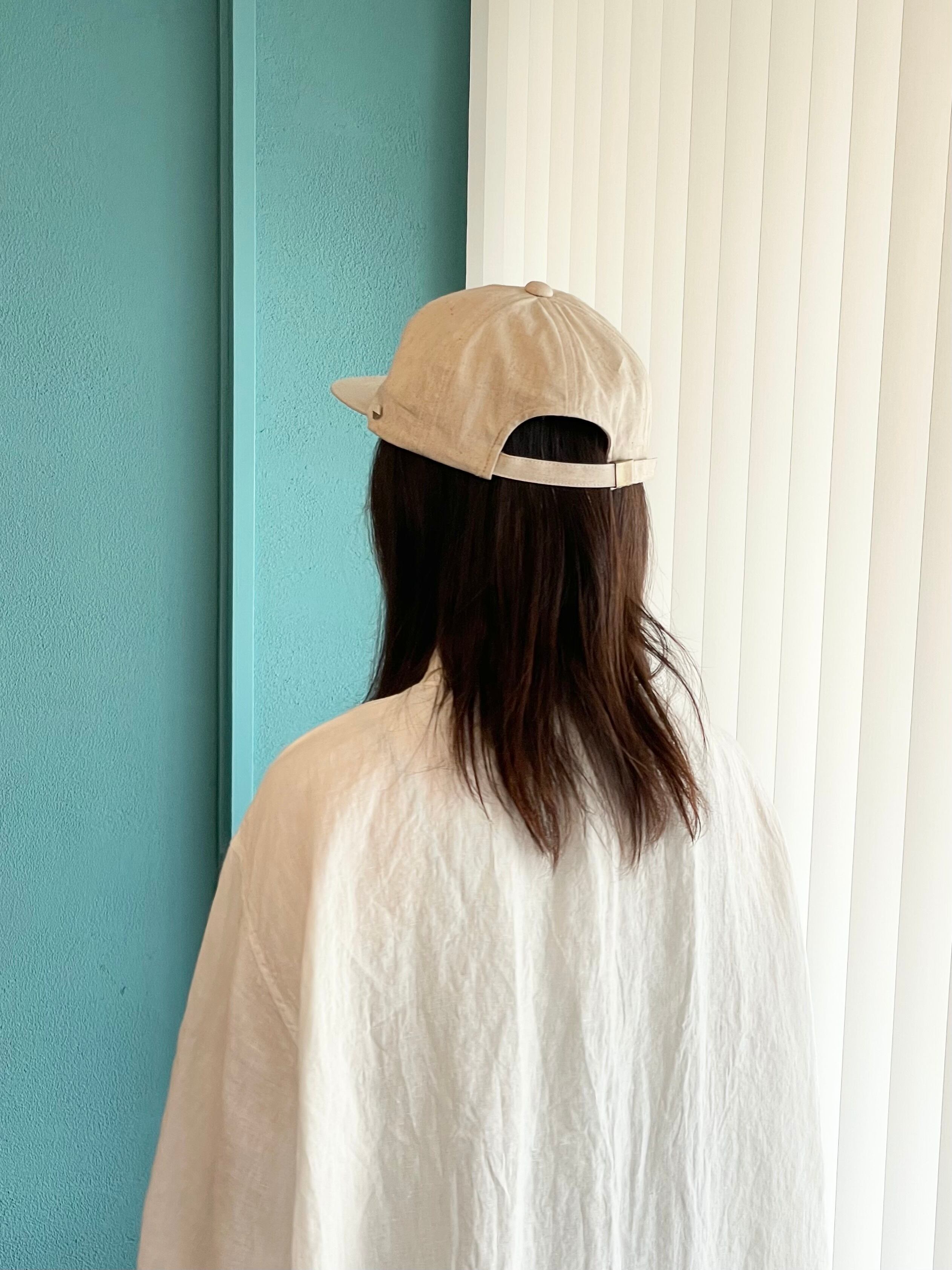 デザイナーが3〜4年前から愛用し、気付けば3個も所有するほどのお気に入り。日差し除けのタレはスナップ釦で取り外し可能。両サイドには鋲を打ちシンプルな中に一寸のスパイスを効かせ、ひひひらしい仕上がりです。