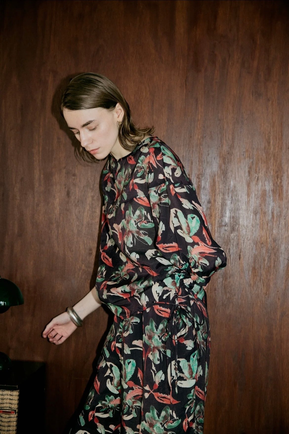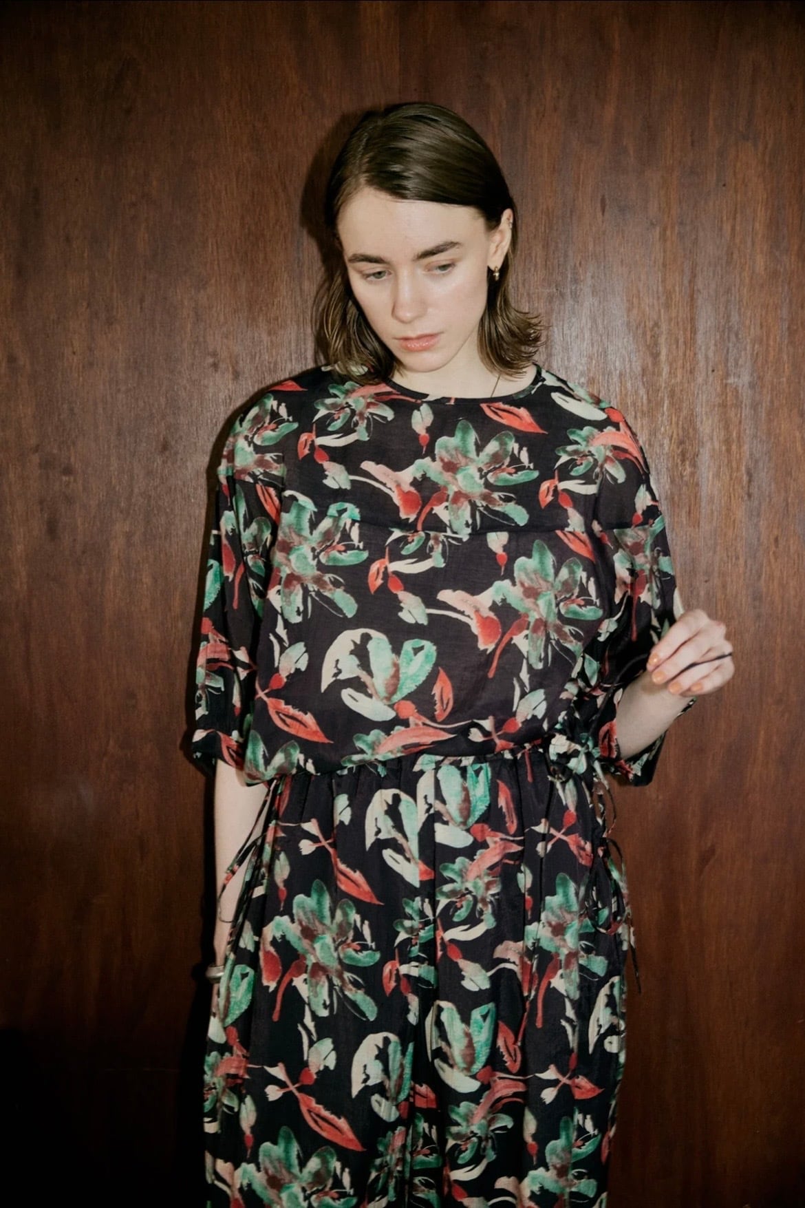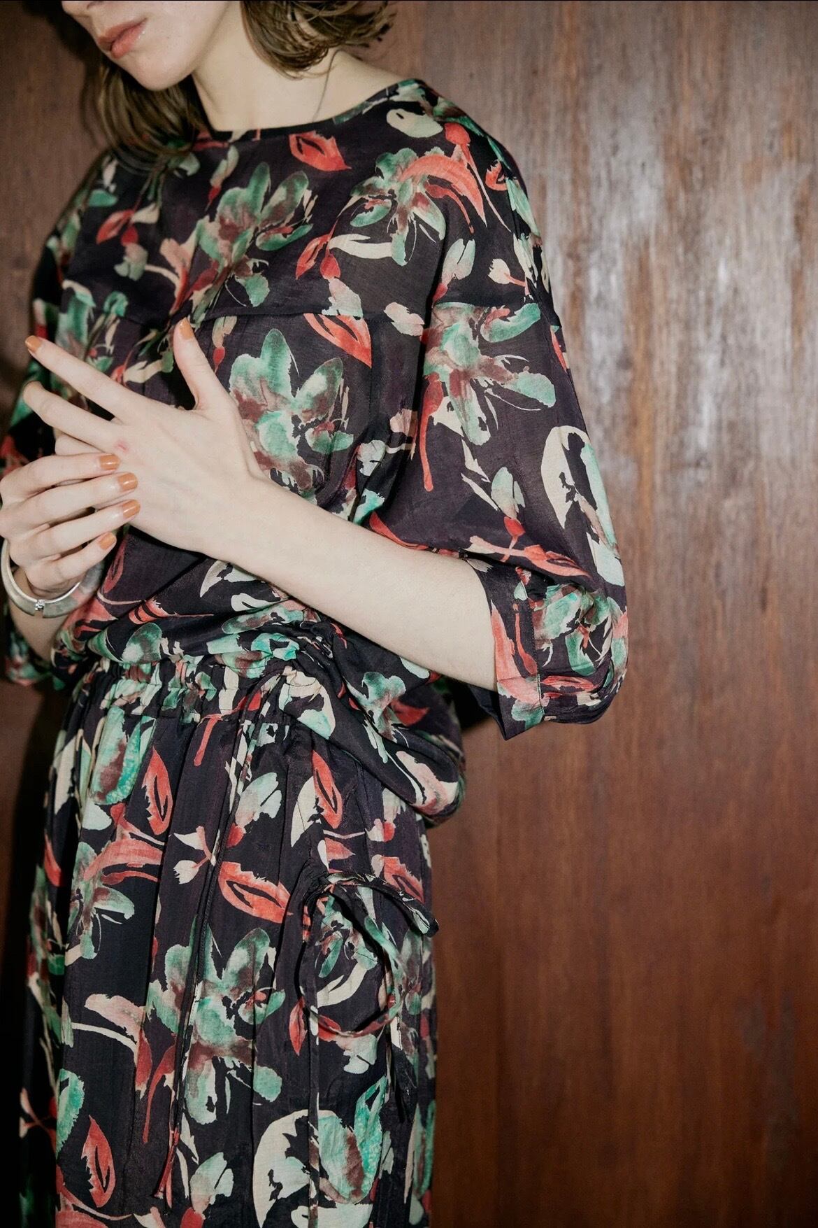 繊細に滲んだフラワーパターンがオリエンタルな空気を纏うインドプリントブラウス。サイドに配した紐をたくしあげ、シルエットの変化を楽しめるデザイン。一枚で雰囲気のあるスタイルが完成する、存在感たっぷりのアイテムです。