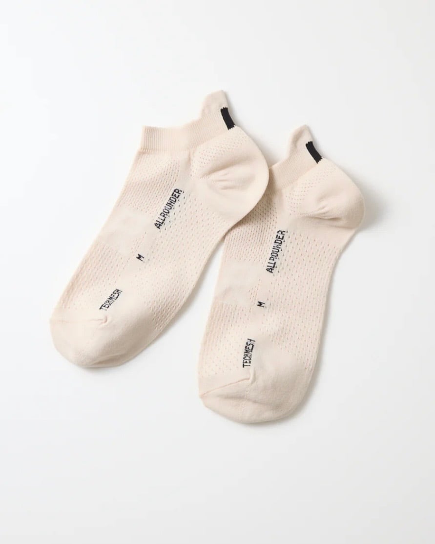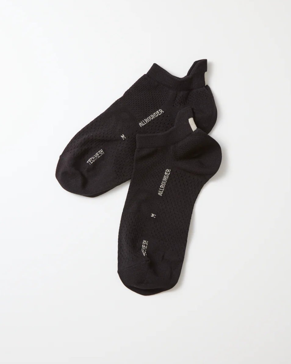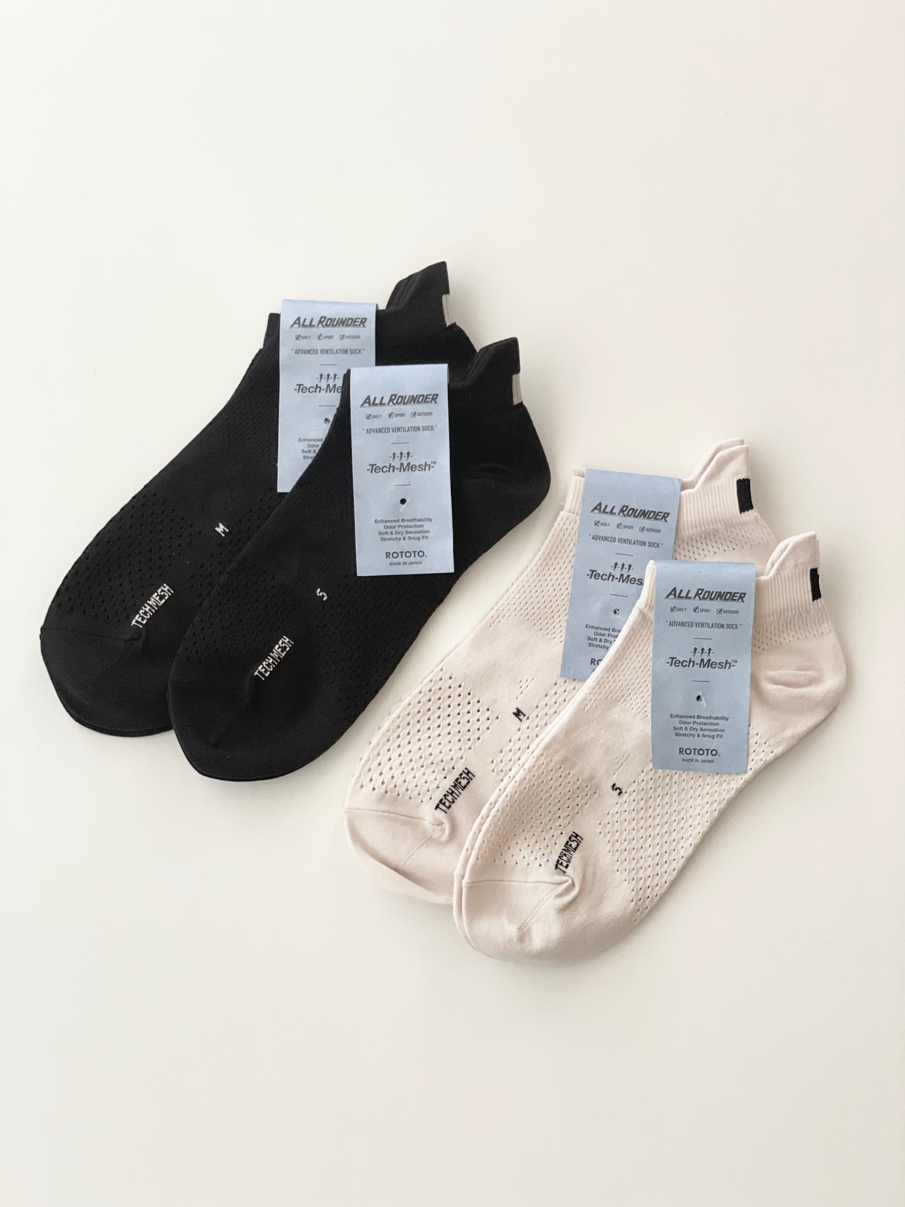 "ALLROUNDER"の通気性に優れた新シリーズ「TECH-MESH」。特殊な編み機によるメッシュ編みが、足のムレを軽減します。水に濡れても乾きが早く、軽量なのでサマーシーズンのアウトドア・アクティビティや旅行にもぴったり。ベースには、ソフトタッチでしなやかなポリエステル糸「SOLOTEX」を使用しています。また、汗から出るニオイを無臭成分化させる消臭機能糸を一緒に編み立てることで、気になる足のニオイも軽減。