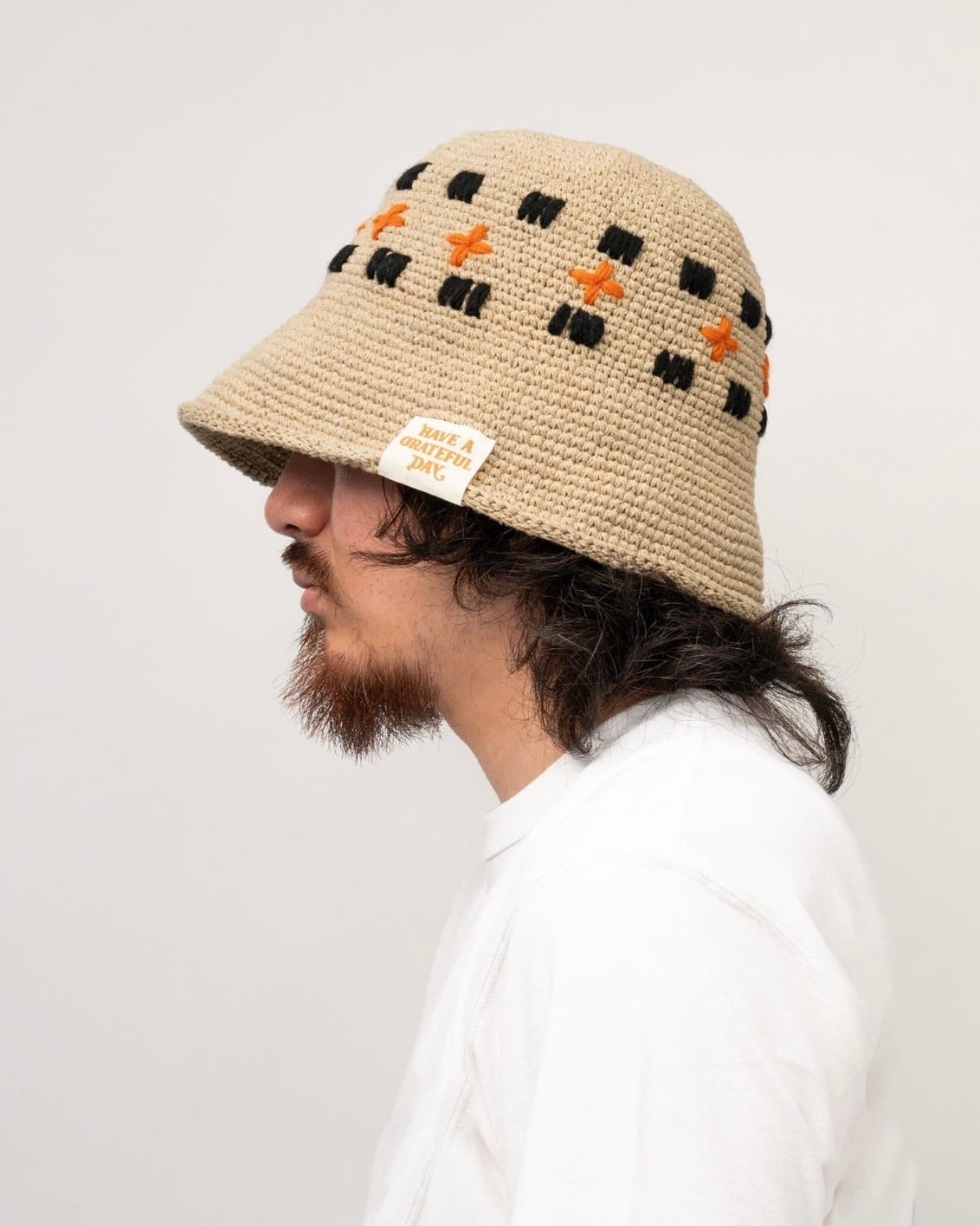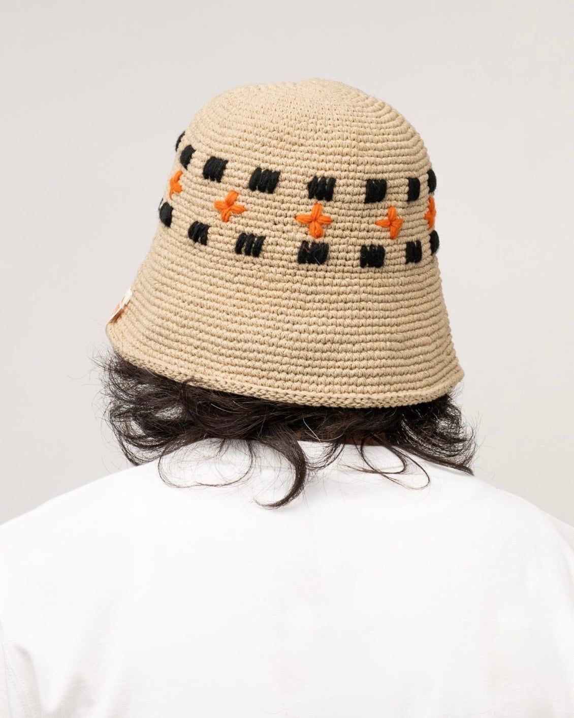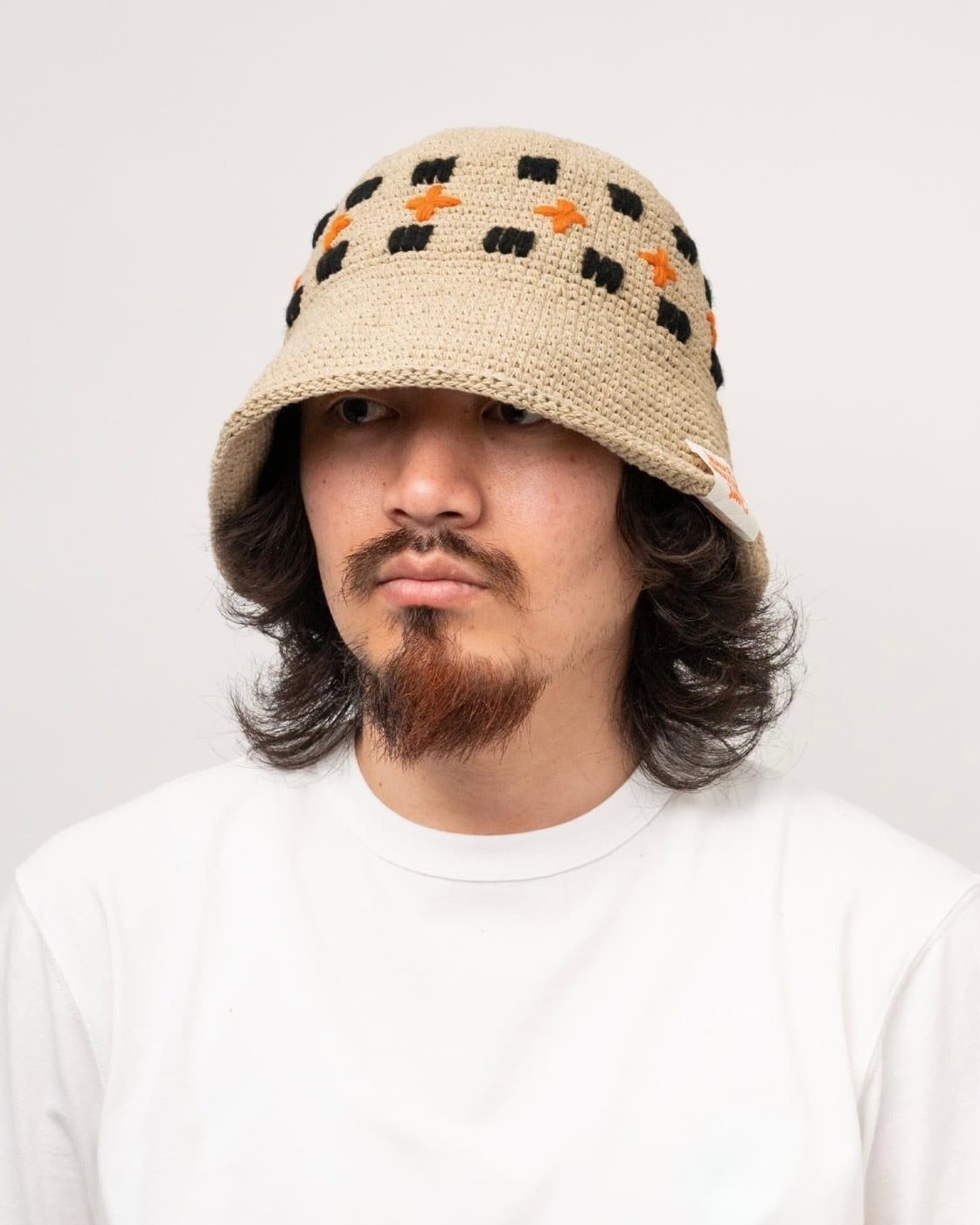 ハンドメイドで編み上げたクロシェハット。ややツバ広に設定することで、フロントのツバを上げても下ろしたままでもバランス良くかぶることができます。男女共に被りやすいアイテムです。