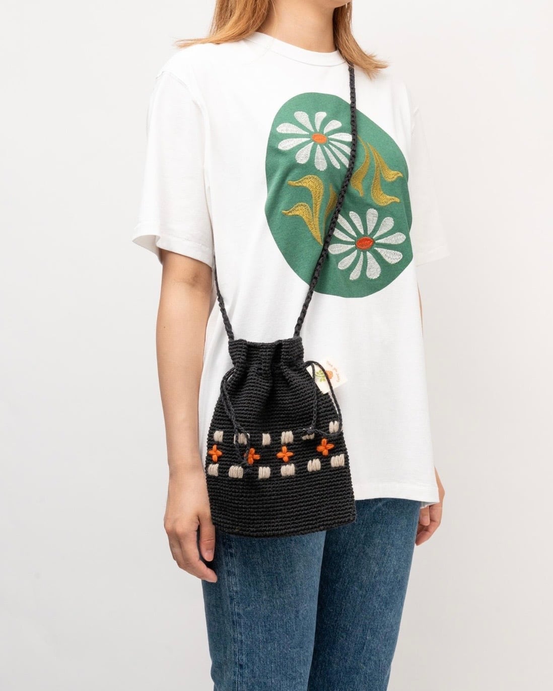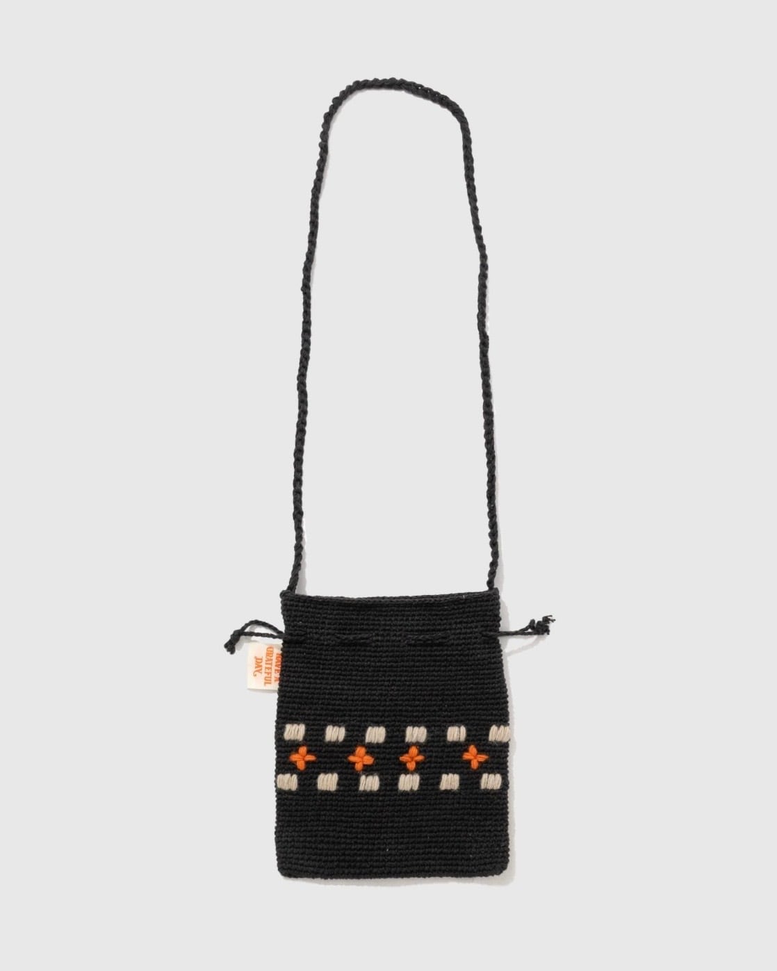 ハンドメイドで編み上げたクロシェポーチ。袋口を閉める紐とは別にショルダーストラップが付いた2ウェイタイプです。