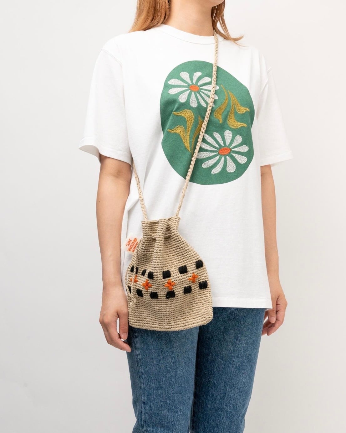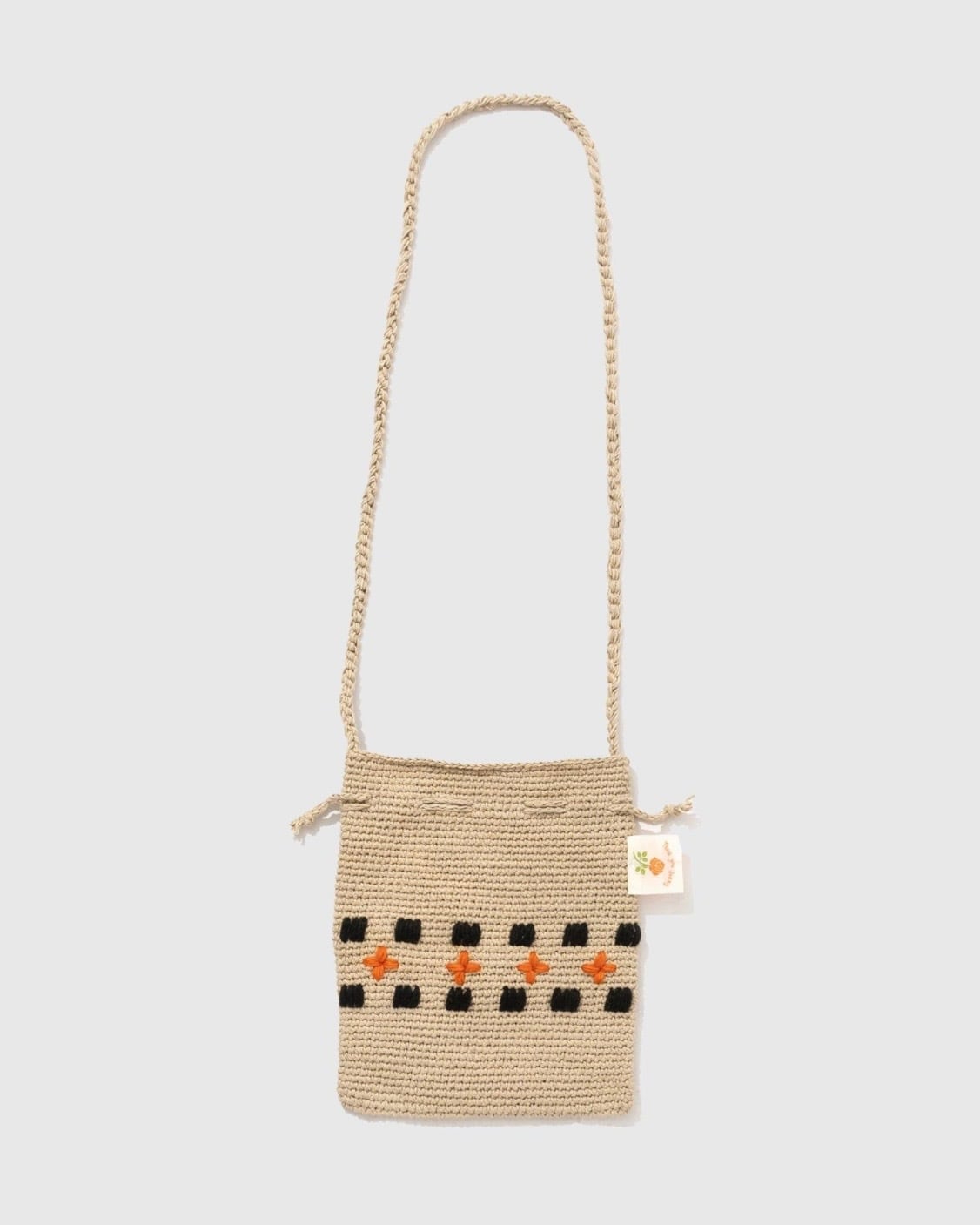 ハンドメイドで編み上げたクロシェポーチ。袋口を閉める紐とは別にショルダーストラップが付いた2ウェイタイプです。