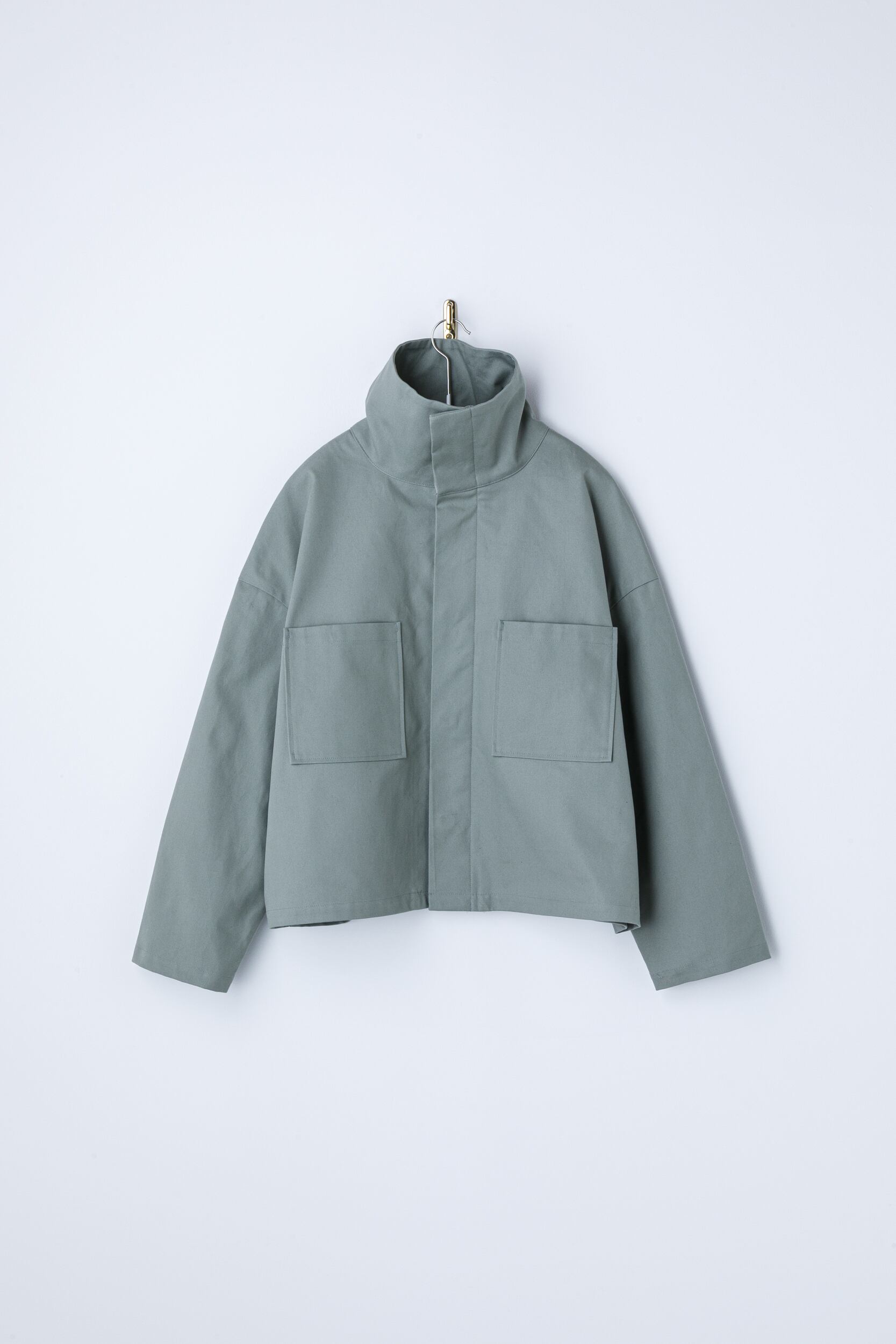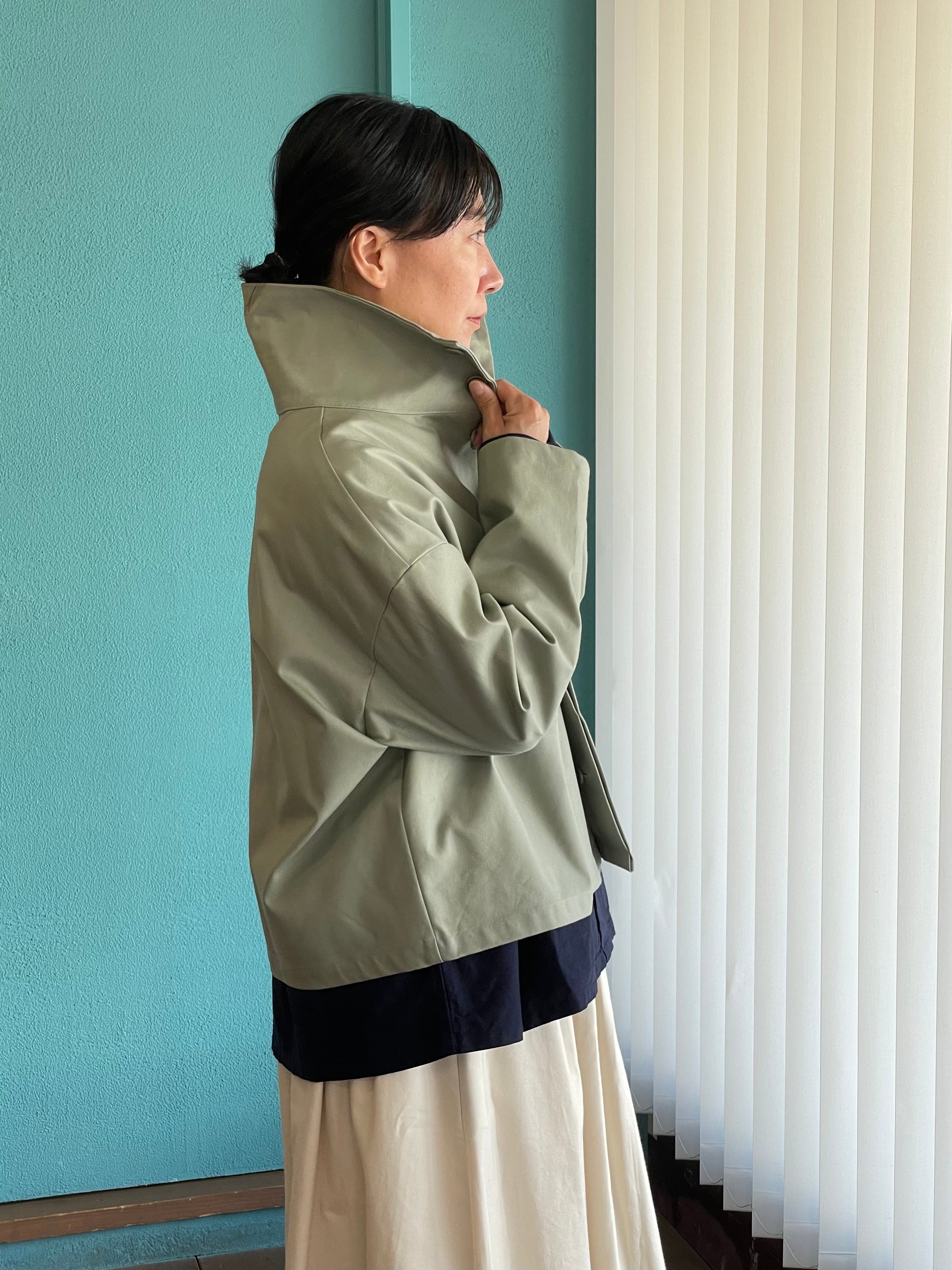 首元を包み込むような襟がアクセントのショートブルゾン。頑丈さとしなやかさを持ち合わせたミリタリー素材のジャーマンダックを使用。ミリタリー調の生地ですが、カジュアルになりすぎず程よいハリ感でシルエットが際立ち、洗練された雰囲気に。襟を寝かせればすっきりとした首周りに、立てればマフラーいらずの暖かさ。ゆったりとした身頃でもショート丈だからもたつかず、さまざまなボトムスとも相性抜群。