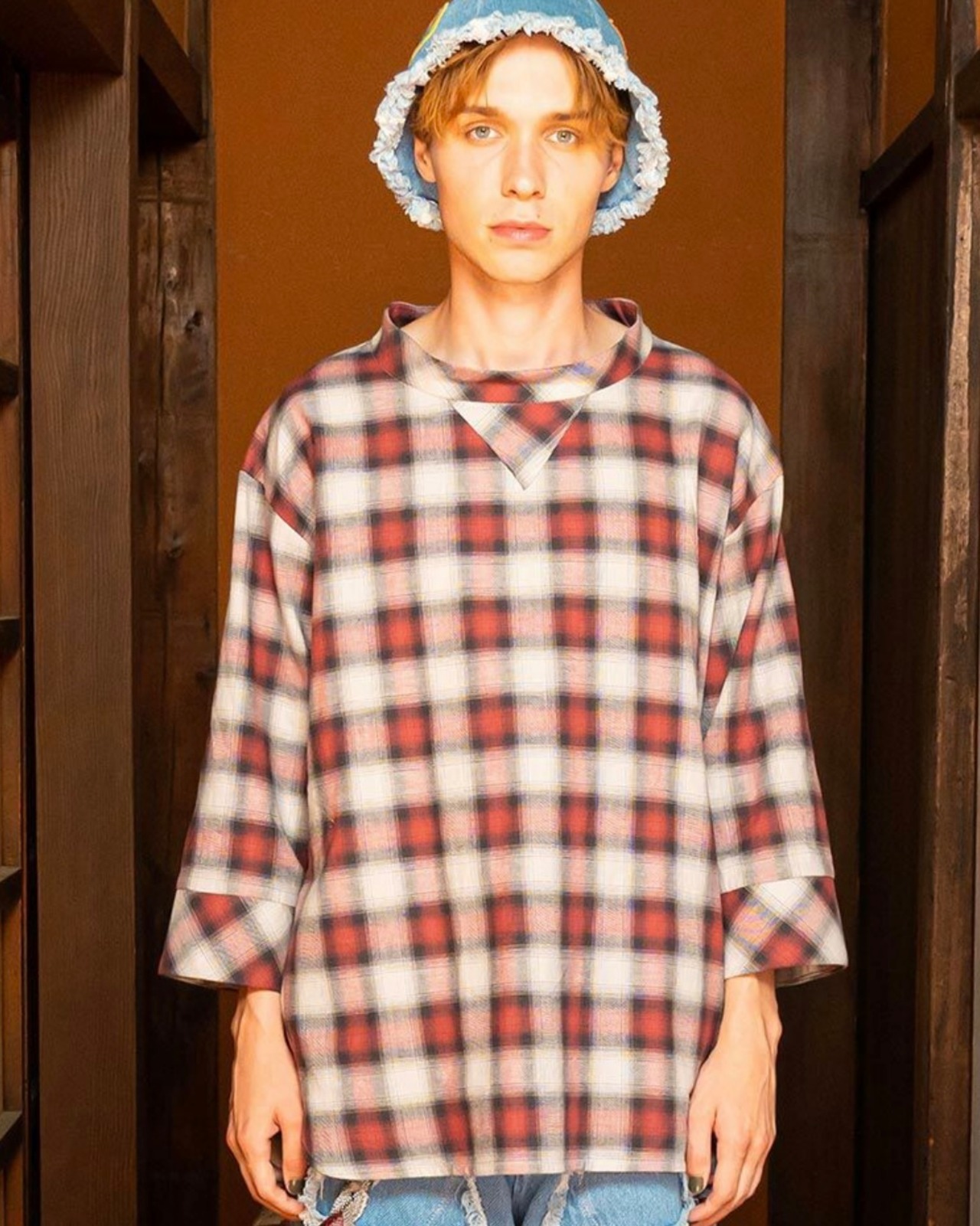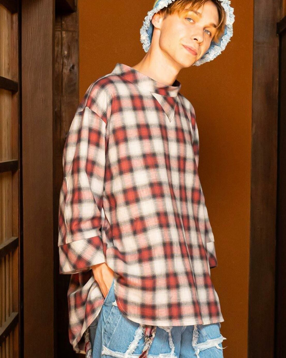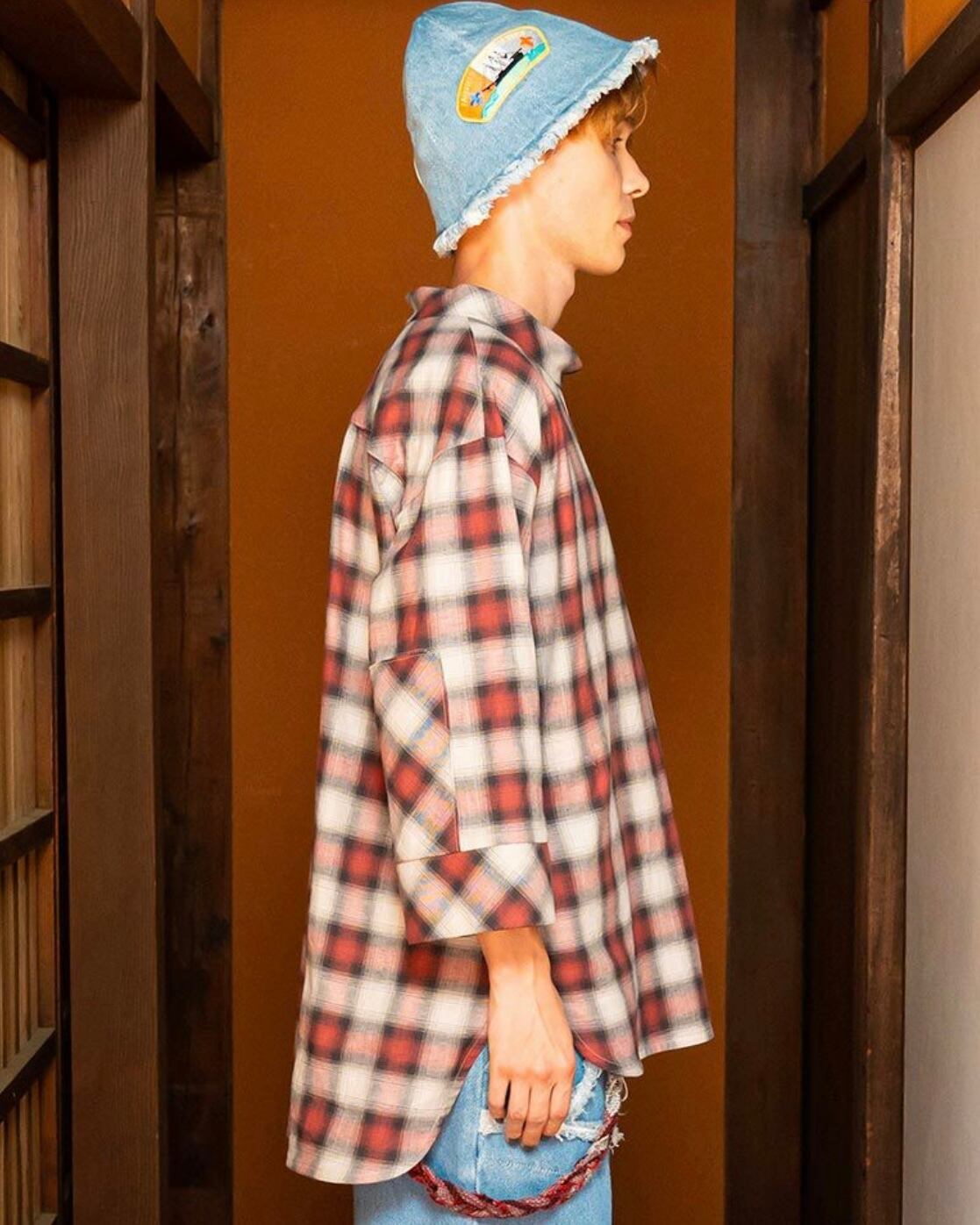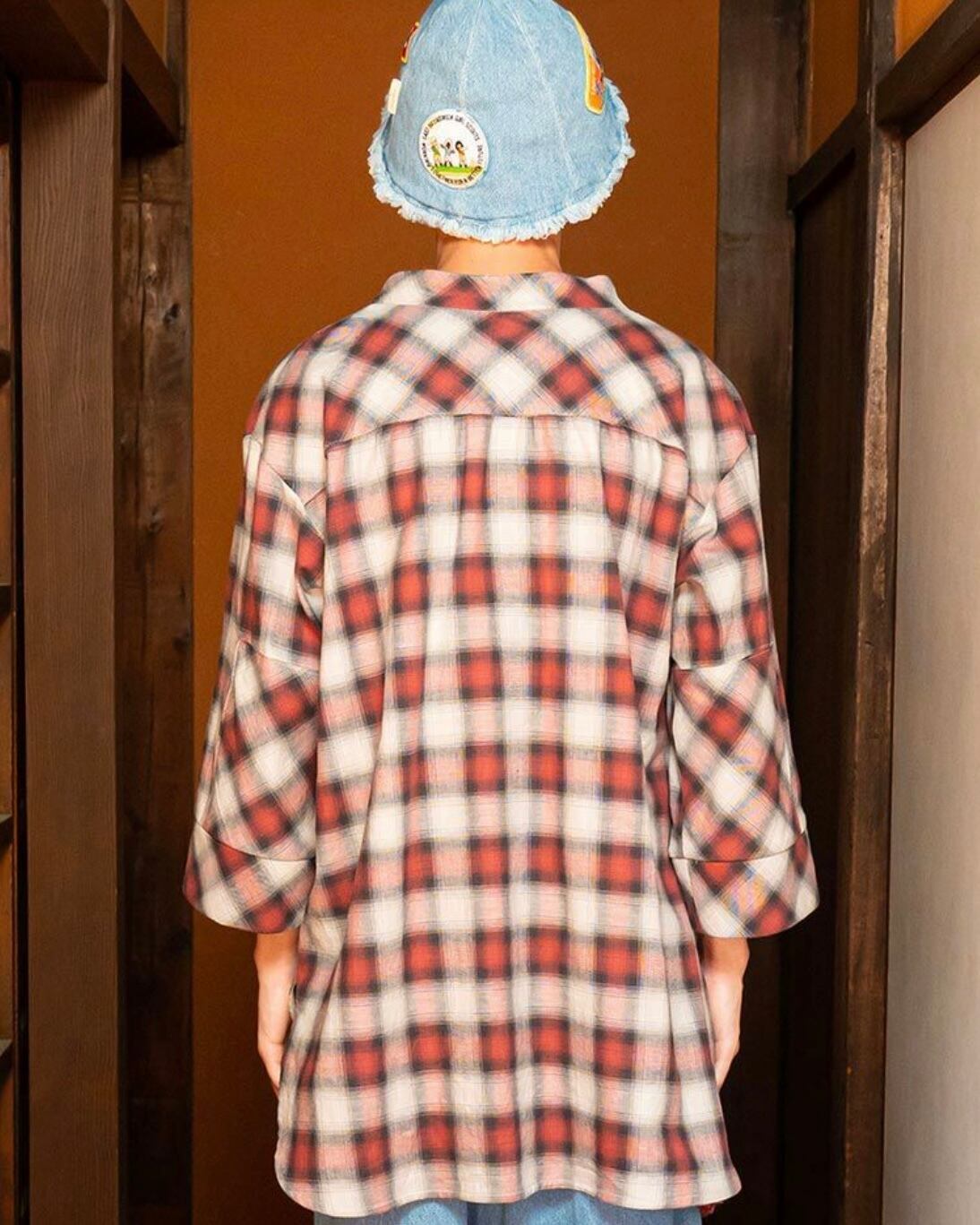 オンブレチェックで製作したフィッシャーマンシャツ。チェック柄の生地目の変化で見え方を変えたりシルエットも従来のフィッシャーマンのような野暮ったい感じではなく今っぽいオーバーサイズのオチ感の有るシルエットになってます。男女兼用、ユニセックスデザインです。