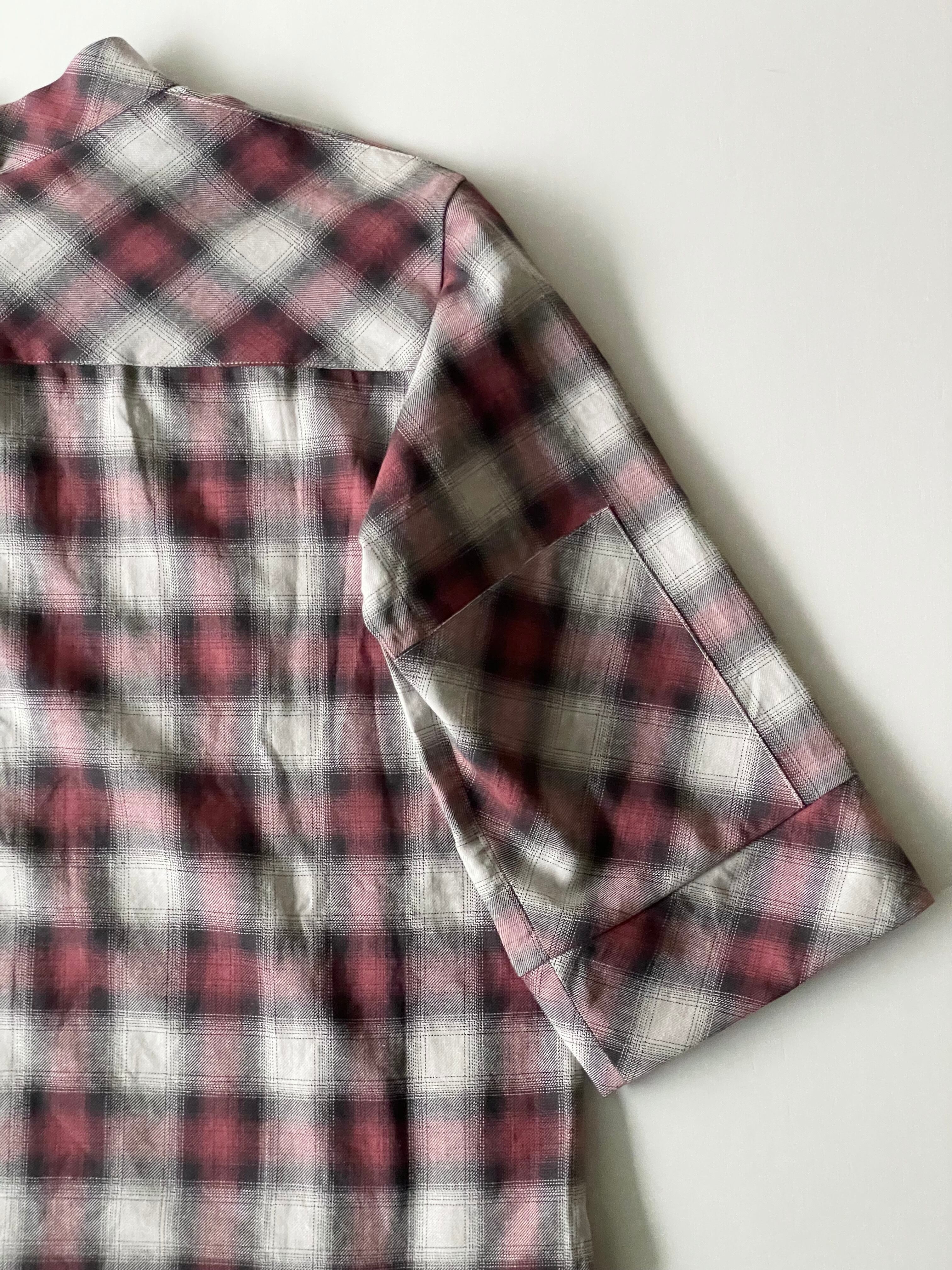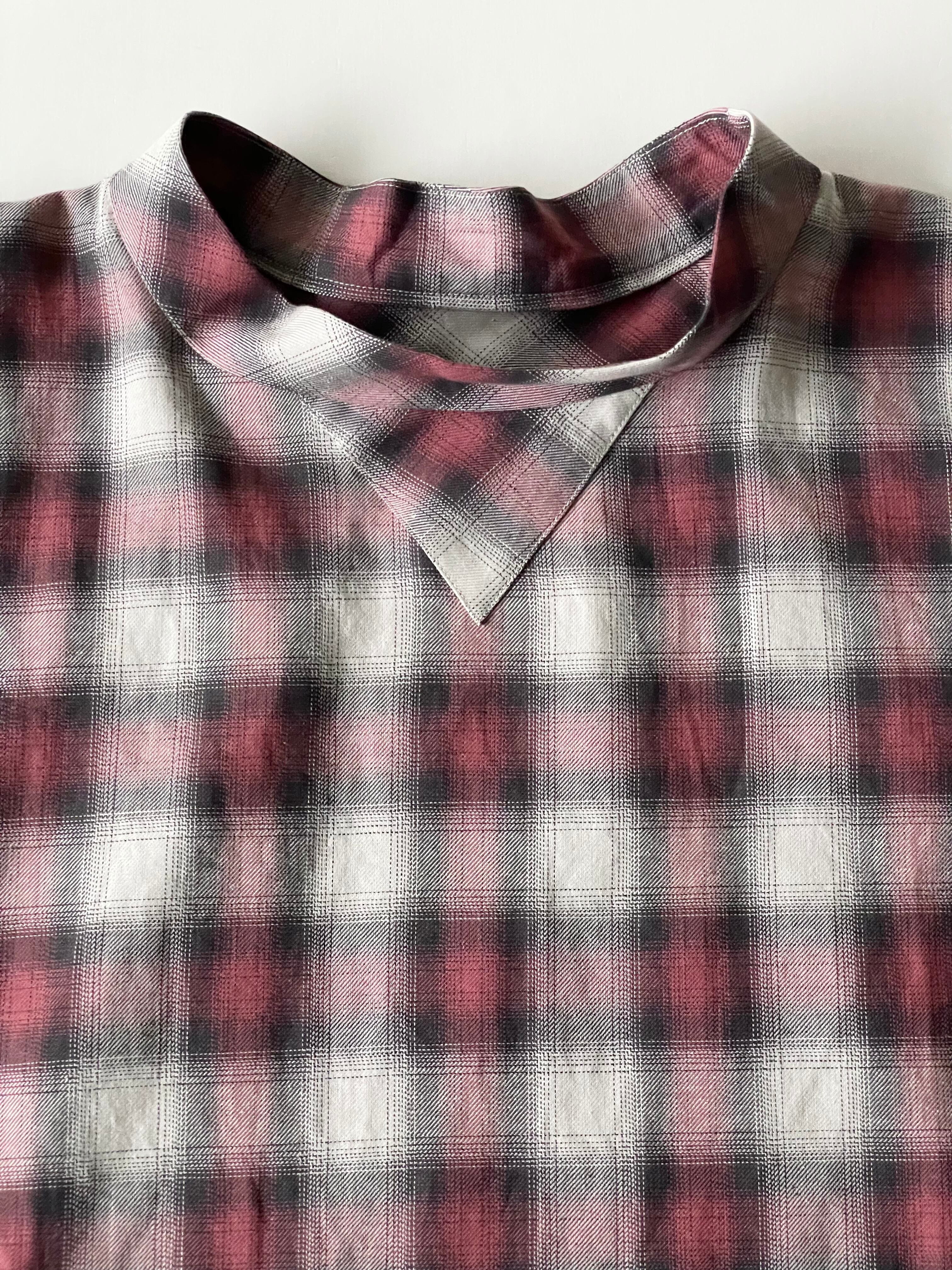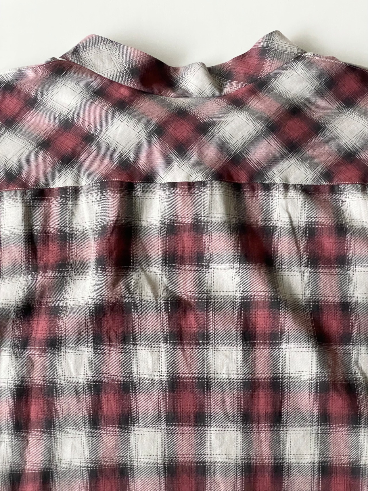 オンブレチェックで製作したフィッシャーマンシャツ。チェック柄の生地目の変化で見え方を変えたりシルエットも従来のフィッシャーマンのような野暮ったい感じではなく今っぽいオーバーサイズのオチ感の有るシルエットになってます。男女兼用、ユニセックスデザインです。