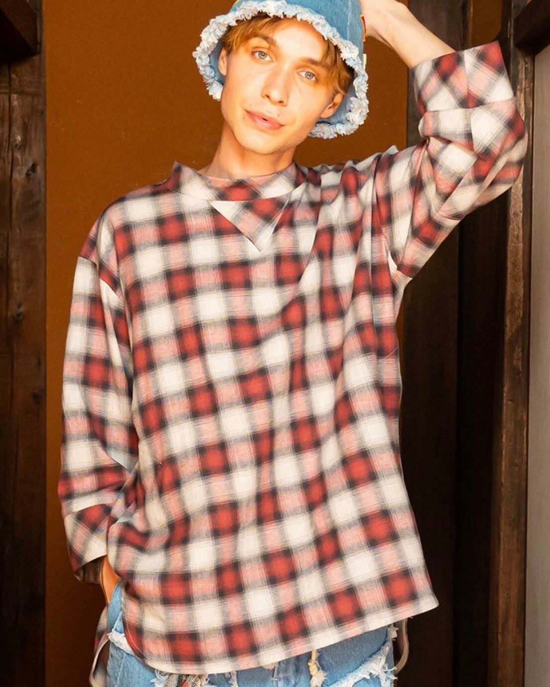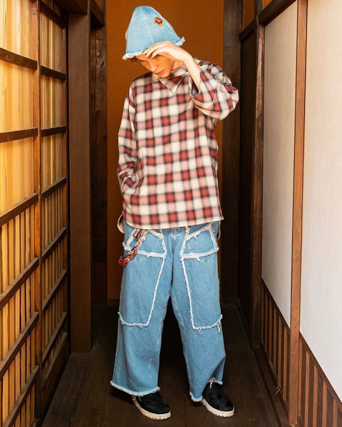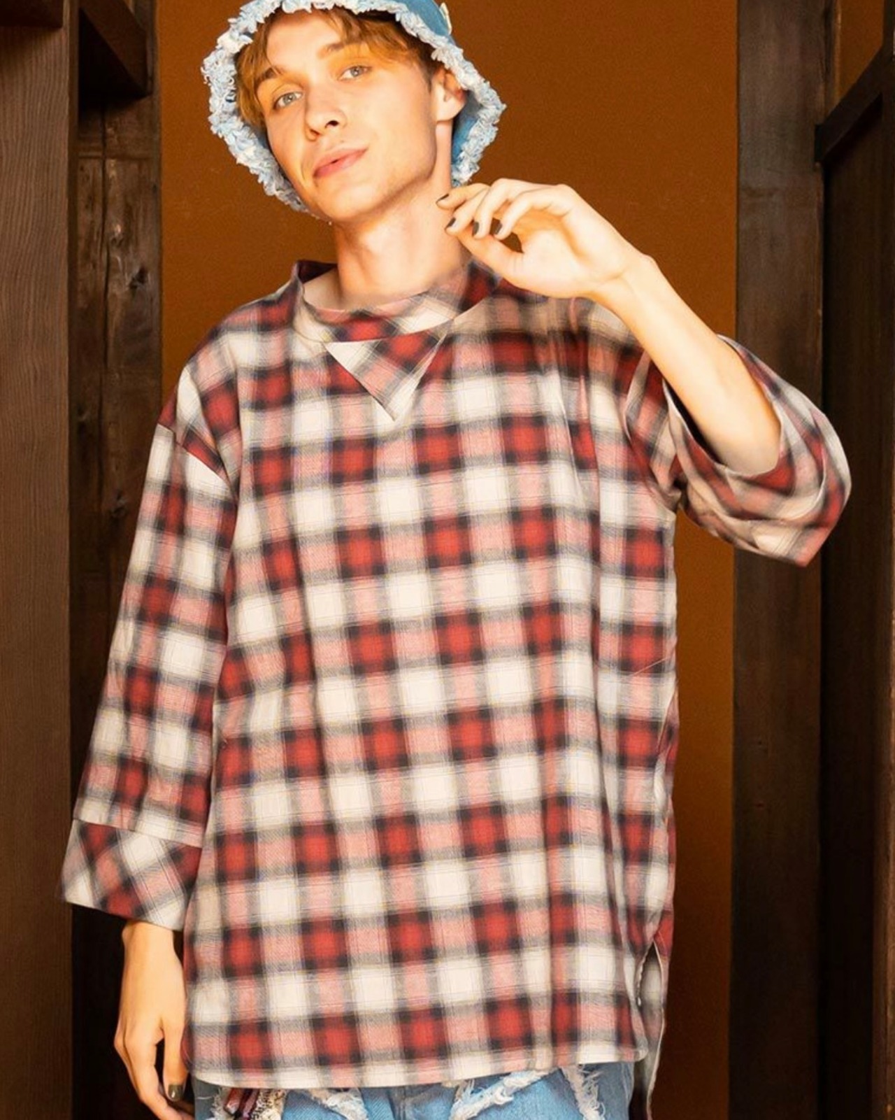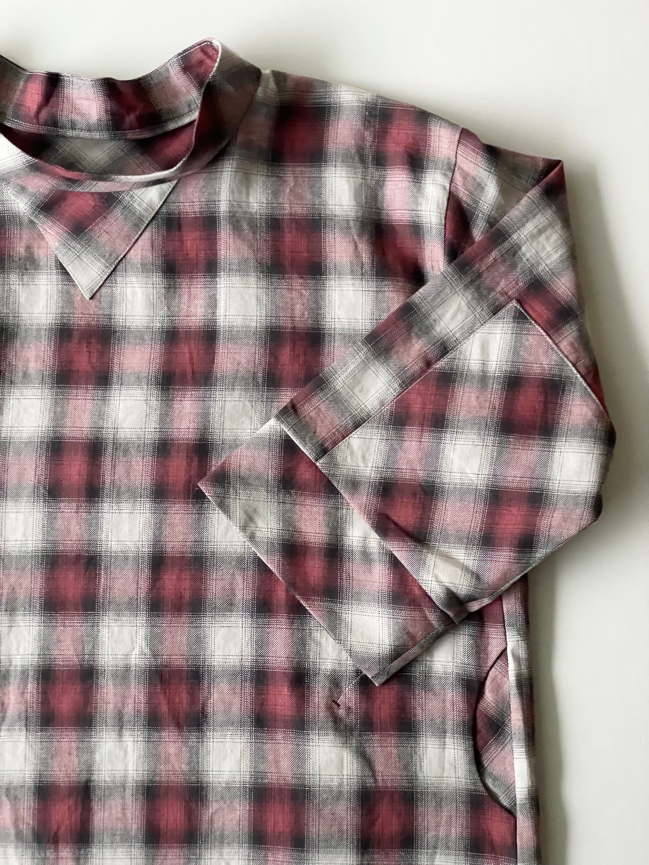 オンブレチェックで製作したフィッシャーマンシャツ。チェック柄の生地目の変化で見え方を変えたりシルエットも従来のフィッシャーマンのような野暮ったい感じではなく今っぽいオーバーサイズのオチ感の有るシルエットになってます。男女兼用、ユニセックスデザインです。