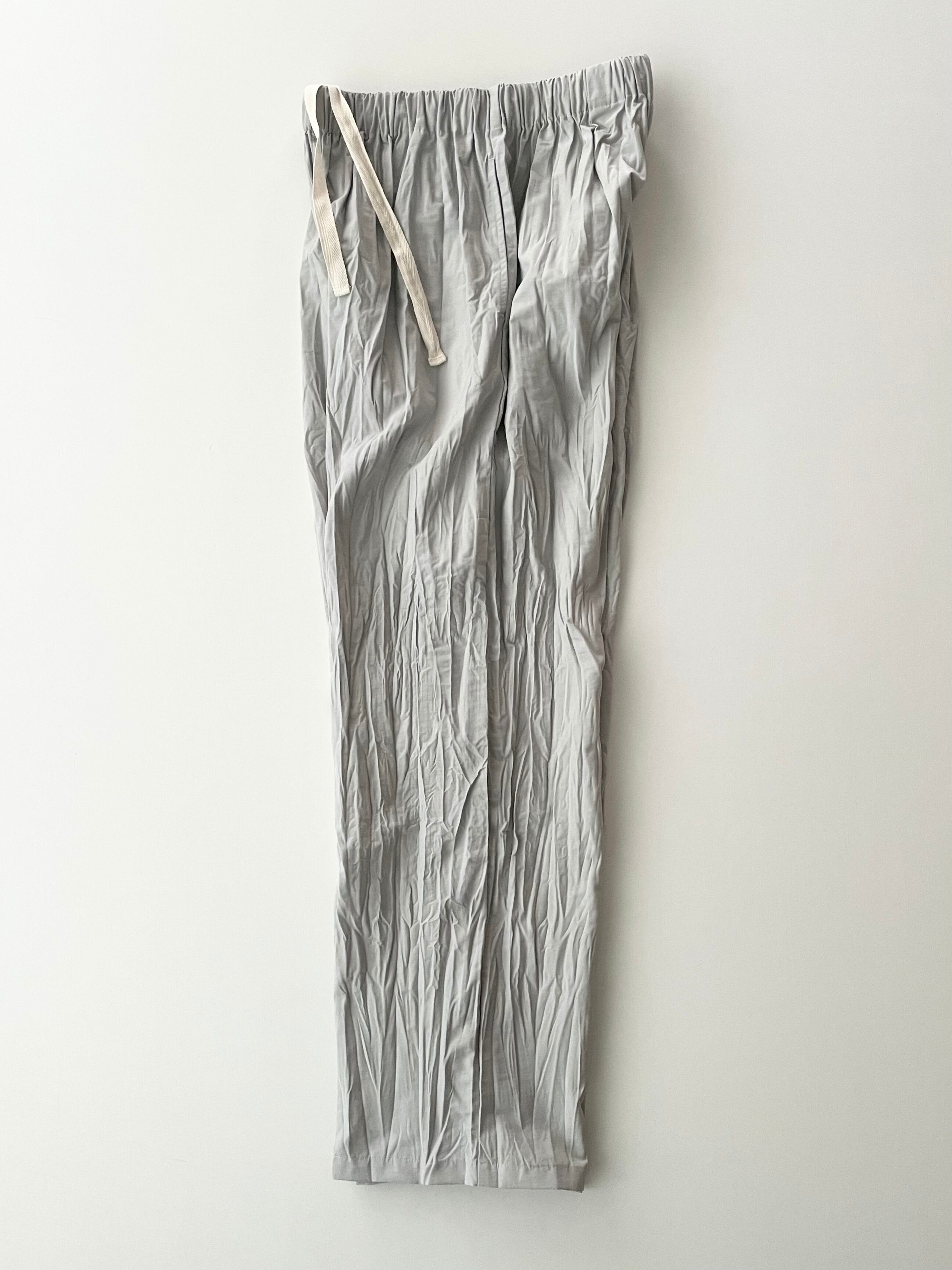 クリンクル加工を施した綿ポリのストレートパンツ。洗濯、乾燥後にねじってシワ具合を調整いただけます。表情のある加工なので、シンプルなトップスとも好相性です。両脇ポケット付き、デイリーにお使いいただけます。