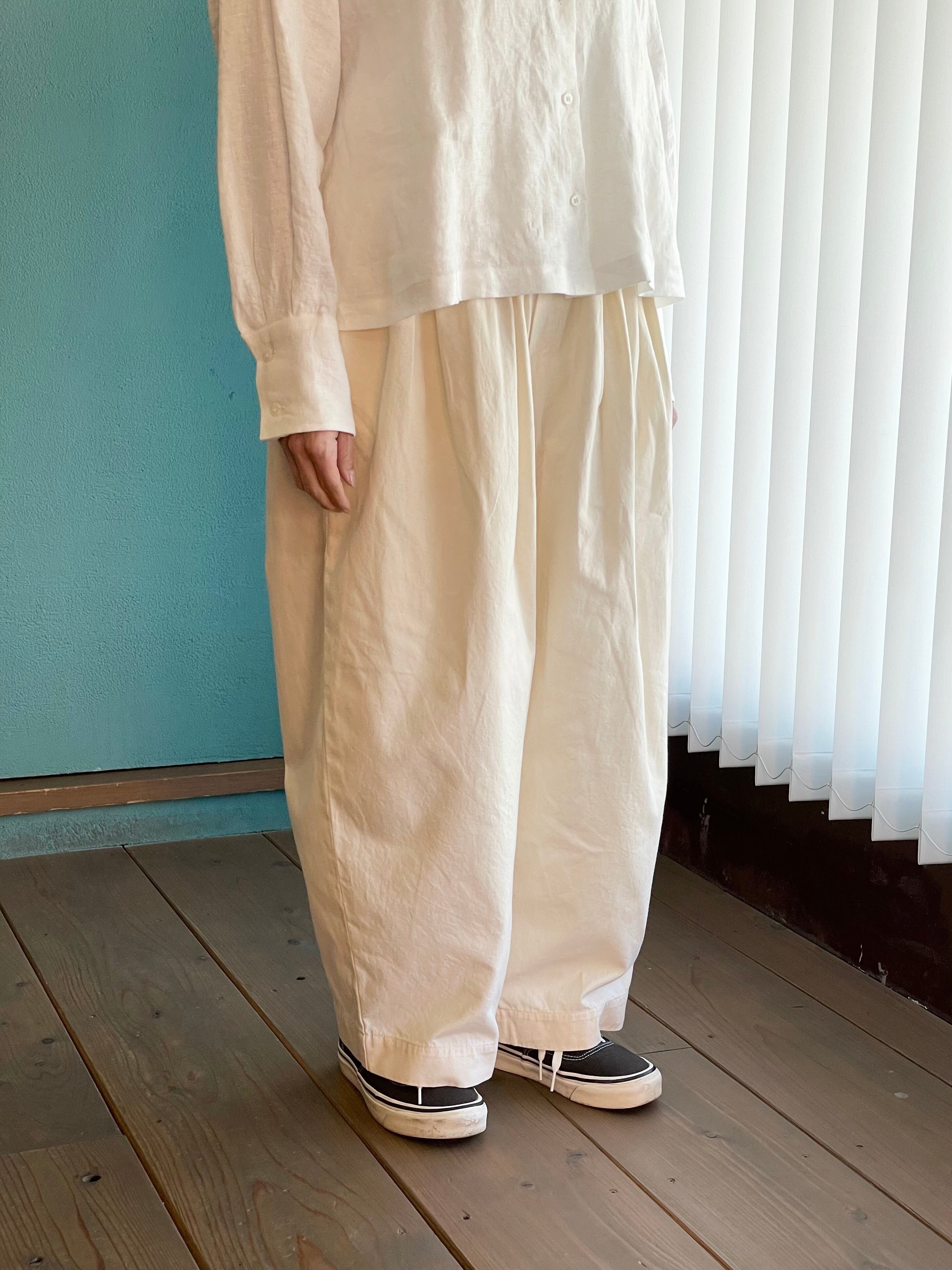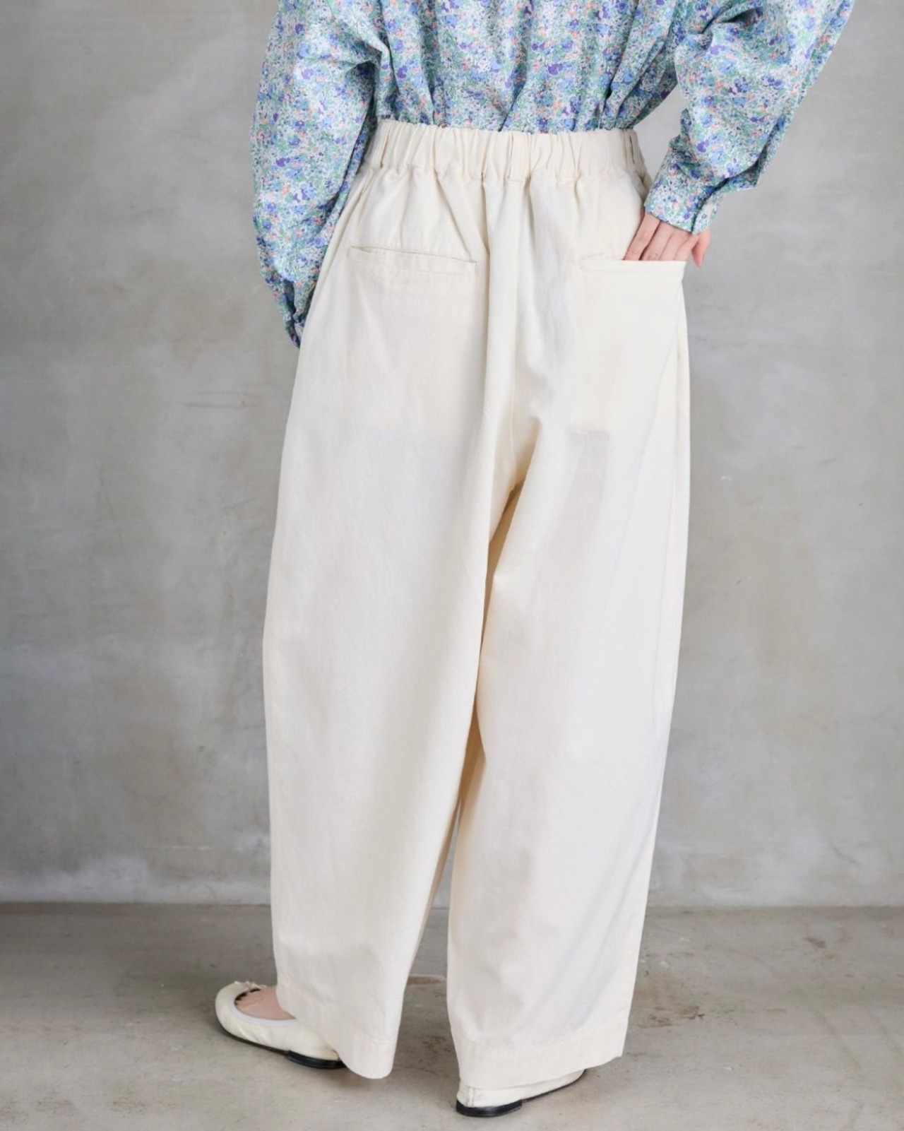 ボリュームのあるワイドパンツ。ワッシャー加工を施した60/2ツイル素材を使用。ワッシャーで加工感を出し、天日干しで洗いざらしのような自然な表情が魅力。ウエスト部分にタックを細かく入れることで膨らみのあるシルエットに。ウエストはゴム仕様で締め付け感も少なく、内側にはドローコードが付いているので、サイズ調整も可能。