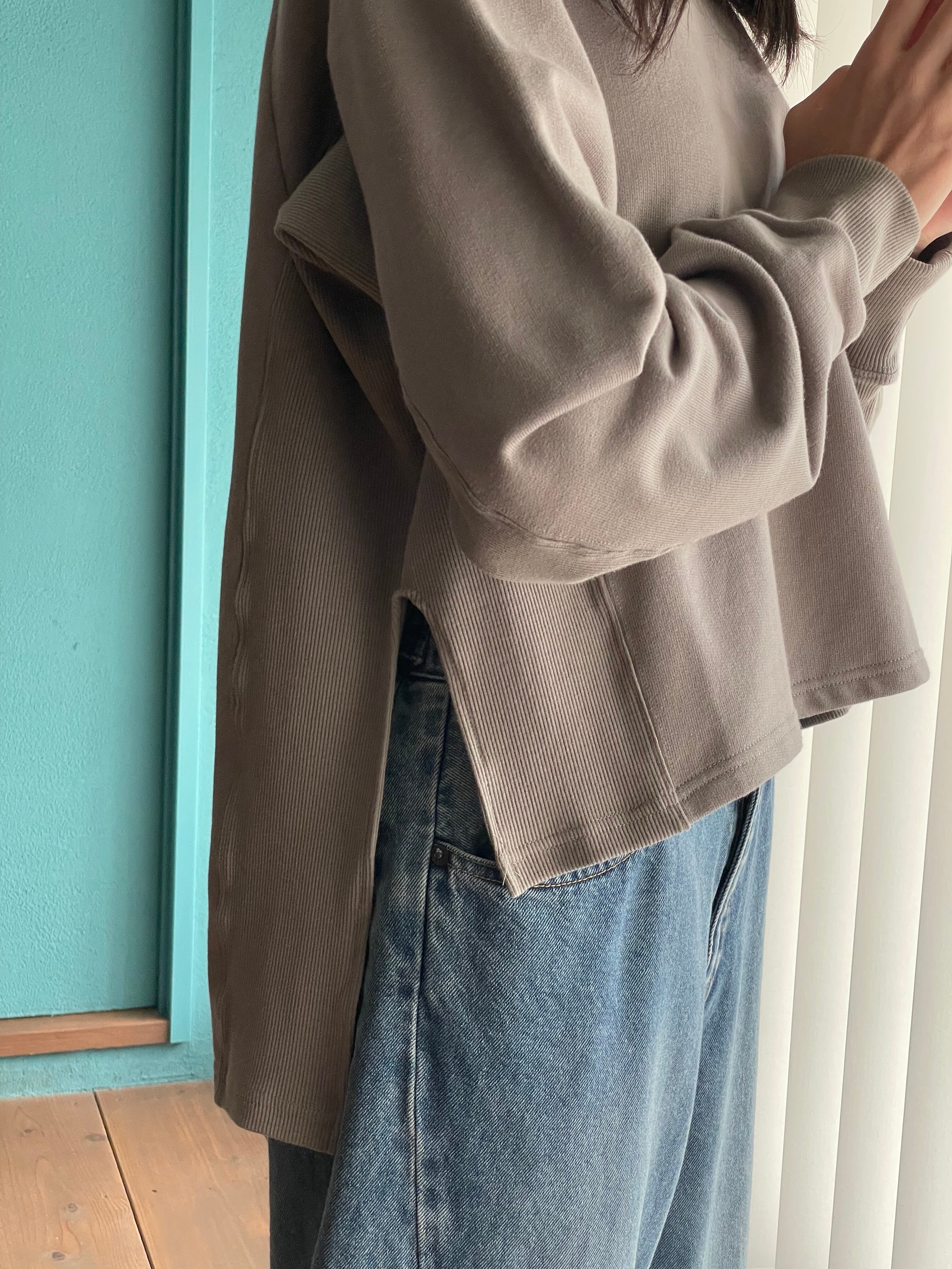 丈の長さに前後差がありサイドリブがアクセントのスウェット。程よくゆとりがあるサイズ感で、ラグランスリーブのデザインなので動きやすく、女性らしい柔らかい雰囲気に。サイドにスリットが入っているのでどんなボトムスとも相性抜群です。