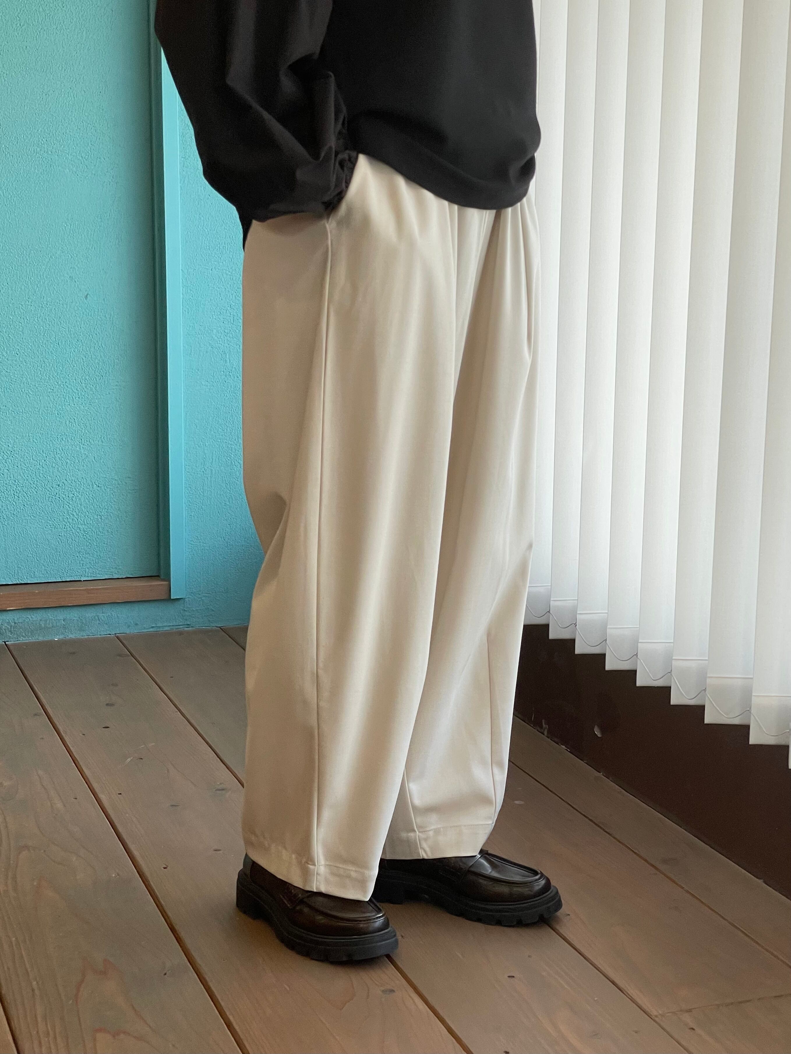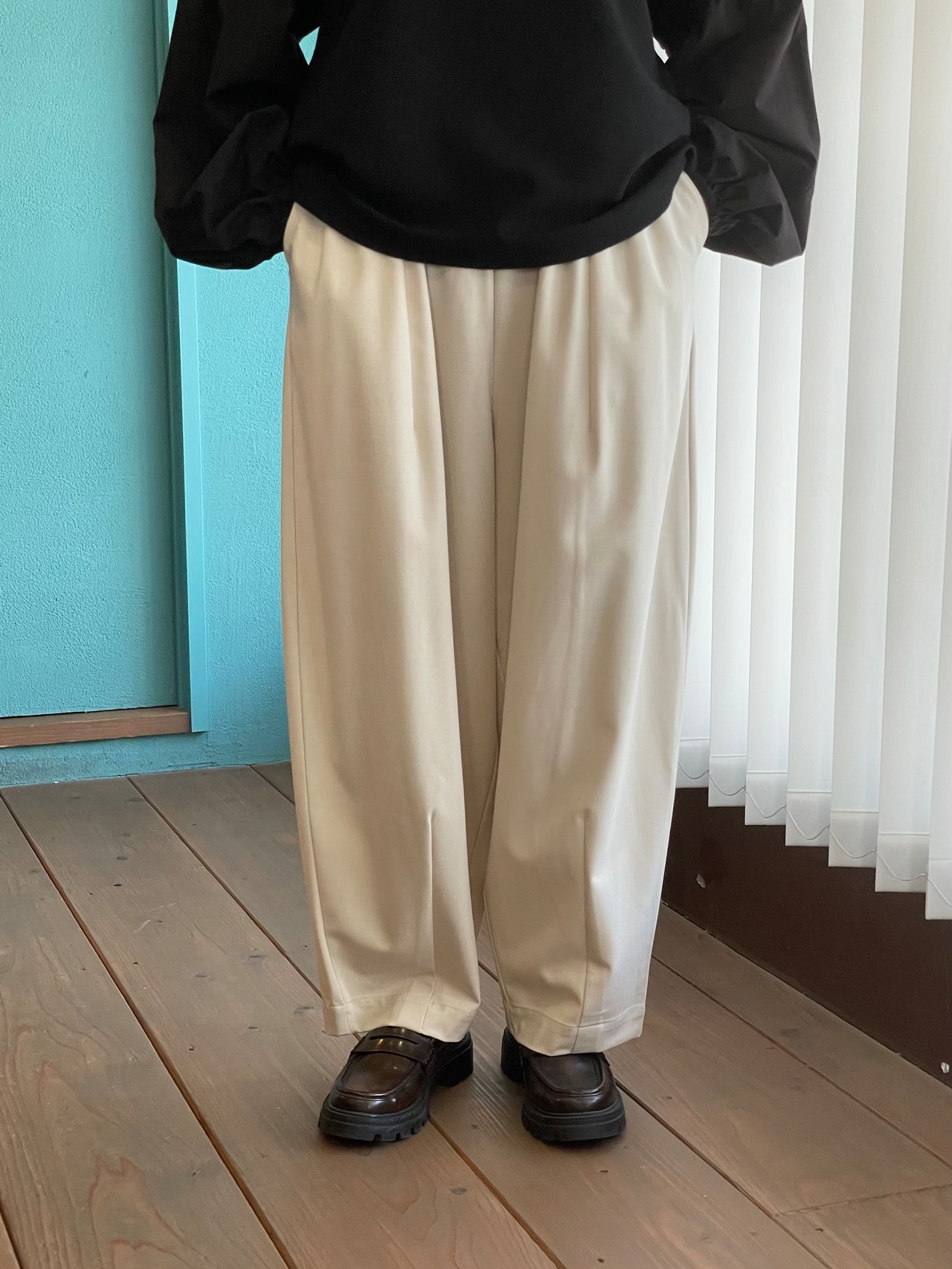 立体感のあるシルエットとイージー仕様が嬉しいボリュームワイドパンツ。前後の裾ダーツが分量感のあるシルエットを引き締めてくれて、ルーズにならず格好いい着こなしに。キレイ見えする生地なのでカジュアル過ぎない大人な雰囲気もあります。