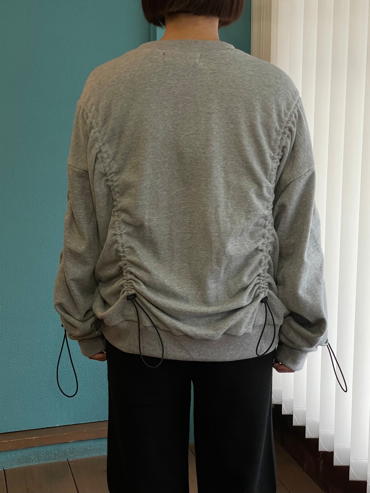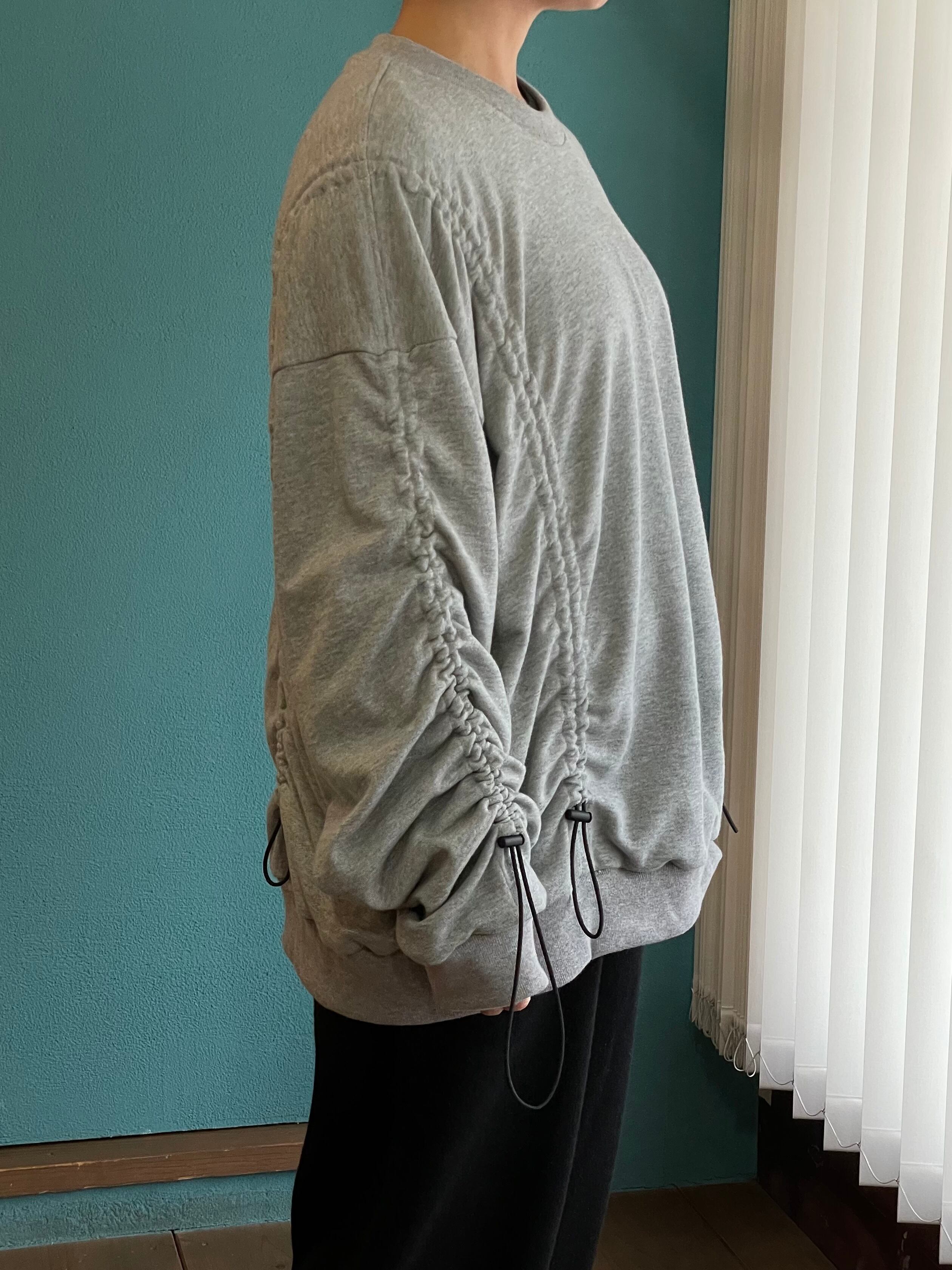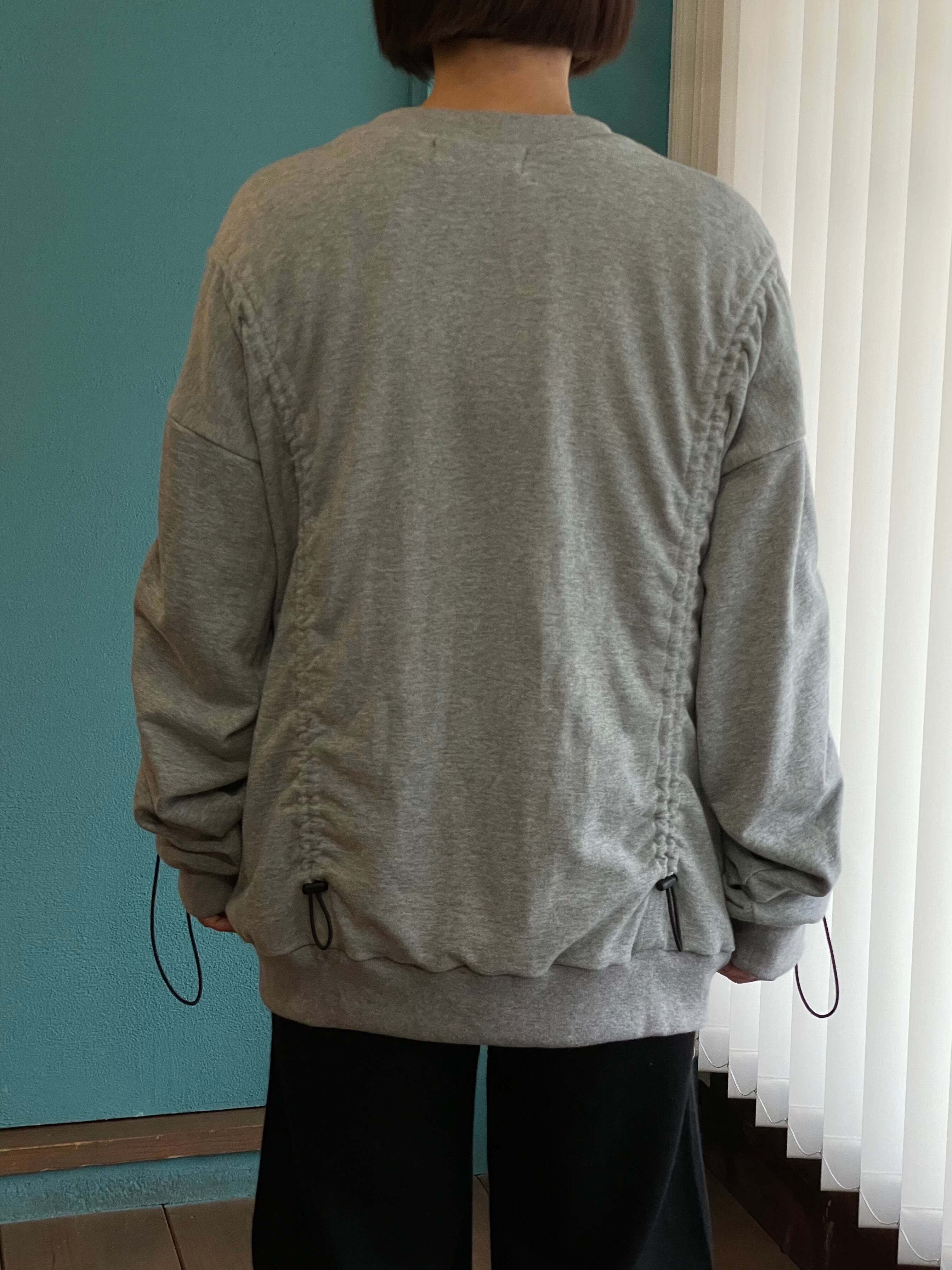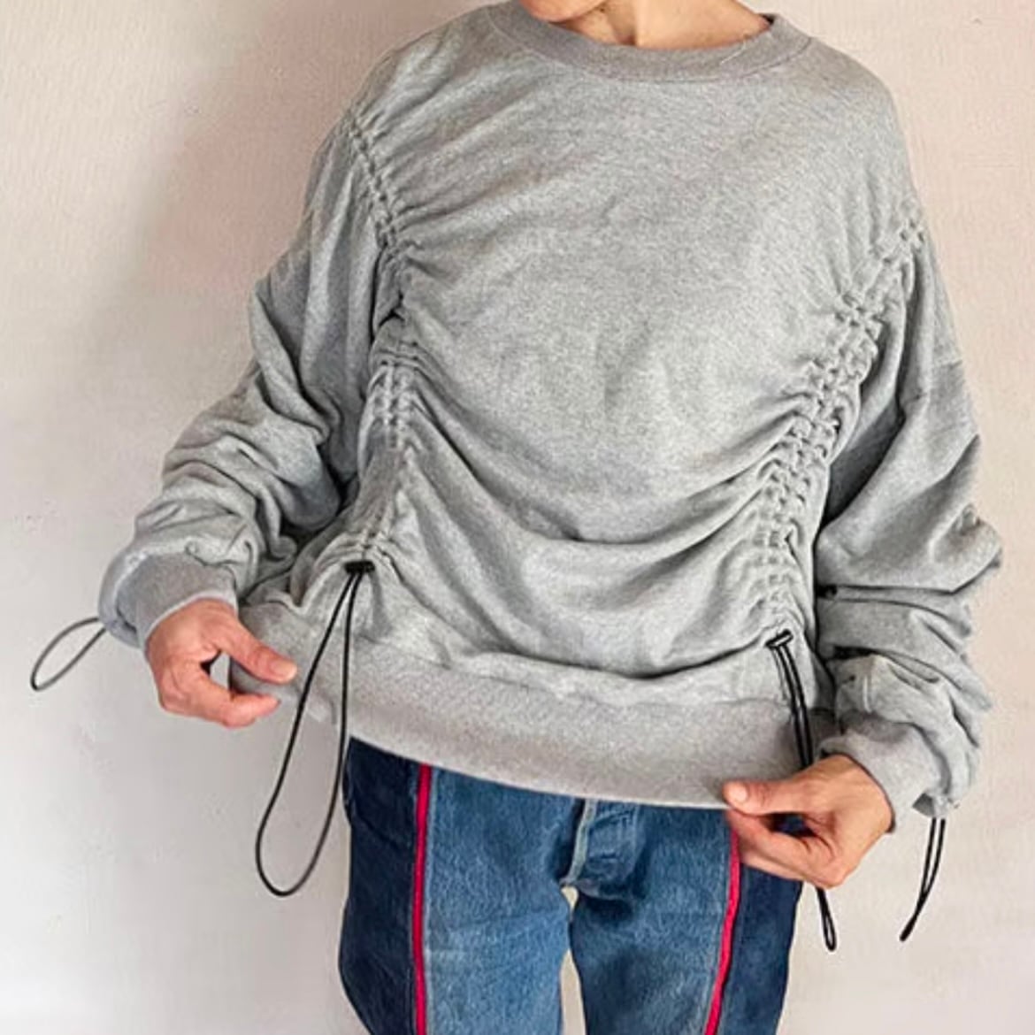 着丈約72cm(後ろ中心)、身幅約67cmのビックサイズのボディに、身頃や袖にドローコードを巡らせ、好みの長さに伸縮させることによってジェンダーや体格差を問わず着用することを可能にしたトップスです。