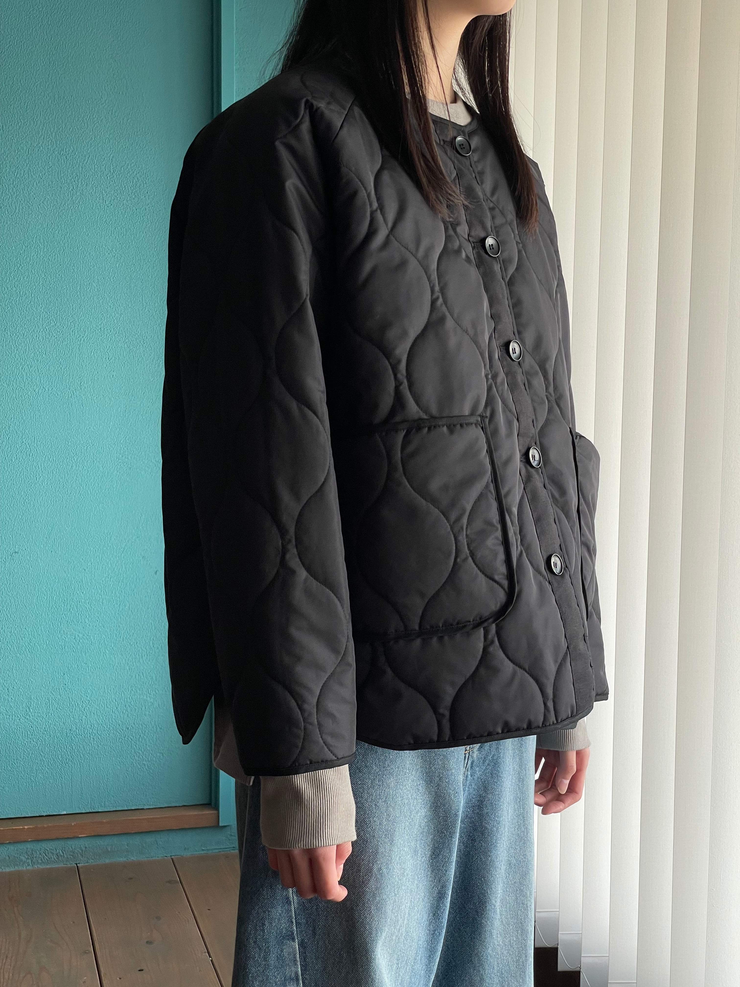 中綿入りのキルティングジャケット。肩のラインがラグランスリーブでキレイ目にみえます。前丈はややすっきりと、後ろ丈はヒップにかかる程度の前後差で裾はラウンドカットになっていて、柔らかな女性らしい雰囲気に。カジュアルにもきれいめにも合わせていただけます。
